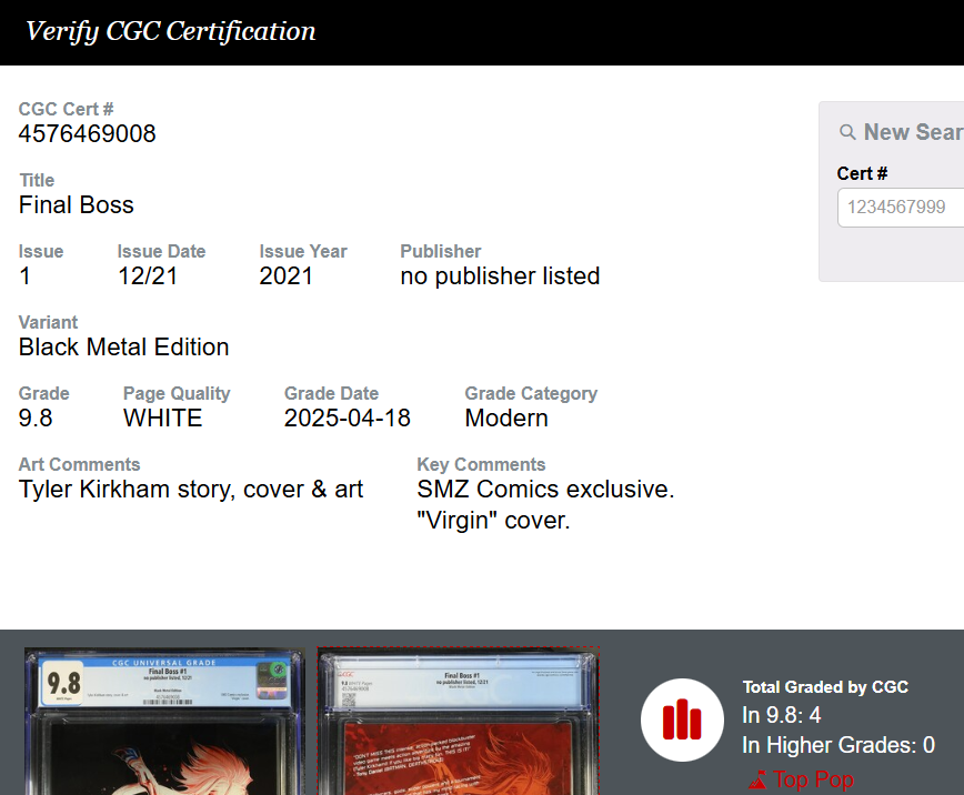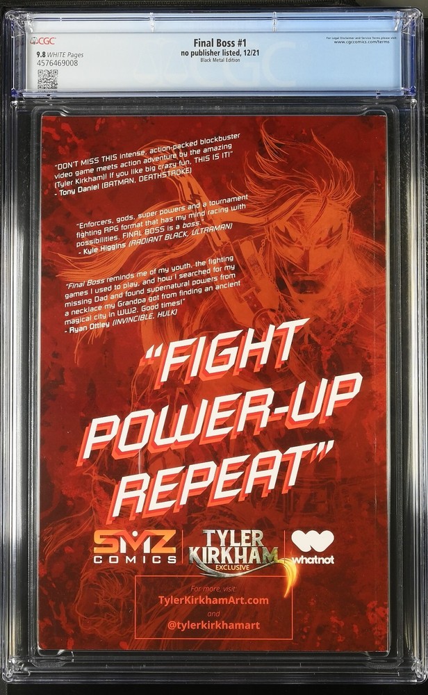 The product is a limited edition comic book titled "Final Boss #1" by artist/writer Tyler Kirkham. It is a US Comics tradition with a certification number of 4576469008 by Certified Guaranty Company (CGC). The comic features the character "Final Boss" in near mint/mint condition, making it a highly collectible item for comic book enthusiasts. This VIP Las Vegas party release is a rare find, with only 100 copies available for collectors to enjoy the unique story and artwork by Tyler Kirkham.