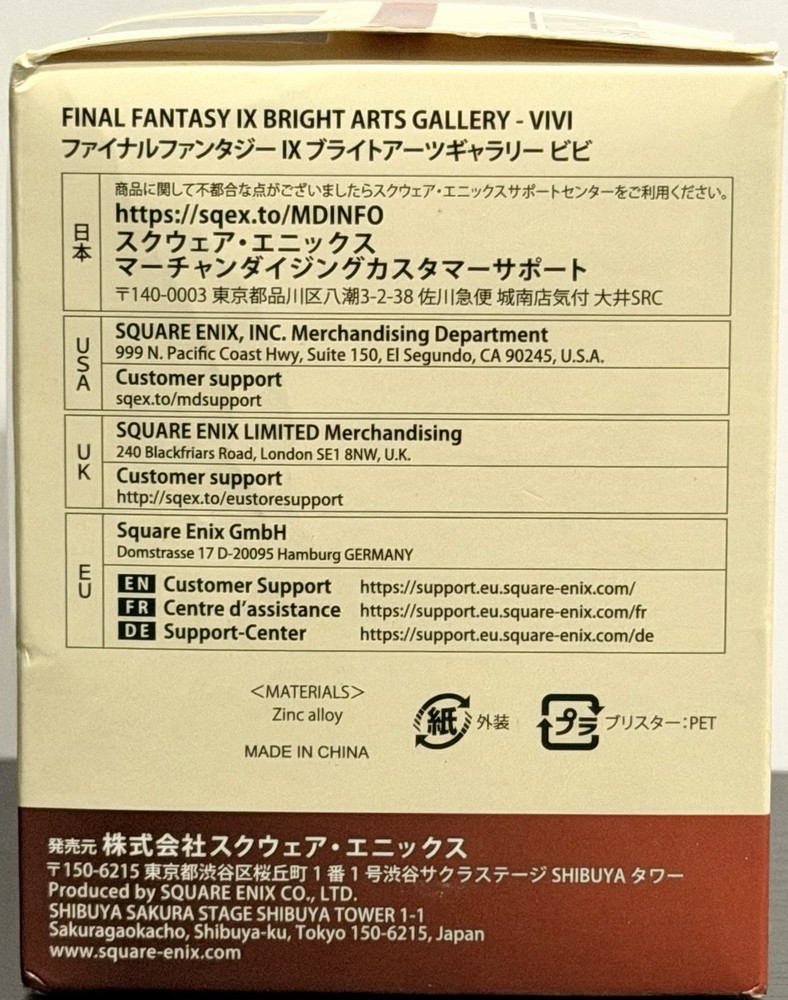 The product is a figurine of the character Vivi from the Final Fantasy IX video game, produced by Square Enix. The figurine comes in a boxed packaging, making it a complete collectible piece for fans of the Final Fantasy franchise. The brand's reputation for quality and attention to detail is evident in this new and sealed item, ensuring that it will be a prized addition to any collector's display.