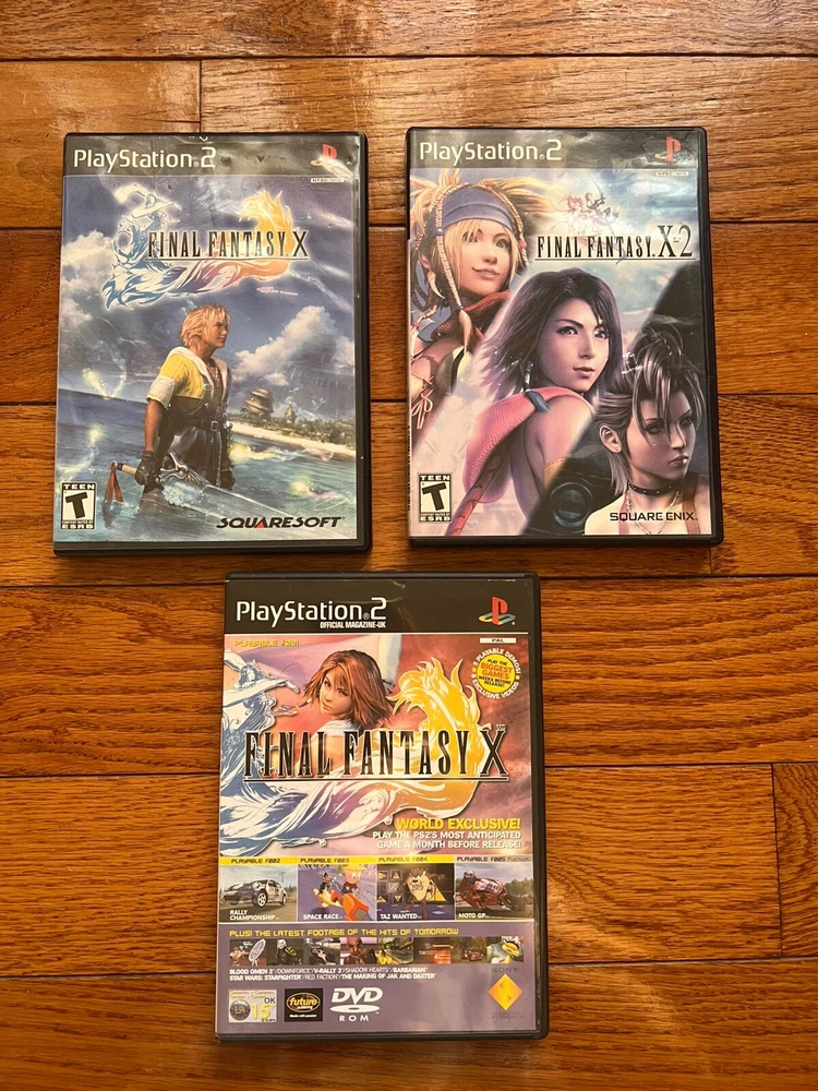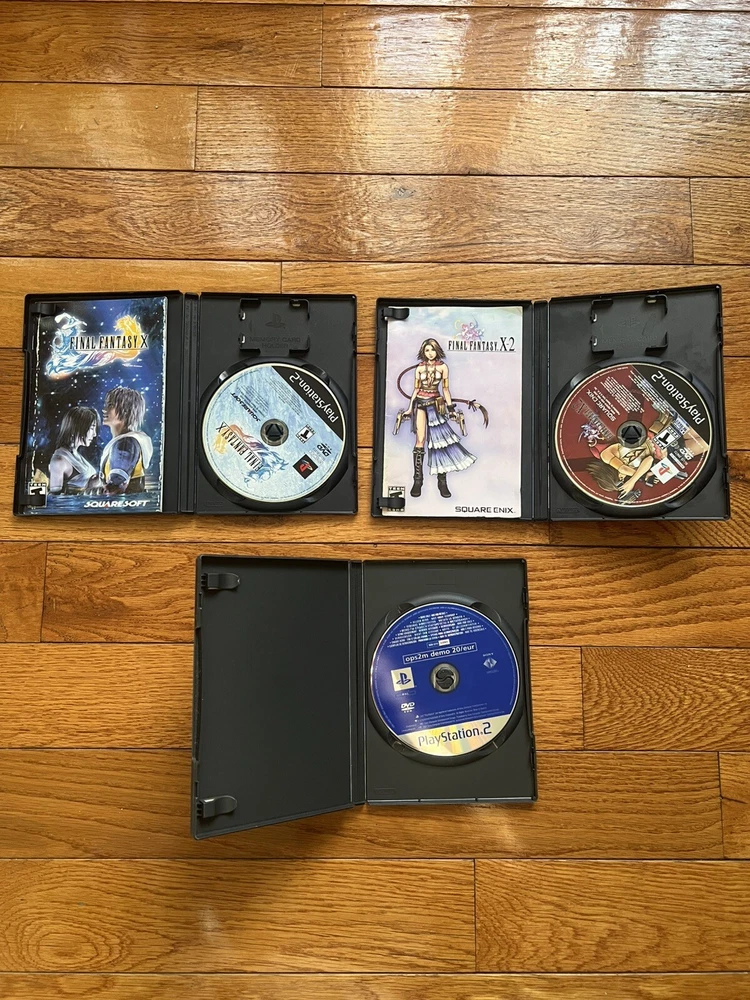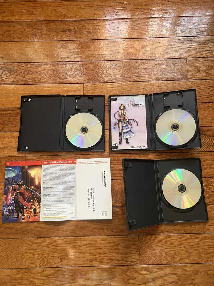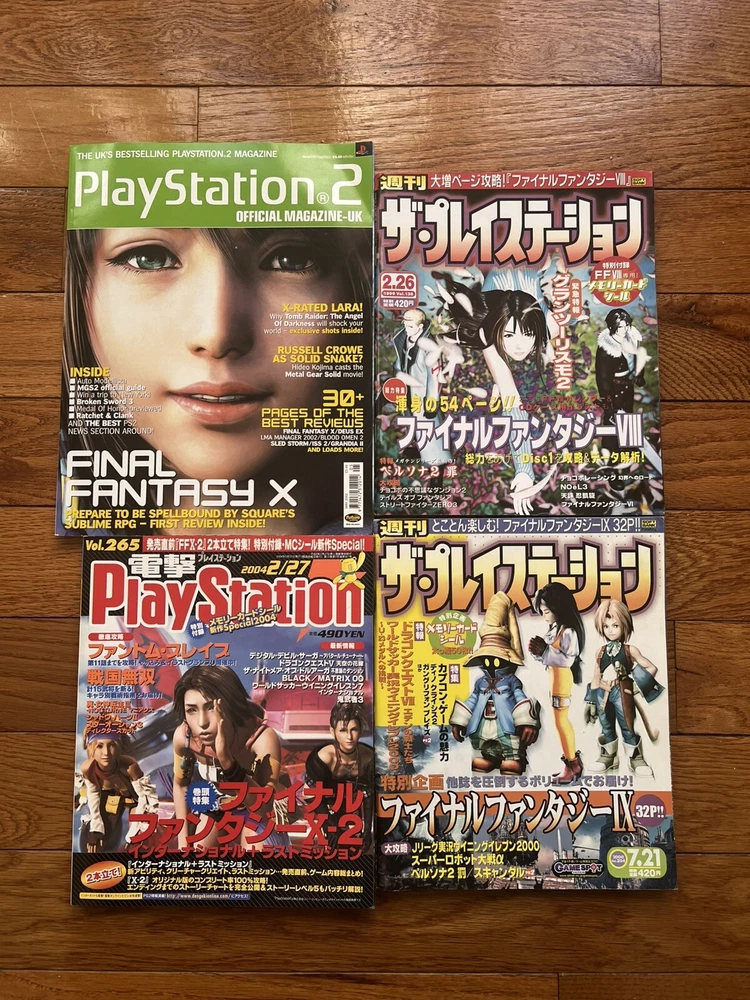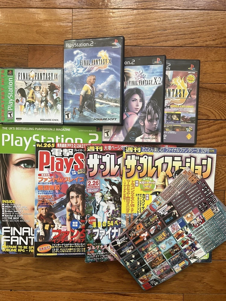 Final Fantasy Lot that features the following: - Final Fantasy IX (PS1) [Greatest Hits] - Final Fantasy X (PS2)- Final Fantasy X-2 (PS2) - Demo disc from PlayStation 2 Official Magazine-UK - PlayStation 2 Official Magazine-UK issue 020 May 2002 - Dengeki (電撃) PlayStation Vol. 265 - Weekly PlayStation (週刊 ザ・プレイステーション) vol. 138 - Weekly PlayStation (週刊 ザ・プレイステーション) vol. 204 - Two Sheets of PlayStation memory card stickers FFIX is in very good condition - it is pretty much new only the first disc has been used. The discs and manual are in very good condition. FFX has recognizable water damage on the cover art and slight water damage on the manual. The disc has some wear on it but has been tested to work. The manual does come with the reg. card. FFX-2 cover art and manual are in good condition but there is some sticker residue on the top right corner of the case. Disc is in fine condition and has been tested to startup on a PS2. The demo disc's case, cover art, and condition is very good, but has not been tested because I do not own a PAL PS2. PlayStation 2 Official Magazine-UK is in good condition. Dengeki PlayStation vol. 265 primarily features Final Fantasy X-2 and does not come with the appendix. The magazine is in very good condition. Weekly PlayStation vol. 138 primarily features Final Fantasy VIII and does not come with the appendix. The magazine is in very good condition. Weekly PlayStation vol. 204 primarily features Final Fantasy IX and does not come with the appendix. The magazine is in very good condition. I've also included two PS2 memory card sticker sheets, featuring stickers for iconic games like FFIX, Persona 2, Slap Happy Rhythm Busters, MegaMan Legends 2, Orphen and more! These stickers can only be obtained from these magazines and are quite rare and hard to come by! If you have any more questions or would like more pictures, please feel free to ask! Thank you very much for looking!