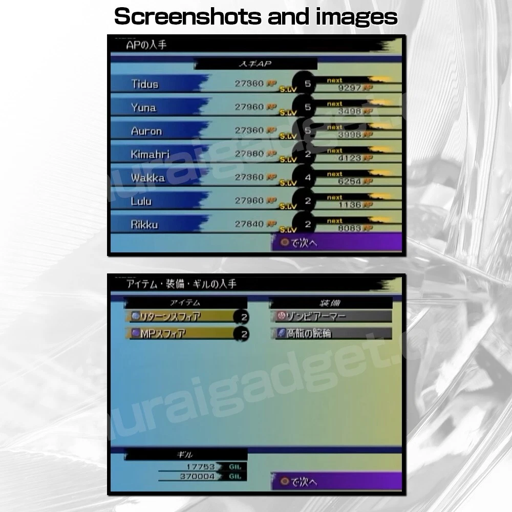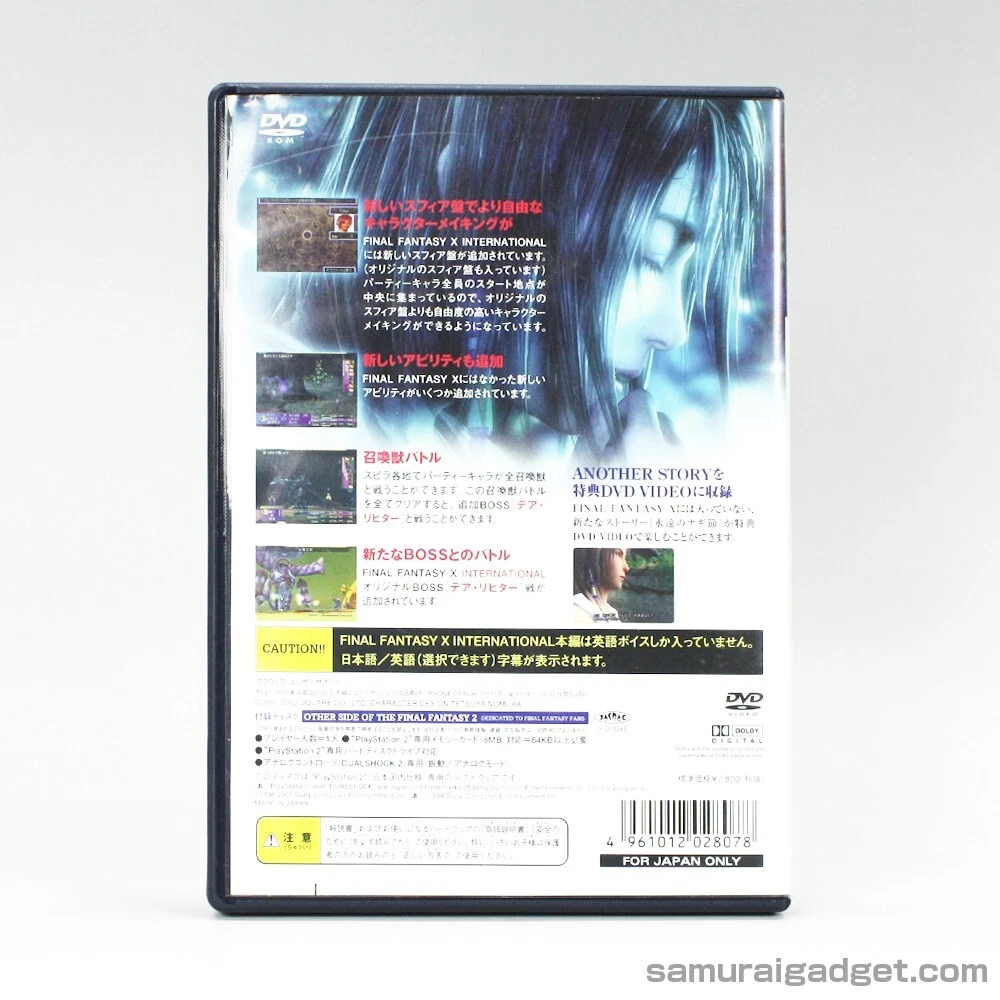 Final Fantasy X(10) International - Japanese Version - ※Region Code:NTSC-J (Japan) Description ■Product Features ・The game is a Japanese adaptation of the North American version of Final Fantasy X (10). ・All audio during the game is in English. ・You can choose subtitles in Japanese and English. ・The package includes The Other Side of Final Fantasy 2, a DVD containing the story after the ending. ■Product status:Very Good ■Product content (1)Original Package (2)Manual (3)Game Disc Payment Buyers accept a variety of payment methods including credit and debit cards, Apple Pay, Google Pay and PayPal. Shipping Shipping is Economy and Expedited and Standard. ■Economy Shipping:Free Shipping ■Expedited and Standard Shipping:FedEx or EMS and Yamato Japan(There is an extra charge.) ※Depending on the shipping area, only Economy Shipping is available. Notice ■The language of the game is Japanese. ■Platform:PlayStation 2 ■PlayStation 2 is not included. ■The region code for this game is Japan. International Buyers - Please Note: Import duties, taxes, and charges are not included in the item price or shipping cost. These charges are the buyer's responsibility. Please check with your country's customs office to determine what these additional costs will be prior to bidding or buying. If the cancellation is due to the buyer,we will charge a PayPal fee. If there is a remote charge for your address,we will charge you for additional shipping. Thank you for your understanding.