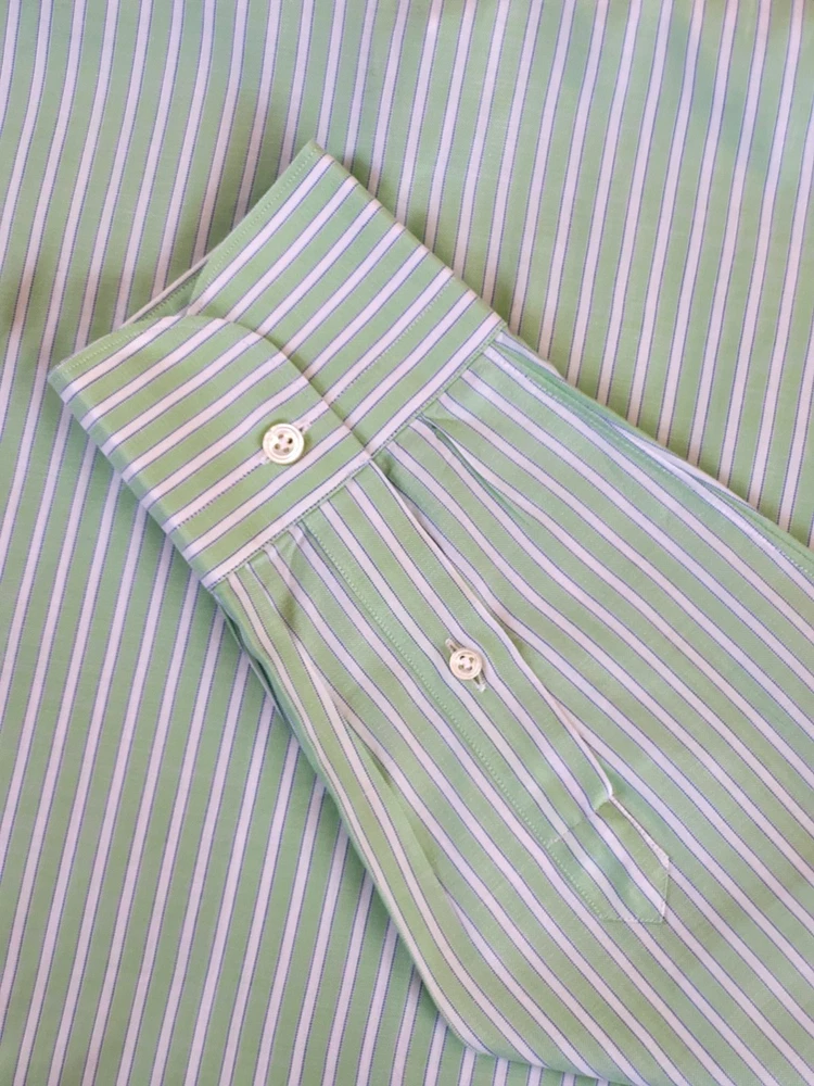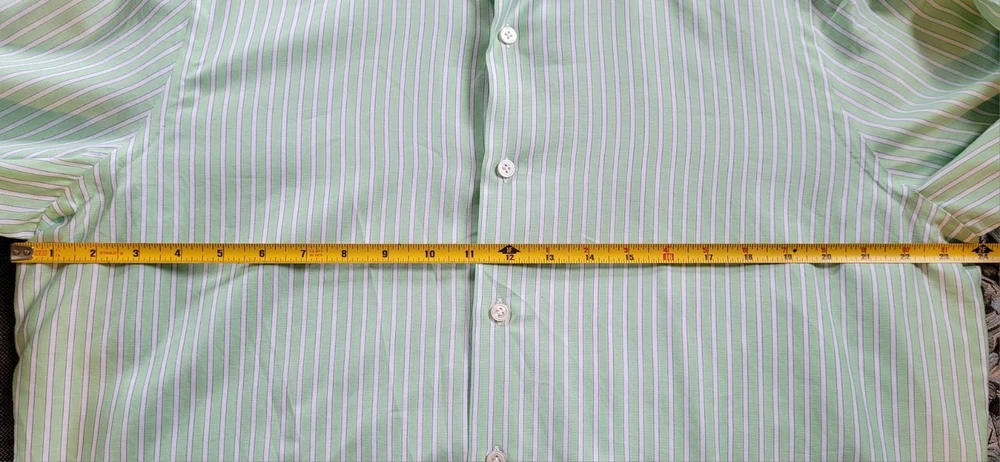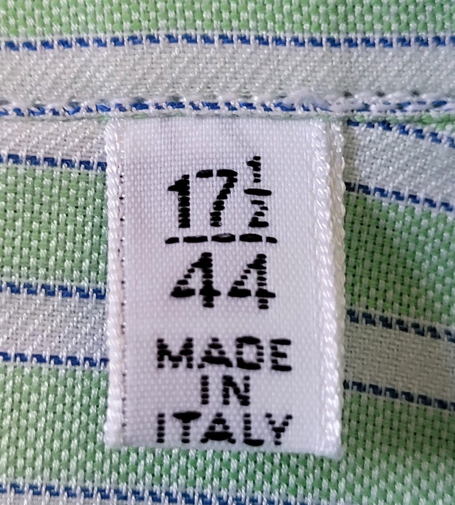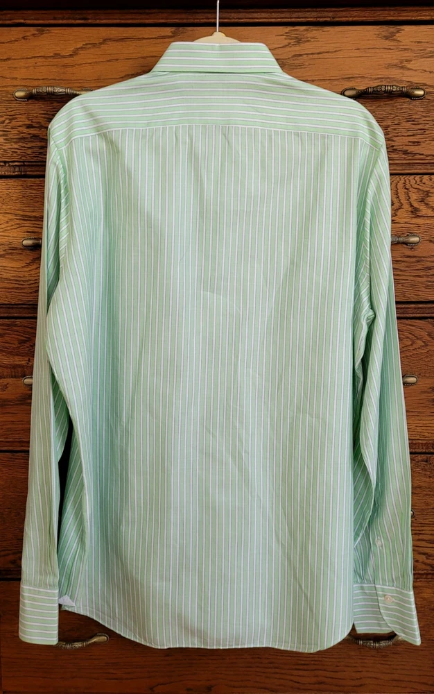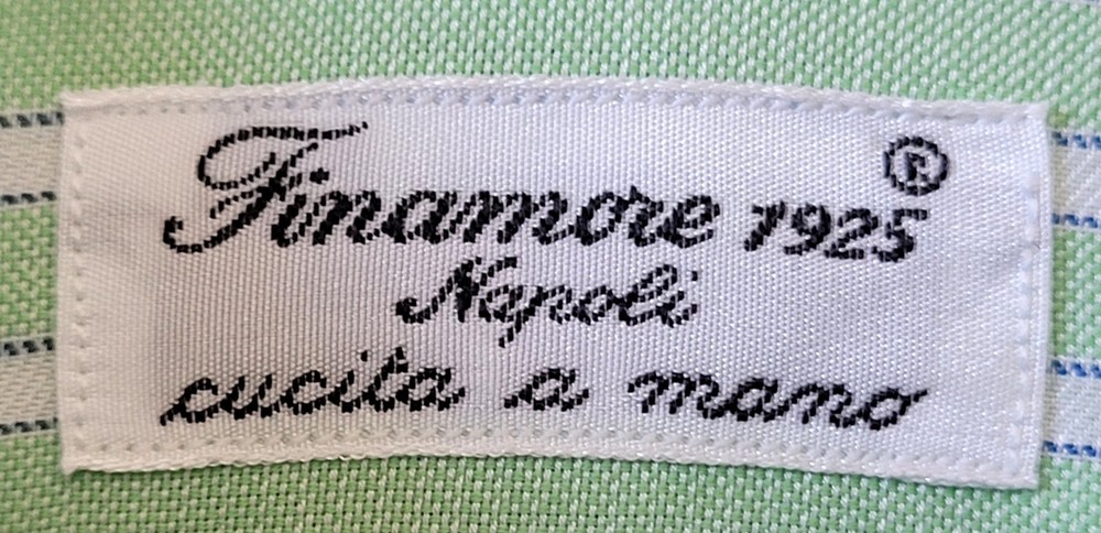Finamore 1925 Napoli Italian Green White Striped Classic Dress Shirt 17.5/44 24" Pit to Pit Finamore 1925 Napoli Italian Classic Dress Shirt in green and white stripes with complimentary blue pinstrips. The Finamore Napoli Dress Shirt in size 17.5/44 offers a classic and luxurious design, perfect for various occasions like business, casual, or travel. Made from 100% fine cotton and crafted by hand in Italy in a handsome multicolor striped pattern, this shirt features a collared neckline with a barrel cuff style. This dress shirt is made of the highest-quality Italian craftsmanship and materials, that embodies the designer and luxury details (see pics), making it a timeless and stylish addition to any man's wardrobe. Perfect for all seasons and occasions, this shirt is sure to make a statement with its timeless Italian elegance. Excellent condition. No wear detected. Please view all photos and forward any and all questions before bidding or purchasing. Pictures are part of the description. Shipped USPS GROUND ADVANTAGE. CHECK OUT OUR OTHER QUALITY ITEMS FOR AWESOME BUYS 👌