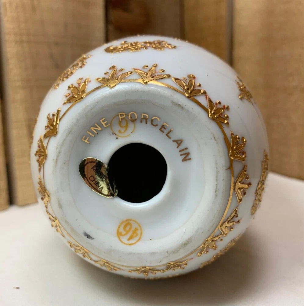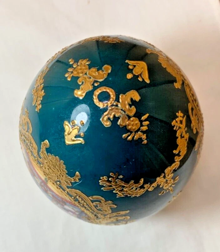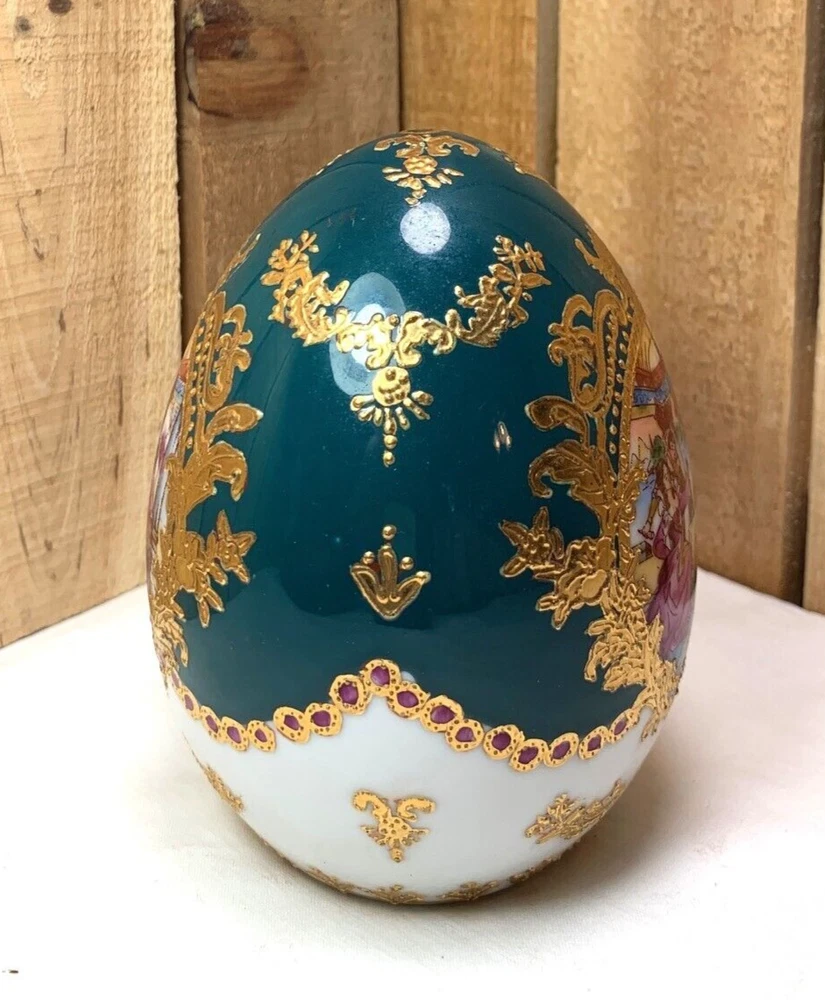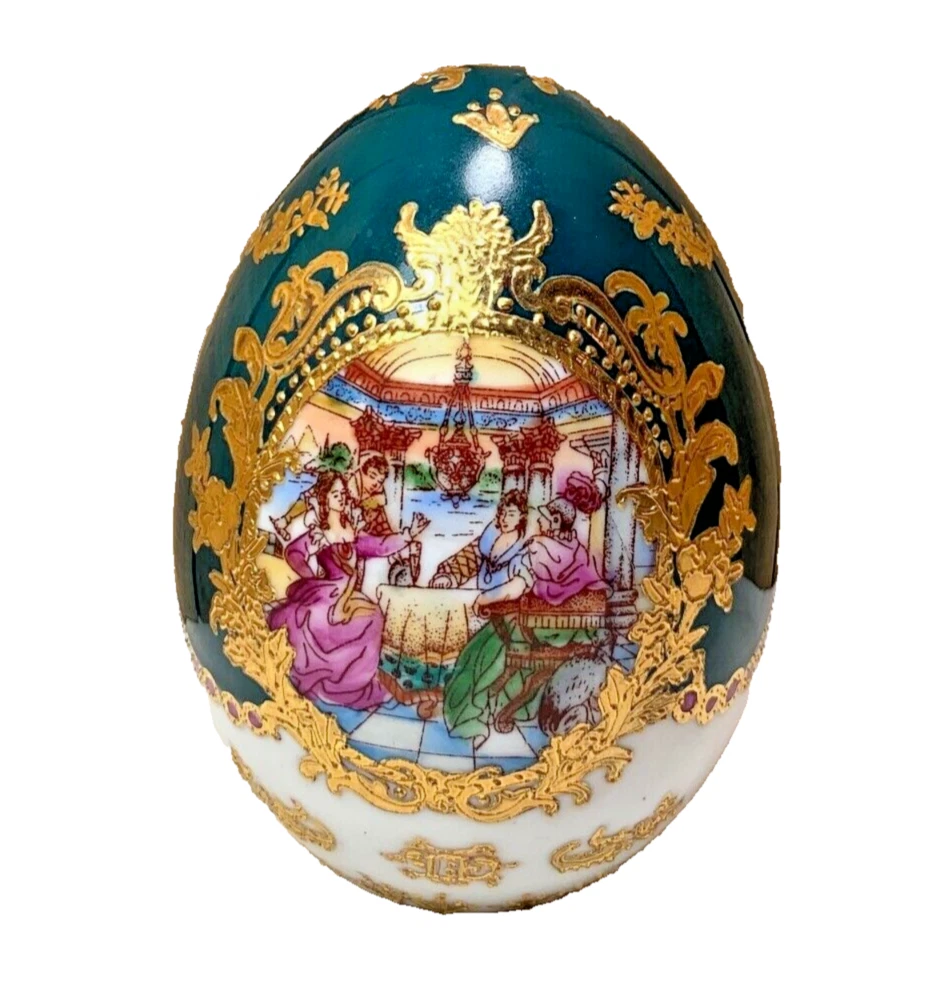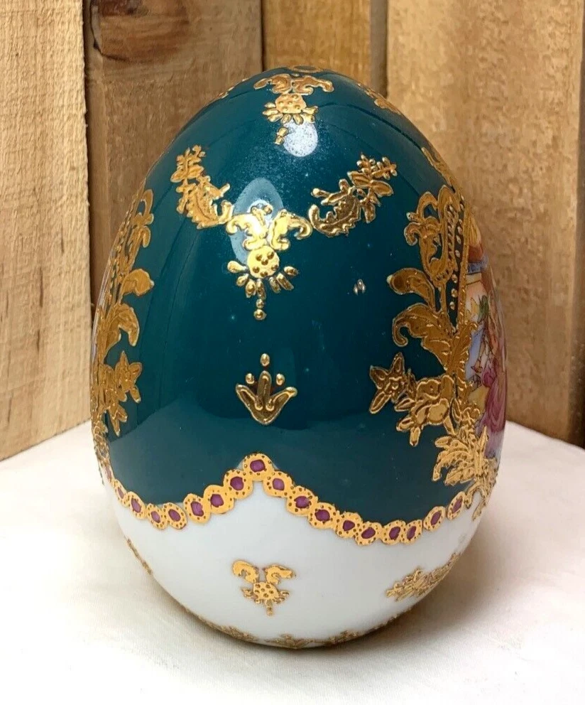 Vintage fine porcelain green and gold egg with a beautiful Victorian scene. Approximately 4 1/2" Tall, 3 1/4" diameter at widest area, and 7 oz. Very good condition. No cracks or chips. Please see all photos as they are part of the description. We try to list as many details as possible, however some items are vintage and pre-owned so flaws are to be expected. We try to find out as much information as possible on each item we have available. On occasion we may make a mistake and appreciate your feedback.