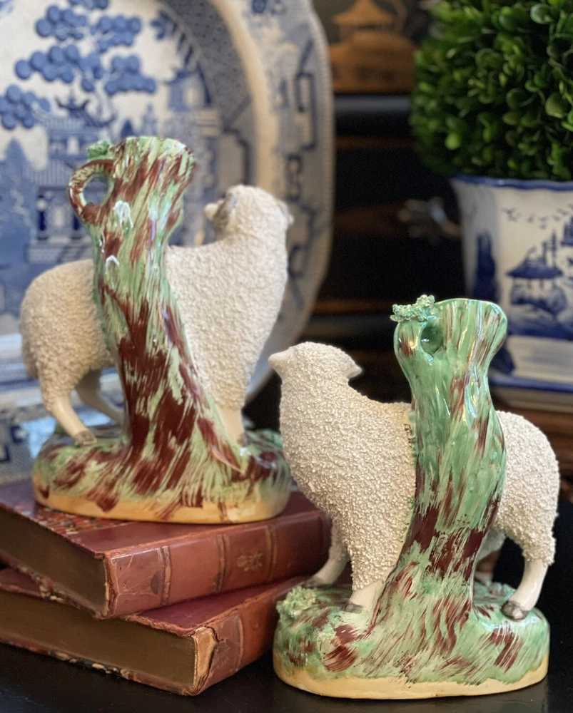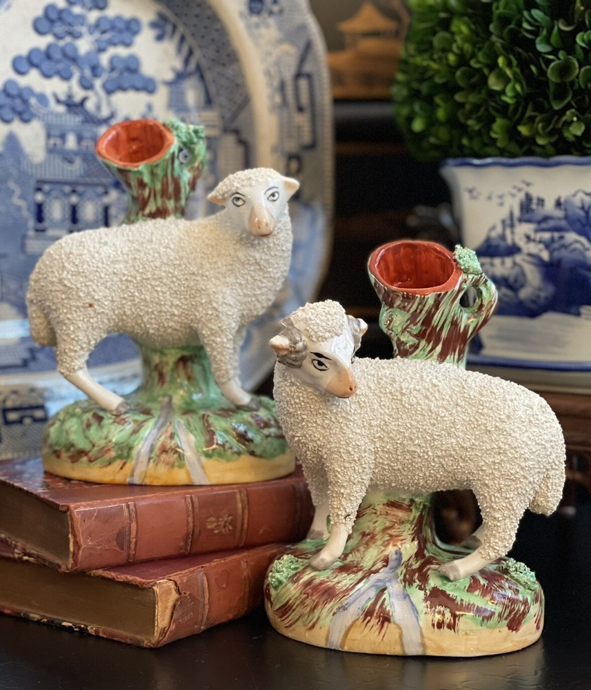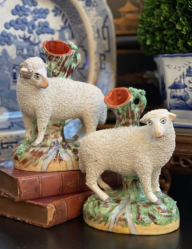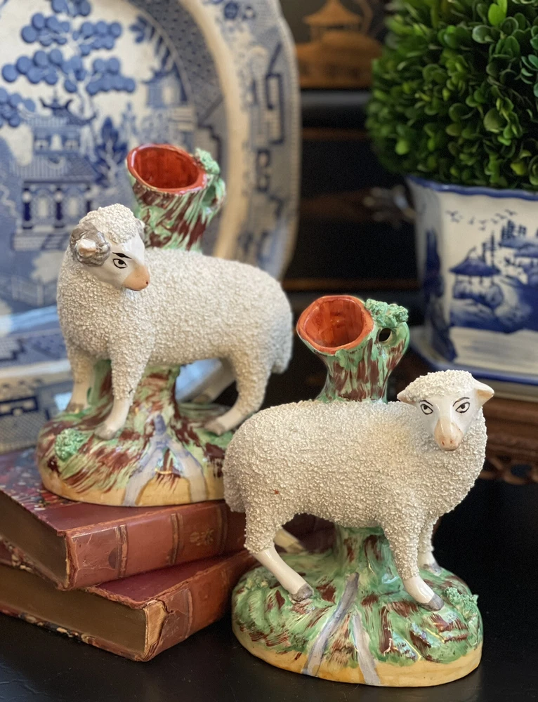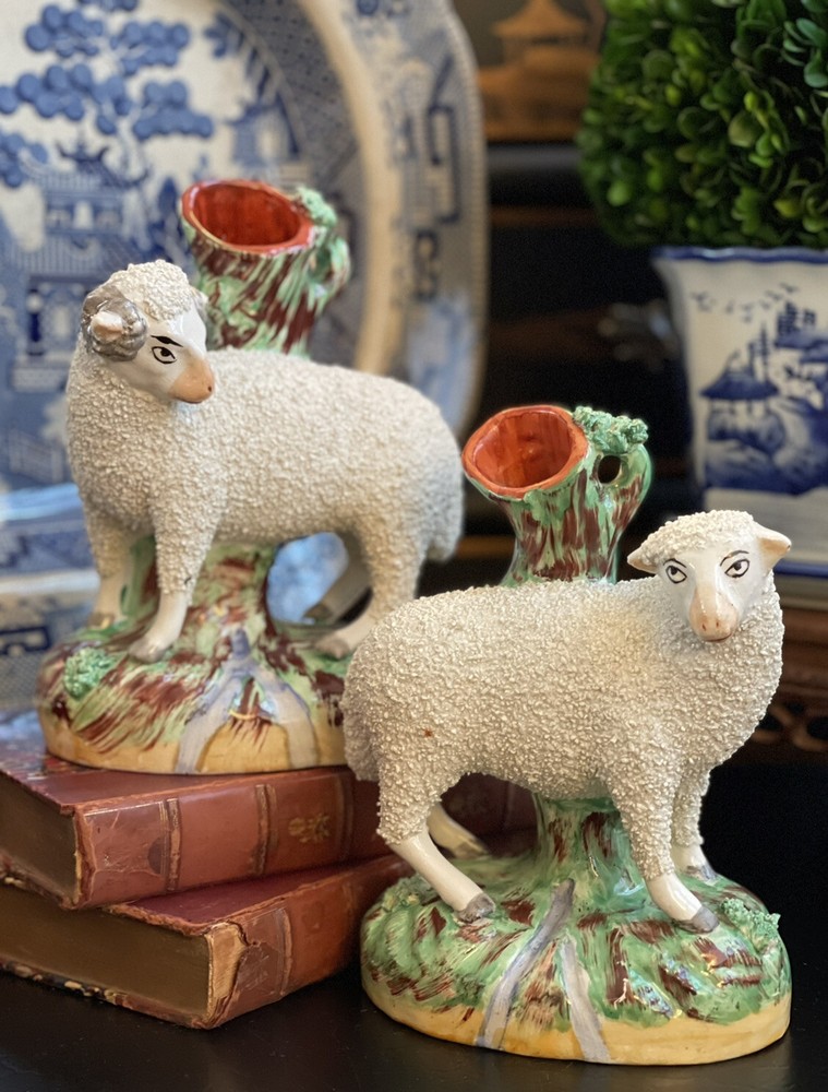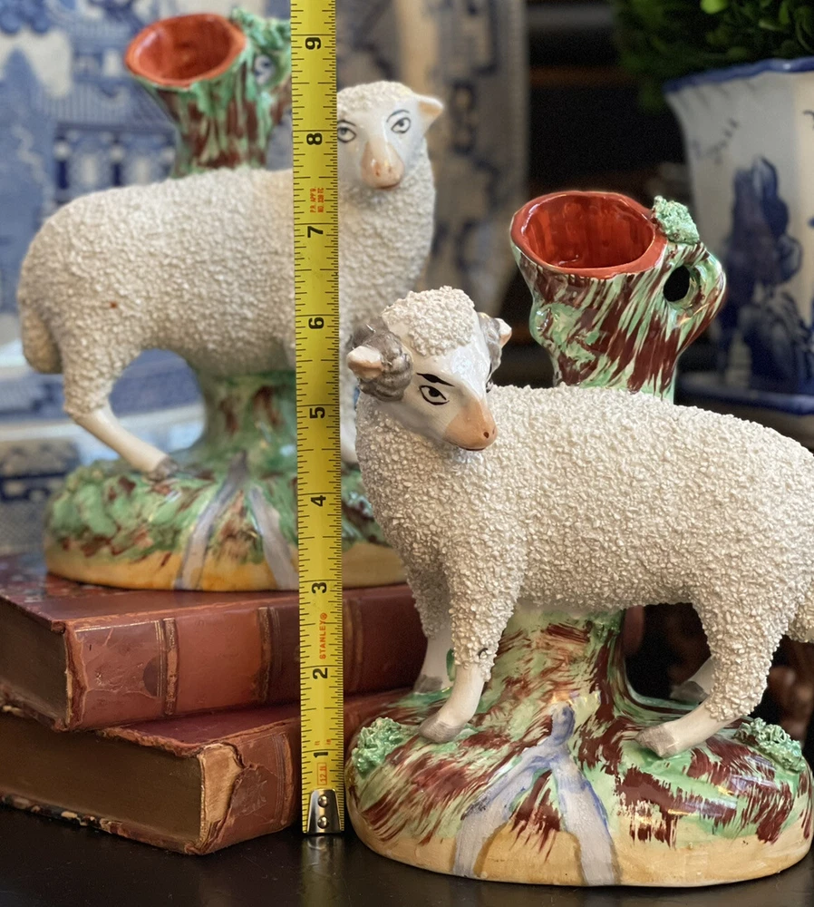 Stunning Large Rare Pair Pastoral English Porcelain Staffordshire Sheep • Length 5.5” • Height 7.4” • Width 3.5” This stunning pair of extra large scarcely found antique right and left facing figural ram and ewe mantle sheep spill vases in classic form and with textural coats with derby red lined spills, will bring a touch of the English countryside to any setting. These are grand showpieces to place on their own or as the piece de resistance in a collection or arrangement. Excellent condition with no post production cracks or chips. Marvelously scarce surviving examples to enjoy and treasure. * Listing is for pair of sheep only. Other items are for display purposes.