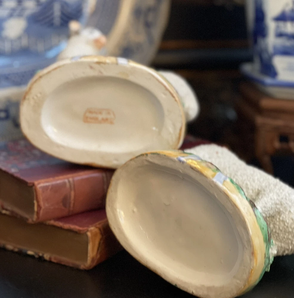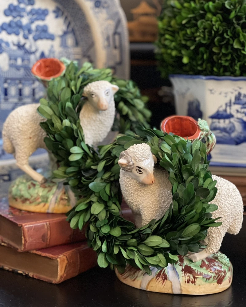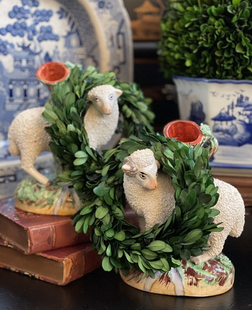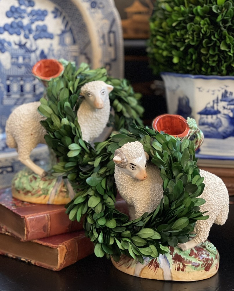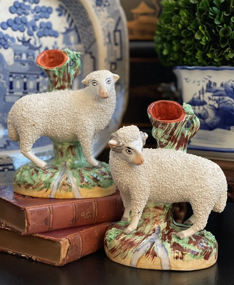 Stunning Large Rare Pair Pastoral English Porcelain Staffordshire Sheep • Length 5.5” • Height 7.4” • Width 3.5” This stunning pair of extra large scarcely found antique right and left facing figural ram and ewe mantle sheep spill vases in classic form and with textural coats with derby red lined spills, will bring a touch of the English countryside to any setting. These are grand showpieces to place on their own or as the piece de resistance in a collection or arrangement. Excellent condition with no post production cracks or chips. Marvelously scarce surviving examples to enjoy and treasure. * Listing is for pair of sheep only. Other items are for display purposes.
