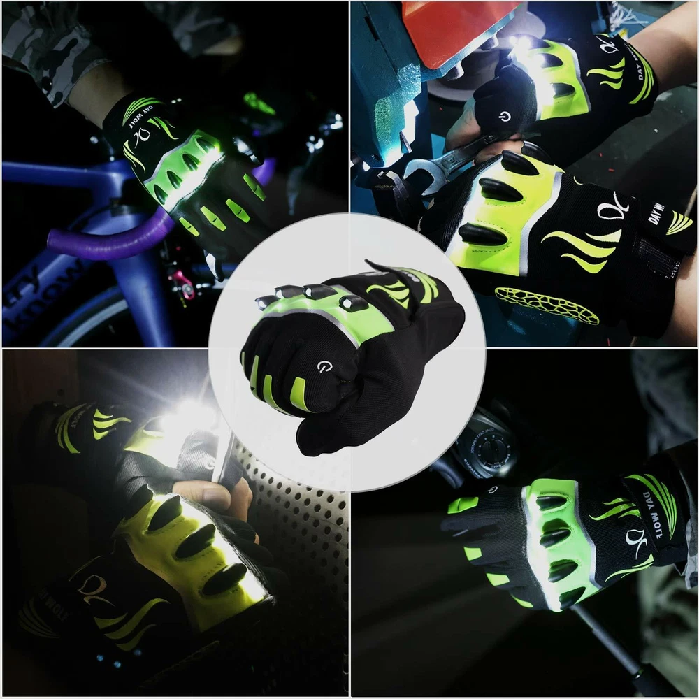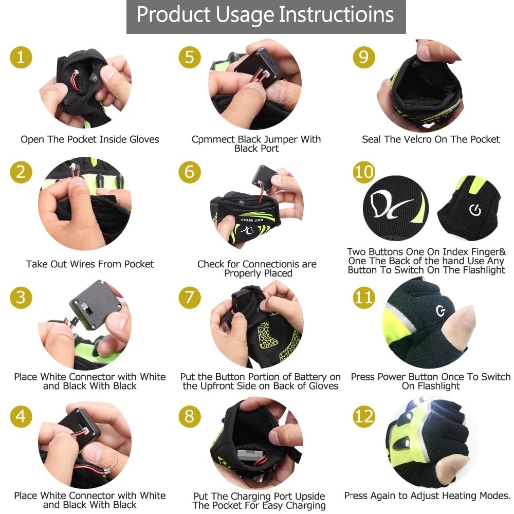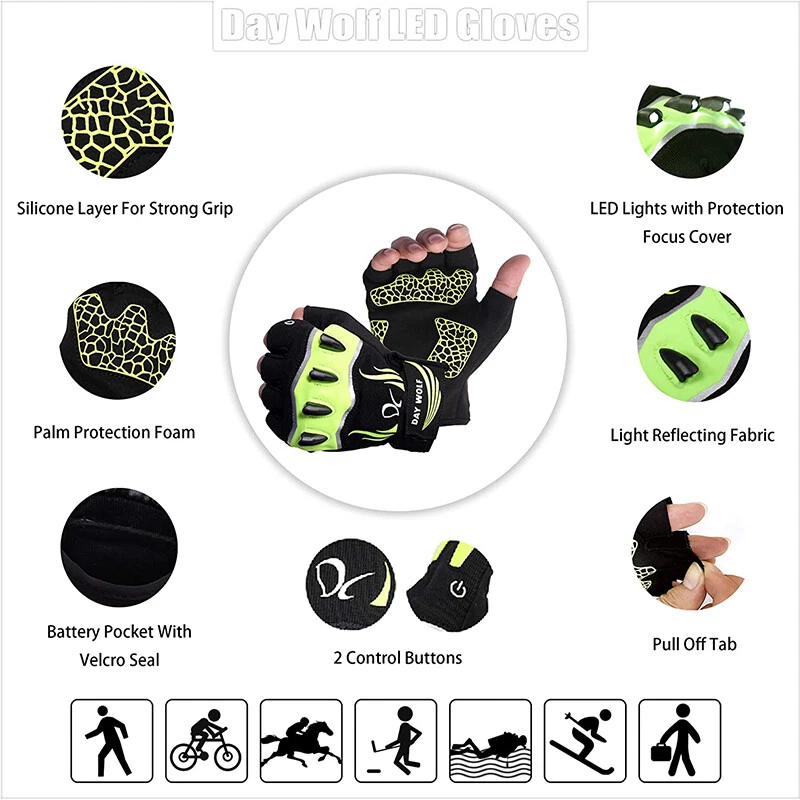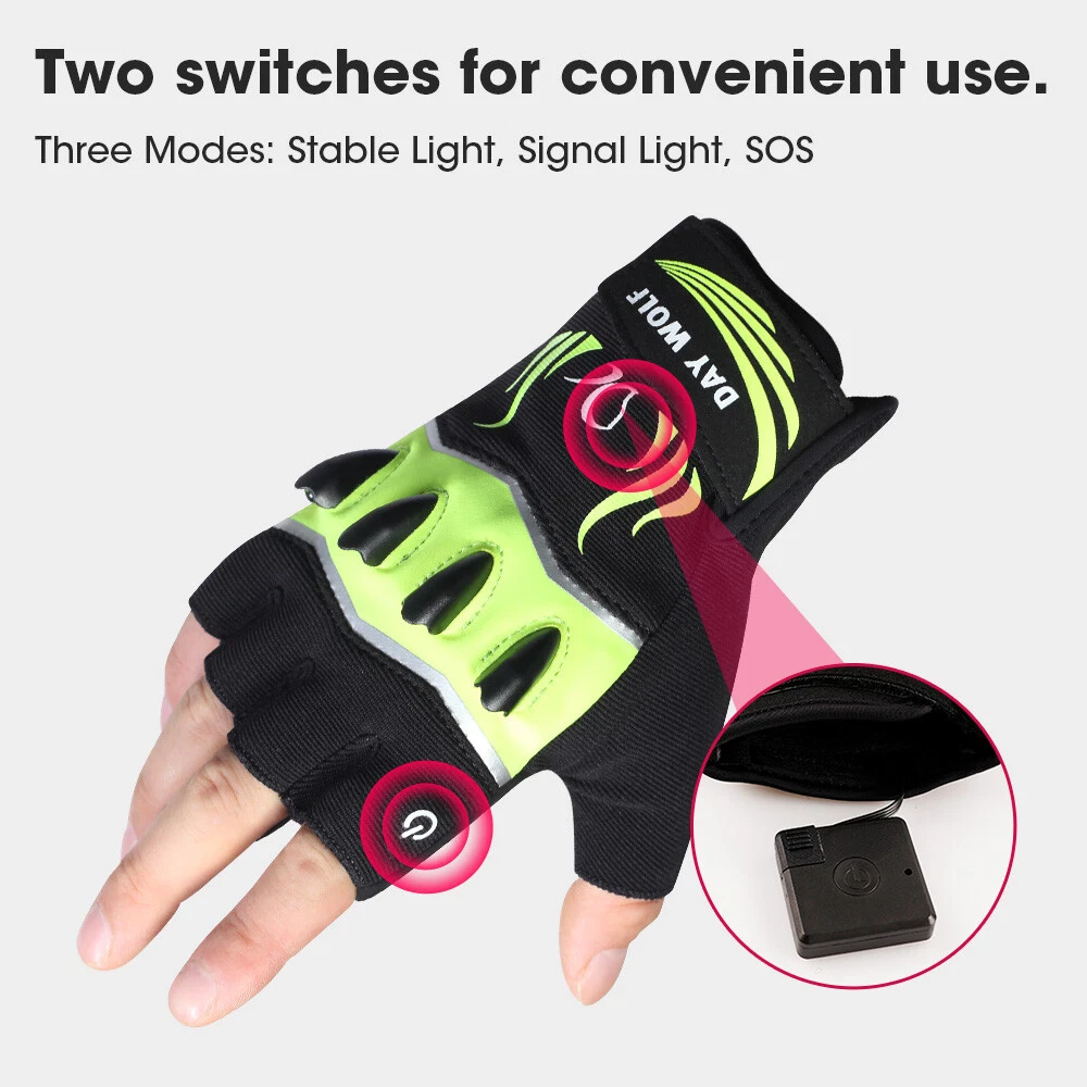 Product Description: [3.7V 230mah rechargeable battery] : each pair of gloves is equipped with two 3.7V 230mah rechargeable batteries and a USB charger, which is more convenient when going out. Battery features: lightweight (10g / piece), portable (small size 1.5 "* 1.5"), convenient and rechargeable. [2 Buttons Controller and 3 Modes Adjustable] : the On/off buttons are locate on the index finger and the back of hand cuff, either can be controlled the lights. There are 3 models ( a. Stable light; b. Signal light; c. SOS) for the LED light, you can press the button to adjust the light as per your requirement and condition. [ Touchscreen Design] : You can touch your Phone without taking off your gloves when you cycling, running, hiking, etc. Sensitive I-touch function and durable base fabric. [high quality materials and humanized design] innovative combination of high quality breathable materials, stairs, Lycra, Goatskin Leather, micro suede and foamed foam underneath your palm makes you feel comfortable when you wear these gloves. Designed for sports activities, it has elasticity and fine sewing, perfect fit and comfortable movement. [widely used and after-sales] it can be widely used in multi-purpose sports such as running, walking, hiking, camping, fishing and so on. Of course, there are no concerns about the product. If so, please feel free to contact us