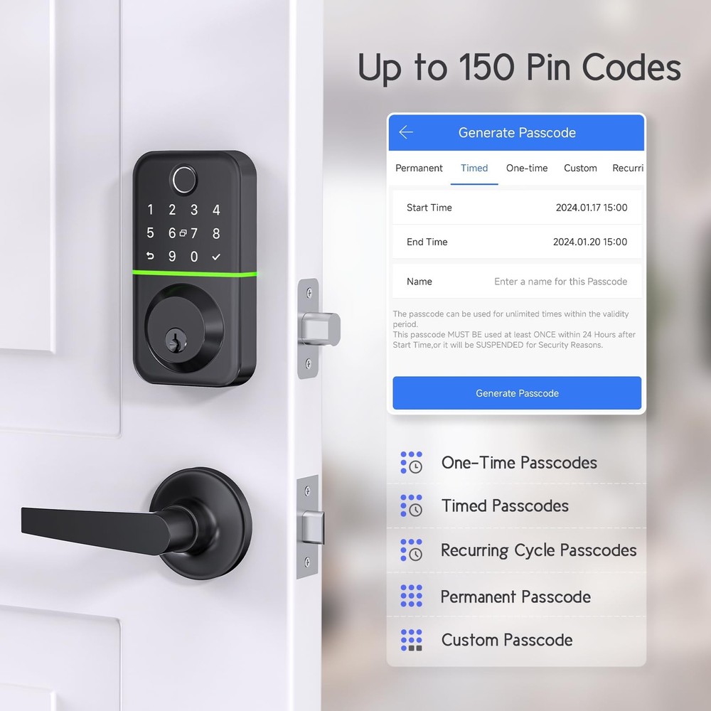 Wise-Gear Fingerprint Door Lock with Deadbolt and Handle set for Front Door Features: 1. App and Web control: Available to use both mobile APP and Web to control the smart door lock. The keypad deadbolt is a really good choice for management of personal house property, Airbnb, rental apartment, ect. 2. Keyless deadbolt smart door lock with handle: The product contains two parts, one is the electronic deadbolt fingerprint lock, another is the door handle. 3. Front Door Lock Set Keyless Entry: The keyless entry door lock deadbolt with handle set provides you multiple access ways to control: full APP control, fingerprint, passcode, key Fob, physical keys, Bluetooth, and Alexa voice control (Optionally, G2 Wifi Gateway required). Enjoy the convenience to use different methods to unlock the smart door lock. 4. Easily Installed in Few Minutes: Super easy to install the keypad deadbolt lock set in just few minutes. The smart deadbolt is designed to fit into American standard doors. No need to drill any extra holes on your existing doors. 5. Various Types of Pin Code: Different kinds of passwords are available for you to choose. You can generate one-time passcode for deliveryman, generate time-limited passcode for your guests, generate common passcode for your family, as well as generate week recurring cycle passcodes for cleaner. Manage the deadbolt lock as your wishes. 6. Anto Lock Function and One-touch Locking: Set auto lock mode in the mobile APP, then the fingerprint door lock will automatically lock after unlocking. No worries about forgetting to lock your digital door lock any more. Or just long press confirm button for three seconds to lock manually on the keypad. 7. Weather and Temperature Resistant: The waterproof rating of this smart door locks for front door is IP66. What's more, the exterior door lock set can withstand extreme temperatures (-22℉ to 158℉). A very excellent choice for your front door. 【Front Door Lock Set Keyless Entry】The keyless entry door lock deadbolt with handle set provides you multiple access ways to control: full APP control, fingerprint, passcode, key Fob, physical keys, Bluetooth, and Alexa voice control (Optionally, G2 Wifi Gateway required). Enjoy the convenience to use different methods to unlock the smart door lock. 【Easily Installed in Few Minutes】Super easy to install the keypad deadbolt lock set in just few minutes. The smart deadbolt is designed to fit into American standard doors. No need to drill any extra holes on your existing doors. 【Various Types of Pin Code】Different kinds of passwords are available for you to choose. You can generate one-time passcode for deliveryman, generate time-limited passcode for your guests, generate common passcode for your family, as well as generate week recurring cycle passcodes for cleaner. Manage the deadbolt lock as your wishes. 【Auto Lock Function and One-touch Locking】Set auto lock mode in the mobile APP, then the fingerprint door lock will automatically lock after unlocking. No worries about forgetting to lock your digital door lock any more. Or just long press confirm button for three seconds to lock manually on the keypad. 【Weather and Temperature Resistant】The waterproof rating of this smart door locks for front door is IP66. What's more, the exterior door lock set can withstand extreme temperatures (-22℉ to 158℉). A very excellent choice for your front door.