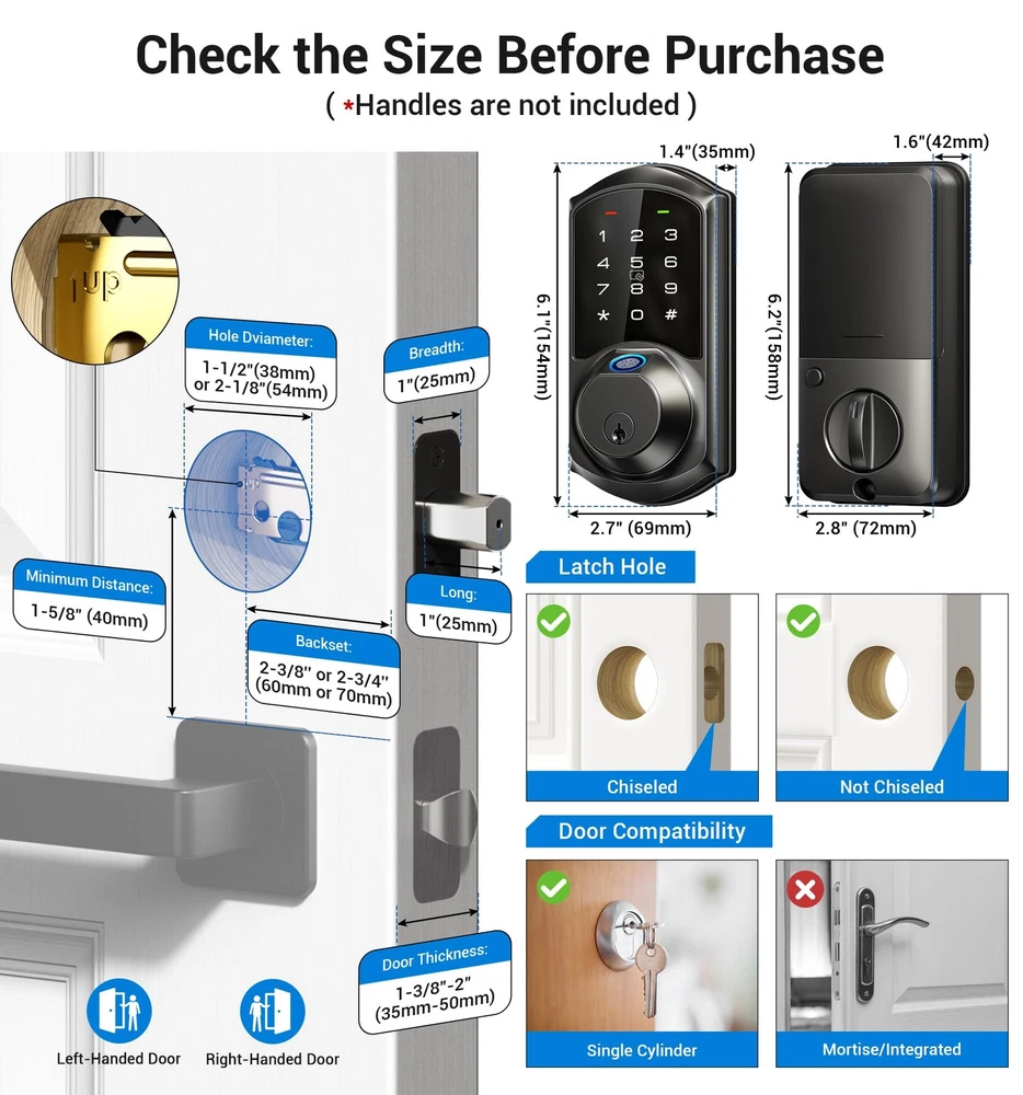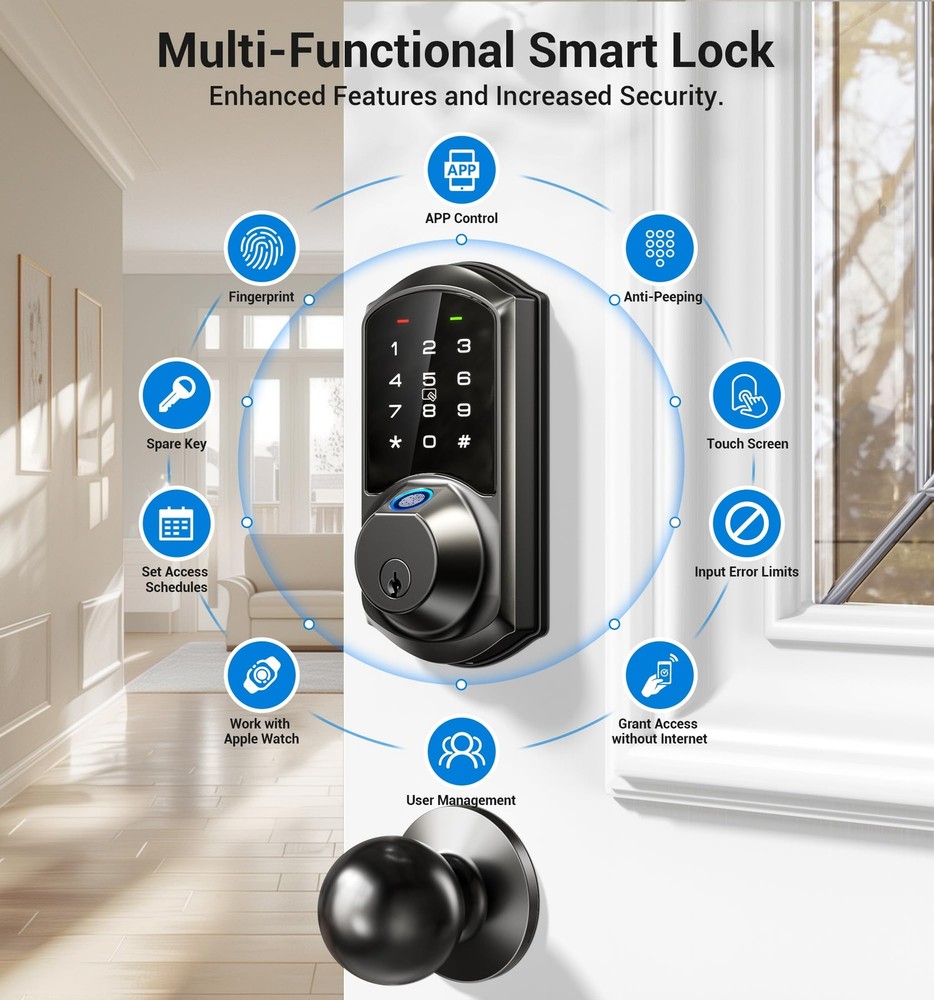 Introducing the Fingerprint Smart Deadbolt Lock, the perfect addition to your home security system. Our smart lock provides an innovative way of keeping your house safe from intruders. With this smart lock, you no longer have to worry about lost keys or unauthorized entry. This smart lock boasts a sleek and modern design, making it an excellent choice for homeowners who value aesthetics. It's easy to install and can fit into most standard-sized doors - making it a perfect addition to any front door. Our Fingerprint Door Lock eliminates the need for a physical key, ensuring that you never get locked out of your home. Simply register your fingerprint to access your home and make life more convenient. The smart lock comes with a digital door lock with keypad set, providing more options for access. In addition to the fingerprint lock and keypad deadbolt, the Smart Deadbolt Lock provides enhanced security with its electronic deadbolt feature. It also has a built-in alarm system and notification feature that alerts you when someone tries to break in or tamper with the lock. This smart deadbolt is made of high-quality materials that offer durability and reliability, ensuring that you get the best value for your money. Whether you're at home or away, rest assured that your home is secure and safe with the Smart Lock. Upgrade your home's security with our reliable and efficient smart lock. Don't wait any longer to protect your home. Order the Fingerprint Smart Deadbolt Lock today and experience the convenience of a smart lock for yourself. Seven in One Smart Door Locks: The smart deadbolt has seven options to access, Fingerprint + App + Fobs +Code +eKey + Mechanical key, and compatible with Apple Watch Efficient Access Control: Work with up to fifty fingerprints and two hundred and fifty multiple user codes, this keyless deadbolt supports remotely generate and share one-time, permanent, recurring, and scheduled codes to different users Enhanced Functionality: The keypad lock features auto lock, one touch lock, anti-peeping passcode, wrong entry limit, privacy mode, silent mode, passage mode, low battery alarm, waterproof, heat and cold-resistant capabilities Remote Access: By connecting the electric door lock with G2 gateway (sold separately), you can remotely control and manage passcodes, check real-time access log and pushed notifications, voice control with Alexa and Google Assistant Easy Installation: Just with a screwdriver, you can have it up and running. The digital lock is compatible with most US standard doors. We offers lifetime technical support and after-sales email service