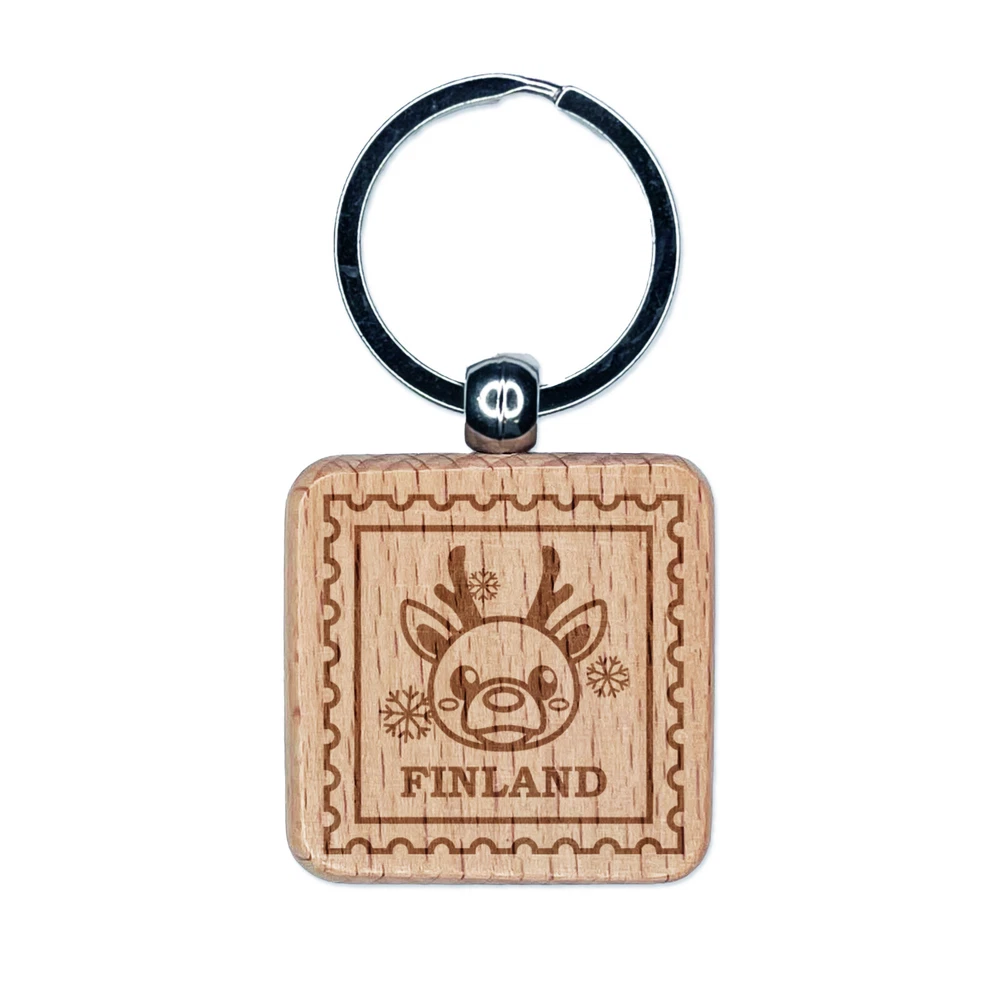 Finland Travel Reindeer Engraved Wood Square Keychain Tag Charm