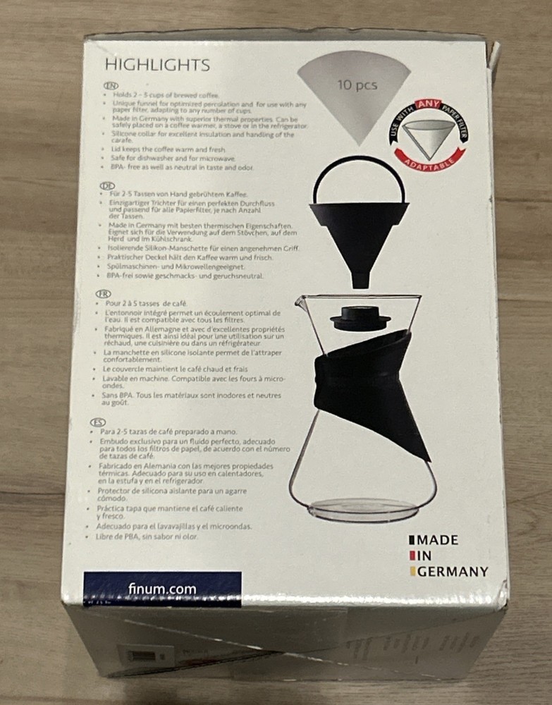 The Finum Bloom and Flow™ Pour-Over Coffee Brewer is a high-quality coffee maker designed and manufactured in Germany. This sleek and modern brewer is perfect for coffee enthusiasts who enjoy the art of brewing their own coffee. With a capacity to brew up to 5 cups of ground coffee, this model features a height of 9 inches and a depth of 6 inches, making it a compact and suitable addition to any kitchen. The included coffee filters ensure a clean and flavorful cup of coffee every time. The Bloom and Flow™ Pour-Over Coffee Brewer promises a smooth and enjoyable brewing experience for coffee lovers.