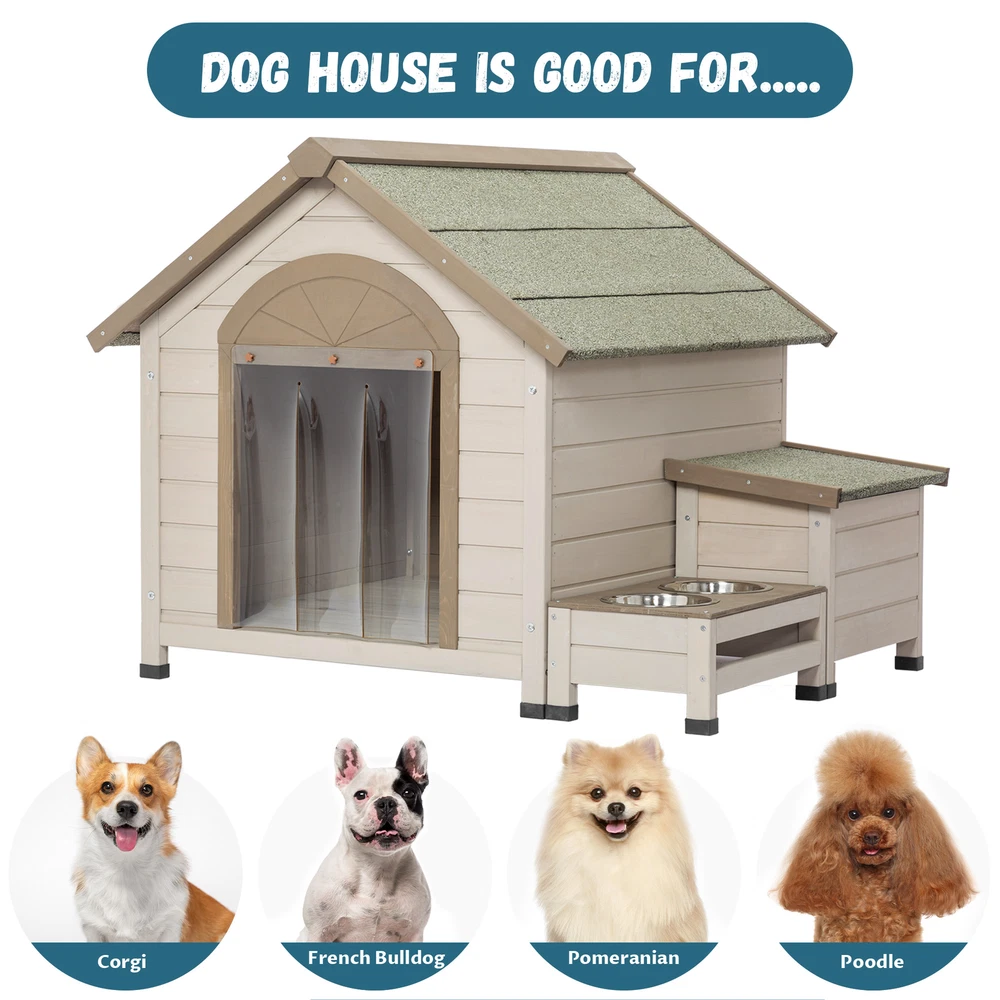You may like 9.94x25.68 ft Galvanized Metal Walk-in Chicken Coop Cage Poultry Run Hen House New $416.23 Free shipping & Free return Large Metal Walk-In Chicken Coop, Galvanized Wire Poultry/Rabbit/Duck House New $314.40 Free shipping & Free return Outdoor & Indoor Wooden Dog House Kennel with Raised Feet, Weatherproof - Large New $171.52 Free shipping & Free return Outdoor & Indoor Wooden Dog House Kennel with Raised Feet, Weatherproof - Large New $171.52 Free shipping & Free return Outdoor Indoor Poultry Cage, Small Animal House with Running Cage New $219.03 Free shipping & Free return Outdoor Wooden Chicken Coop Large Hen Cage Rabbit House with Ventilation Door New $491.19 Free shipping & Free return Outdoor Wooden Chicken Coop Large Hen Cage Rabbit House with Ventilation Door New $491.19 Free shipping & Free return Dog Pens Outdoor 32" Foldable 16 Panel Heavy Duty Metal Playpen Indoor Anti-Rust New $205.10 Free shipping & Free return Metal Large Chicken Coop Walk-in Poultry Cage, Arc Shaped with Waterproof Cover New $335.17 Free shipping & Free return Waterproof Wooden Dog House for Small to Large Dogs, Outdoor & Indoor Shelter New $352.60 Free shipping & Free return 9.94x25.68 ft Galvanized Metal Walk-in Chicken Coop Cage Poultry Run Hen House New $416.23 Free shipping & Free return Self-Cleaning Cat Litter Box 68L+9L, Variety of Litter, APP Control, Real-Time New $491.82 Free shipping & Free return 9.94x25.68 ft Galvanized Metal Walk-in Chicken Coop Cage Poultry Run Hen House New $416.23 Free shipping & Free return Wooden Dog Crate End Table 38.4" with 2 Drawers Storage New $220.01 Free shipping & Free return Wooden Dog Crate End Table 38.4" Kennel with 2 Drawers Storage New $220.01 Free shipping & Free return Wooden Dog Crate End Table 38.4" Kennel with 2 Drawers Storage New $220.01 Free shipping & Free return 38'' Heavy Duty Wooden Dog Crate Furniture with Double Doors for Large Dogs New $202.92 Free shipping & Free return Wooden Dog Crate Furniture with Drawer, Indoor Pet Kennel End Table New $174.36 Free shipping & Free return 10 ft. x 20 ft. Galvanized Metal Walk-In Chicken Coop Cage Poultry Run Hen House New $319.67 Free shipping & Free return 10 ft. x 20 ft. Galvanized Metal Walk-In Chicken Coop Cage Poultry Run Hen House New $319.67 Free shipping & Free return 9.94x25.68 ft Galvanized Metal Walk-in Chicken Coop Cage Poultry Run Hen House New $416.23 Free shipping & Free return Large Metal Walk-In Chicken Coop, Galvanized Wire Poultry/Rabbit/Duck House New $314.40 Free shipping & Free return Outdoor & Indoor Wooden Dog House Kennel with Raised Feet, Weatherproof - Large New $171.52 Free shipping & Free return Outdoor & Indoor Wooden Dog House Kennel with Raised Feet, Weatherproof - Large New $171.52 Free shipping & Free return Outdoor Indoor Poultry Cage, Small Animal House with Running Cage New $219.03 Free shipping & Free return Specification Product Information Main Color: Cream Main Material: Solid Wood Product Dimensions Item Length (in.): 40.94 Item Width (in.): 35.38 Item Height (in.): 31.89 Weight (lbs.): 51.04 Package Size Length (in.): 40.94 Width (in.): 31.89 Height (in.): 6.50 Weight (lbs.): 56.80 Product Features Body Measurements:37.4''L x 30.7''W x 26.8''H Interior Measurements:27''L x 29.3''W x 27''H Diameter of Bowl:6'' Door Measurements:14''W x 15.3''H Storage Box Measurements:16.5''L x 11''W x 13''H Storage Box Interior Measurements:12.2''L x 8.6''W x 9''H Feeding Stand Measurements:15''L x 9.8''W x 6.5''H Clearance Height:2''H Suitable for Pets:Small to Medium dogs weight up to 60 pounds Package Number:1 Description Product Description A decorative and sheltered retreat for your four-legged friend: Our dog house has an appealing design and is ideal for relaxing and taking a breather outdoors. It is made of 100% fir wood and is equipped with a weatherproof asphalt roof to withstand most weather conditions, like rain, snow, sun, and wind. Roof can be easily opened for airing or cleaning. The wooden kennel features a well thought-out design with practical extras. In addition to the actual dog house, you can attach a covered storage box to the dog house, where you can store food supplies, toys, leashes or other small items.There is also a raised feeding area with two stainless steel feeding bowls to protect your dog's spine and allow them to eat comfortably at a suitable height. Easy to assemble: Pre-assembled wall and roof elements. The breed-specific size recommendations given are non-binding recommendations based on breed standards. The individual size of the animal should definitely be taken into account when choosing a doghouse. Raised Design: The elevated floor of this large dog house keeps your pet dry and warm and protects your dogs from insects and moisture. The front door is equipped with a plastic door curtain, which can keep the dog warmer in cold winter and be removed in summer. NOTE:The item has been treated with a harmless water-based wood preservative solution. This solution provides initial protection against the elements, but the product should be regularly re-treated if used outdoors. Without care, wood dries out and can become brittle or warped, or become unsightly. Therefore, make sure that your doghouse is cleaned and treated regularly. Please use wood care / wood stain products that are safe for animals. Choose a location that is as sheltered as possible to reduce weather-related wear and tear.