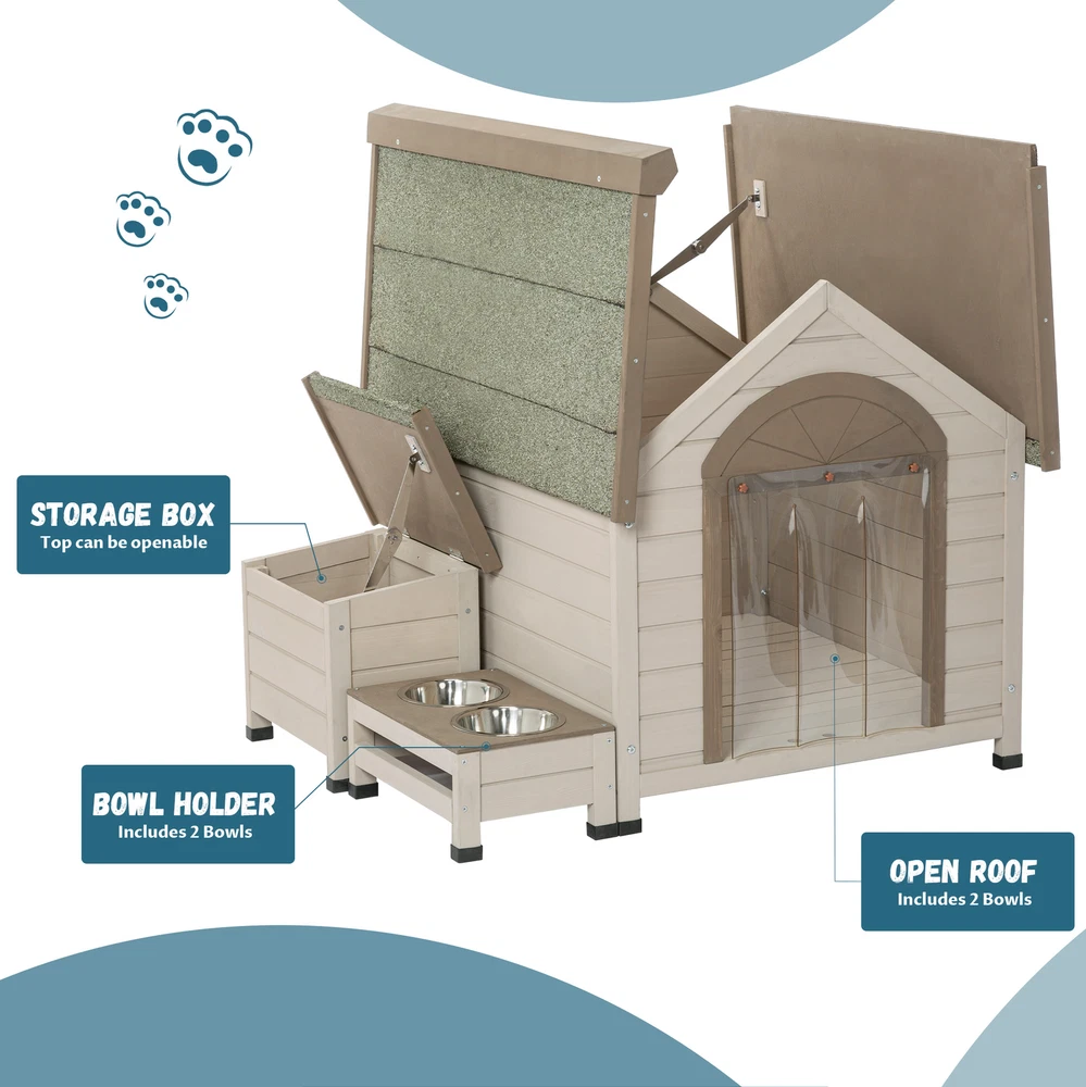 You may like 9.94x25.68 ft Galvanized Metal Walk-in Chicken Coop Cage Poultry Run Hen House New $416.23 Free shipping & Free return Large Metal Walk-In Chicken Coop, Galvanized Wire Poultry/Rabbit/Duck House New $314.40 Free shipping & Free return Outdoor & Indoor Wooden Dog House Kennel with Raised Feet, Weatherproof - Large New $171.52 Free shipping & Free return Outdoor & Indoor Wooden Dog House Kennel with Raised Feet, Weatherproof - Large New $171.52 Free shipping & Free return Outdoor Indoor Poultry Cage, Small Animal House with Running Cage New $219.03 Free shipping & Free return Outdoor Wooden Chicken Coop Large Hen Cage Rabbit House with Ventilation Door New $491.19 Free shipping & Free return Outdoor Wooden Chicken Coop Large Hen Cage Rabbit House with Ventilation Door New $491.19 Free shipping & Free return Dog Pens Outdoor 32" Foldable 16 Panel Heavy Duty Metal Playpen Indoor Anti-Rust New $205.10 Free shipping & Free return Metal Large Chicken Coop Walk-in Poultry Cage, Arc Shaped with Waterproof Cover New $335.17 Free shipping & Free return Waterproof Wooden Dog House for Small to Large Dogs, Outdoor & Indoor Shelter New $352.60 Free shipping & Free return 9.94x25.68 ft Galvanized Metal Walk-in Chicken Coop Cage Poultry Run Hen House New $416.23 Free shipping & Free return Self-Cleaning Cat Litter Box 68L+9L, Variety of Litter, APP Control, Real-Time New $491.82 Free shipping & Free return 9.94x25.68 ft Galvanized Metal Walk-in Chicken Coop Cage Poultry Run Hen House New $416.23 Free shipping & Free return Wooden Dog Crate End Table 38.4" with 2 Drawers Storage New $220.01 Free shipping & Free return Wooden Dog Crate End Table 38.4" Kennel with 2 Drawers Storage New $220.01 Free shipping & Free return Wooden Dog Crate End Table 38.4" Kennel with 2 Drawers Storage New $220.01 Free shipping & Free return 38'' Heavy Duty Wooden Dog Crate Furniture with Double Doors for Large Dogs New $202.92 Free shipping & Free return Wooden Dog Crate Furniture with Drawer, Indoor Pet Kennel End Table New $174.36 Free shipping & Free return 10 ft. x 20 ft. Galvanized Metal Walk-In Chicken Coop Cage Poultry Run Hen House New $319.67 Free shipping & Free return 10 ft. x 20 ft. Galvanized Metal Walk-In Chicken Coop Cage Poultry Run Hen House New $319.67 Free shipping & Free return 9.94x25.68 ft Galvanized Metal Walk-in Chicken Coop Cage Poultry Run Hen House New $416.23 Free shipping & Free return Large Metal Walk-In Chicken Coop, Galvanized Wire Poultry/Rabbit/Duck House New $314.40 Free shipping & Free return Outdoor & Indoor Wooden Dog House Kennel with Raised Feet, Weatherproof - Large New $171.52 Free shipping & Free return Outdoor & Indoor Wooden Dog House Kennel with Raised Feet, Weatherproof - Large New $171.52 Free shipping & Free return Outdoor Indoor Poultry Cage, Small Animal House with Running Cage New $219.03 Free shipping & Free return Specification Product Information Main Color: Cream Main Material: Solid Wood Product Dimensions Item Length (in.): 40.94 Item Width (in.): 35.38 Item Height (in.): 31.89 Weight (lbs.): 51.04 Package Size Length (in.): 40.94 Width (in.): 31.89 Height (in.): 6.50 Weight (lbs.): 56.80 Product Features Body Measurements:37.4''L x 30.7''W x 26.8''H Interior Measurements:27''L x 29.3''W x 27''H Diameter of Bowl:6'' Door Measurements:14''W x 15.3''H Storage Box Measurements:16.5''L x 11''W x 13''H Storage Box Interior Measurements:12.2''L x 8.6''W x 9''H Feeding Stand Measurements:15''L x 9.8''W x 6.5''H Clearance Height:2''H Suitable for Pets:Small to Medium dogs weight up to 60 pounds Package Number:1 Description Product Description A decorative and sheltered retreat for your four-legged friend: Our dog house has an appealing design and is ideal for relaxing and taking a breather outdoors. It is made of 100% fir wood and is equipped with a weatherproof asphalt roof to withstand most weather conditions, like rain, snow, sun, and wind. Roof can be easily opened for airing or cleaning. The wooden kennel features a well thought-out design with practical extras. In addition to the actual dog house, you can attach a covered storage box to the dog house, where you can store food supplies, toys, leashes or other small items.There is also a raised feeding area with two stainless steel feeding bowls to protect your dog's spine and allow them to eat comfortably at a suitable height. Easy to assemble: Pre-assembled wall and roof elements. The breed-specific size recommendations given are non-binding recommendations based on breed standards. The individual size of the animal should definitely be taken into account when choosing a doghouse. Raised Design: The elevated floor of this large dog house keeps your pet dry and warm and protects your dogs from insects and moisture. The front door is equipped with a plastic door curtain, which can keep the dog warmer in cold winter and be removed in summer. NOTE:The item has been treated with a harmless water-based wood preservative solution. This solution provides initial protection against the elements, but the product should be regularly re-treated if used outdoors. Without care, wood dries out and can become brittle or warped, or become unsightly. Therefore, make sure that your doghouse is cleaned and treated regularly. Please use wood care / wood stain products that are safe for animals. Choose a location that is as sheltered as possible to reduce weather-related wear and tear.