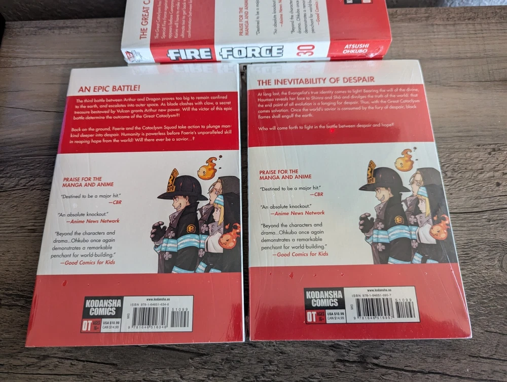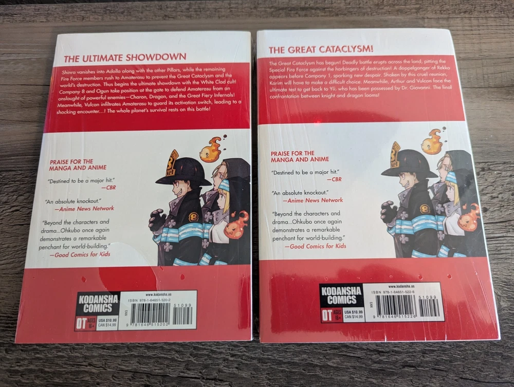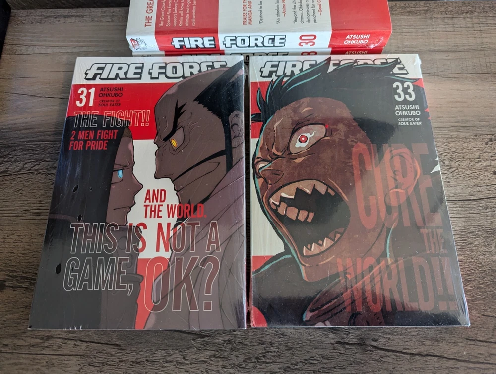 Series: Fire Force Artist / Writer: Atsushi Ohkubo Genres: Action, Supernatural Demographic: Shonen / Shounen Volume(s): 28, 30, 31, 33 Complete Series? No Language: English Publisher: Kodansha Rating: Older Teen 16+ MSRP: $10.99 per volume ($43.96 for set) Synopsis: Shinra vanishes into Adolla along with the other Pillars, while the remaining Fire Force members rush to Amaterasu to prevent the Great Cataclysm and the world’s destruction. Thus begins the ultimate showdown with the White Clad cult! Company 8 and Ogun take position at the gate to defend Amaterasu from an onslaught of powerful enemies—Charon, Dragon, and the Great Fiery Infernals! Meanwhile, Vulcan infiltrates Amaterasu to guard its activation switch, leading to a shocking encounter…! The whole planet’s survival rests on this battle! ------------------------------------------------------------------------ About Us: Cozy Manga is an online store specializing in graphic novels, manga, light novels, artbooks, and relevant products. As avid fans and collectors ourselves, we bring a curated touch with hand-picked stock and mindful handling. Shipping and Handling: All of our listings come with one business day handling and are shipped directly from our location in Albuquerque, New Mexico, USA. To help protect your purchase during shipping we will always ship your order in either a box or between pieces of cardboard if mailed in a bubble mailer. Quality Controls: All of our books come shrink wrapped. Any volumes that are delivered to us with no factory wrap are personally shrink wrapped once unpacked. While we will strive to shrink wrap volumes as professionally as possible, there may be some imperfections with the shrink wrap. Some volumes may come with minor imperfections or nicks if delivered as such from the publisher. Volumes with bigger imperfections will be listed as such with details. Return Policy: All of our listings come with a 30 day free return policy, including remorse returns. In the event you no longer want an item and wish to return it, item(s) must be received in new condition with their shrink wrap still intact for a full refund. Any items returned opened, used, damaged, or otherwise not in new condition may be subject to a variable refund deduction depending on the state of the item(s) up to 50% per the Ebay Seller Protection Policy. When returning an item, make sure to pack it properly to help prevent damage in transit. We do not offer no-return refunds and refunds will not be issued until we have received your return and inspected it. Returns initiated due to item arriving damaged, doesn't match the listing description, or because it is the wrong item are subject to the Ebay Money Back Guarantee Policy . If we have more of the same item in stock, you may request a replacement or a same value exchange. Cancellation Policy: If you made an order but have changed your mind and want to cancel please use the eBay cancellation request form or send us a message. We will cancel your order and refund you your money no questions asked so long as we have not already shipped it out. If you request a cancellation but your package has already been dropped off with the shipping carrier you will need to initiate a return request once you have received your order. F.A.Q.: Would you be willing to take x amount for this listing? Our listing prices are non-negotiable. We do not accept offers or haggle on price. If you are interested in a listing but would like to buy it at a lower price, please watch the listing to receive future notifications on any sales or discounts that may be offered in the future. I'd like to buy certain volumes from this multi-volume set listing. Would you be willing to split them out? If you need or want only certain volumes out of our set listings, please send a message about what volumes you would like to purchase. Most of the time we are more than willing to accommodate your request!