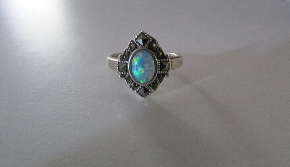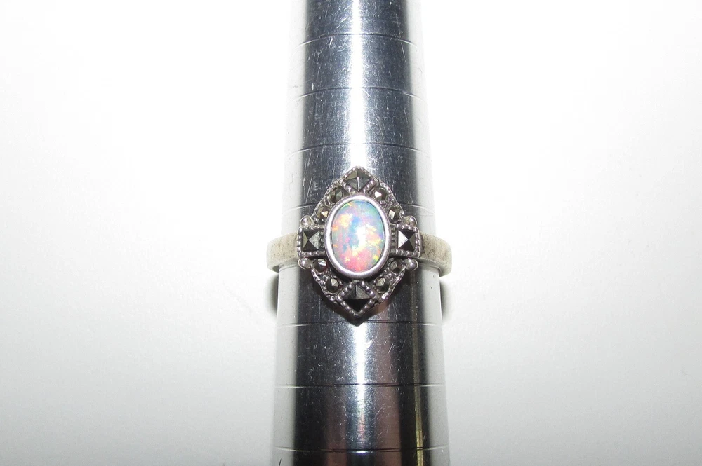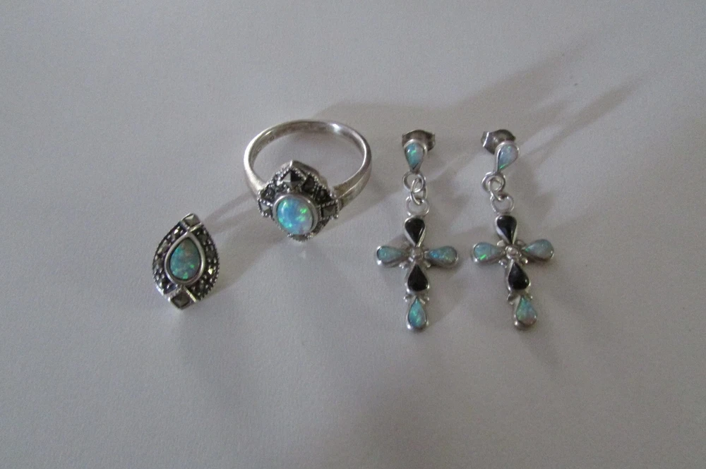 Fire opal, marcasite, and onyx with sterling silver jewelry set. Set includes a pair of cross earrings, a pendant (no chain included), and a ring. The ring is a size 8 and is stamped/signed "M 925" on the inside. The pendant is stamped/signed "M 925" on the back. The stud dangle earrings are both stamped "sterling" on the back. Stamps/signatures shown in pictures. Sold together, not separate. Buyer will receive items exactly as pictured. Shipping is United States (US) only. If outside US, contact me.