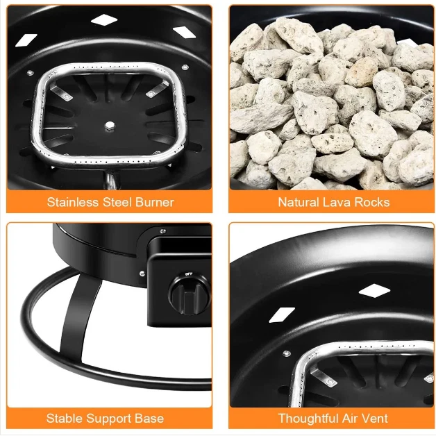 Firebowl Outdoor Portable Propane Gas Fire Pit Description Description: Our portable fire pit can bring you a more perfect outdoor camping experience! Our fire pit uses clean and environmentally friendly propane, which is safer to burn smokeless and odorless. Strong iron with black powder coating is rustproof and smooth for easy clean. The compact and portable design is easy to carry and store. It is your necessary partner for campfire parties, RV travels, family gatherings, and forest adventures. Features: Environmentally friendly propane fuel for safe use Burns without smoke, sparks and choking odors Sturdy iron construction with black powder coating for years of use Compact shape design to store easily Lava rock stones to bring you more beautiful flames of good heat Metal lid with fabric handle for easy carrying Including 10 ft hose with attached regulator Comes with tank stabilizer ring Round iron base to ensure stability Certified by CSA to allow use during most campfire bans Easy to assemble and maintain For outdoor use only, perfect for camping, backyards, terraces, beaches or caravan parks Specifications: Color: Black Product Dimensions: 19" x 19" x 11"(L x W x H) Material: Iron with Powder Coating Heat Output: 58,000BTU Net Weight: 19.5 lbs Package includes: 1 x Portable Fire Pit 4 x Lava Rock Stone 1 x Metal Lid 1 x Fabric Handle 1 x 10ft.Hose 1 x Tank Stabilizer Ring 1 x User Guide