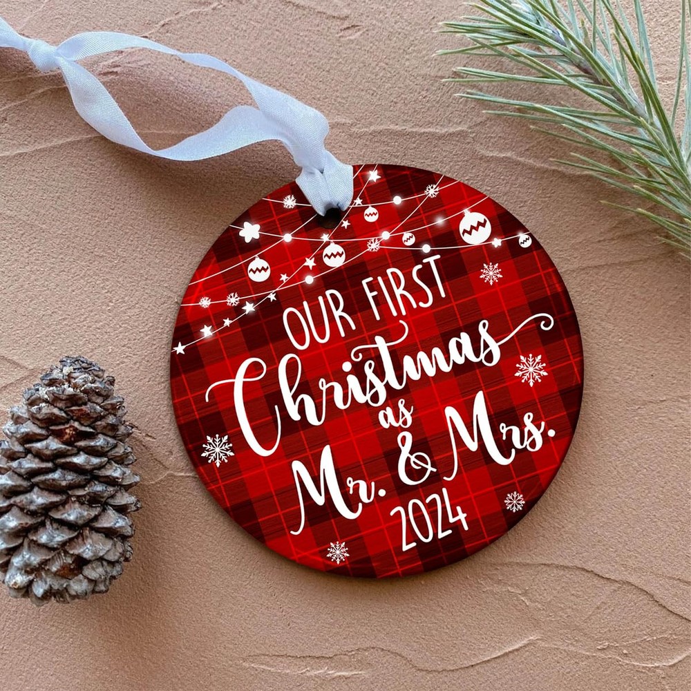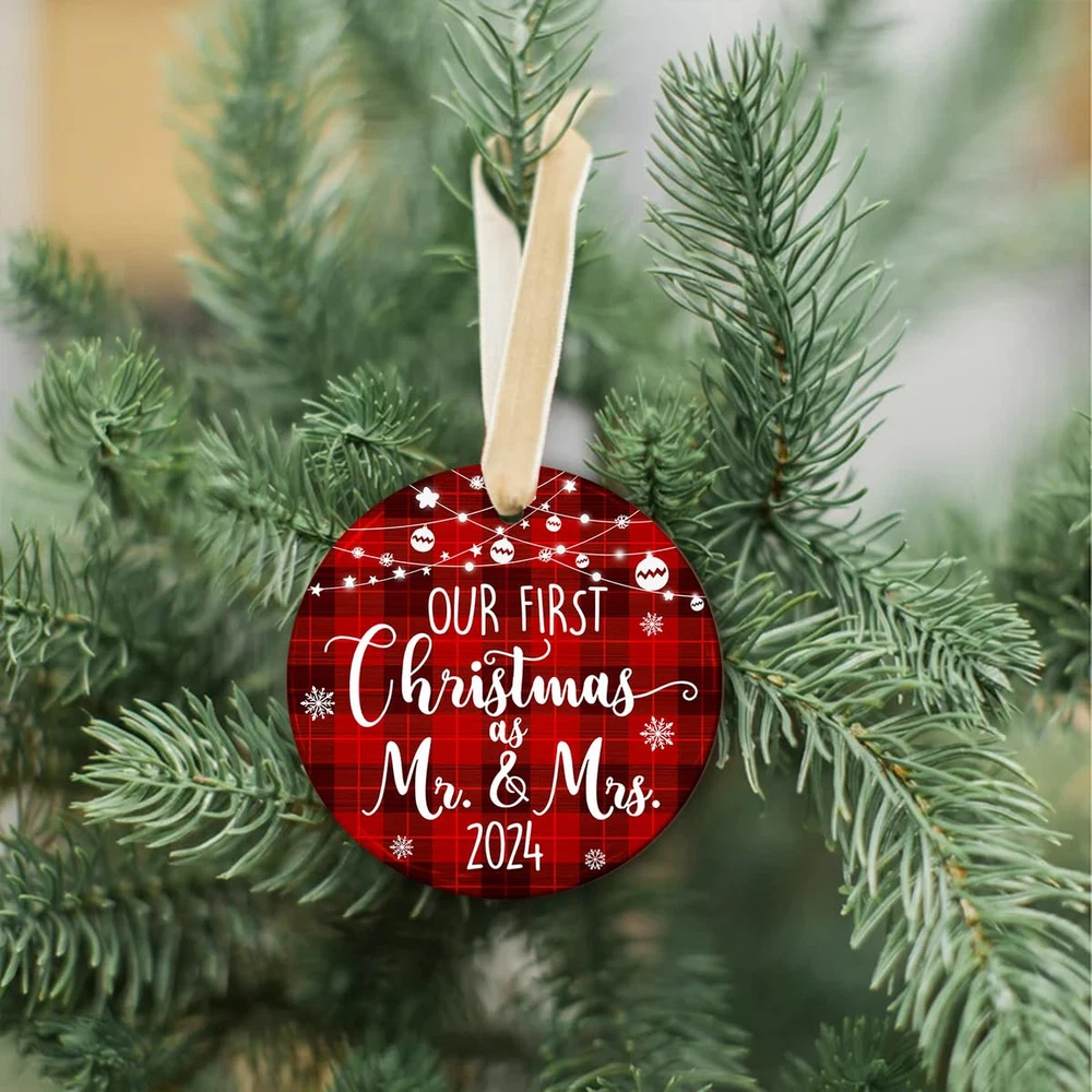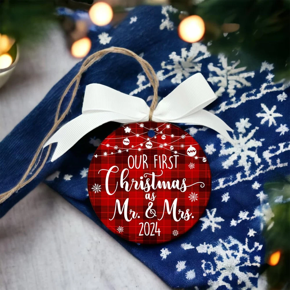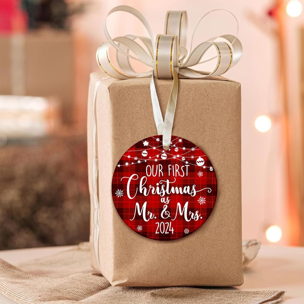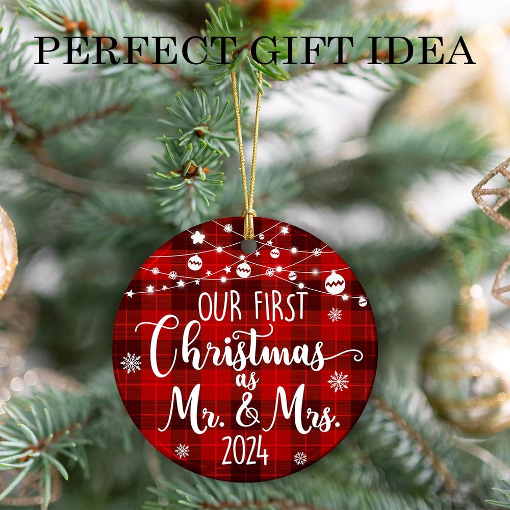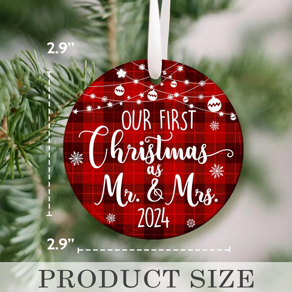 🎁 Perfect Mr and Mrs Gifts: Express your heartfelt wishes to a newlywed couple with this charming ornament, perfect for wedding gifts, Mr & Mrs gifts, and bridal shower gifts for newlyweds embarking on their journey together. 🎄 Memorable Wedding Ornament: Celebrate the joy of marriage with this "Our First Christmas as Mr & Mrs 2024" ornament, a beautiful keepsake to commemorate the love and happiness shared by a newly married couple. 💗 Ideal Size & Packaging: Measuring 4.0 inches in diameter, with a thickness of 0.2 inches, this ornament comes with a delicate 0.16-inch hanging hole and is packaged in an elegant kraft gift box, ready for gifting. ⭐ MATERIAL: Each of our ornaments is made from high-quality ceramic, wood, acrylic, or aluminum. Made by good masters in the field, designed and printed with a special laser printer head. The imprinted designs are printed on one side of the ornament and are guaranteed to last up of liquid. ✨ AFTER SALE SERVICE: To ensure customer satisfaction. If you’re not delighted with these cute ornaments, return them for a 100% of your purchase price. We aim high and will do everything we can to keep our customers happy. And our promise, like a family tree, is as solid as oak.