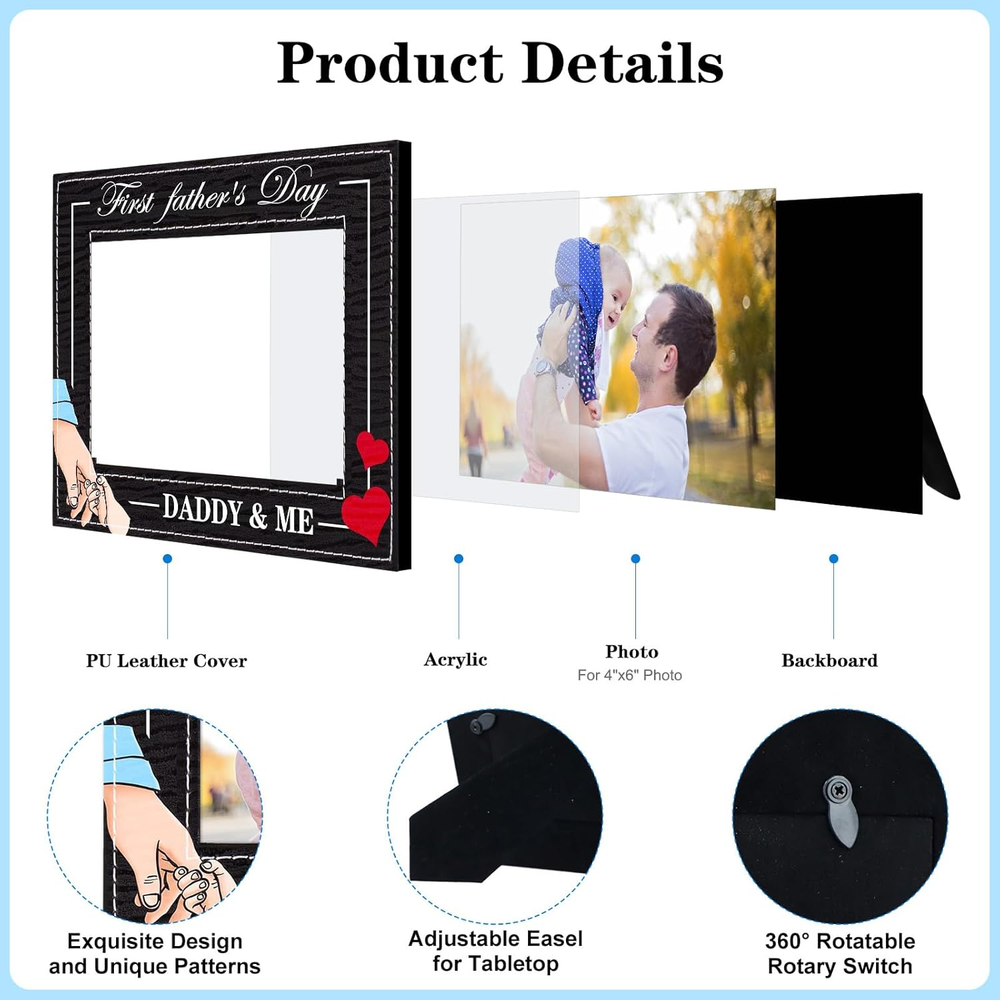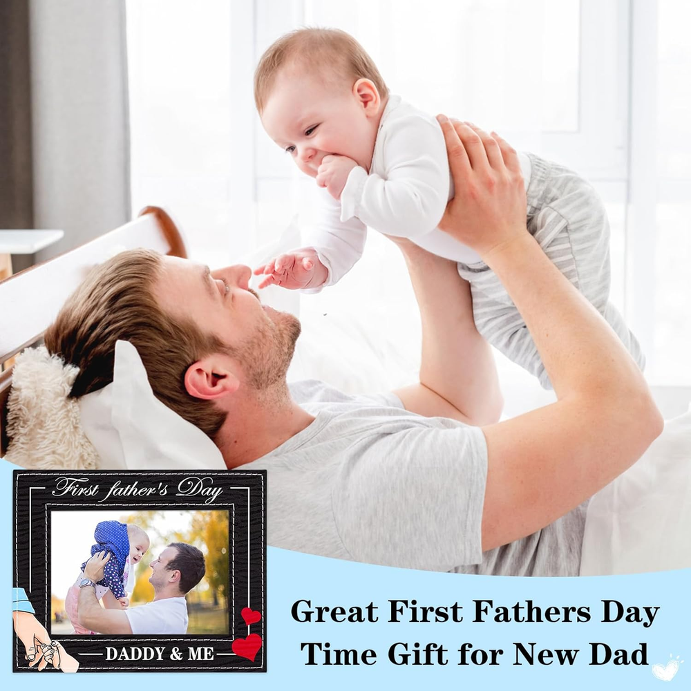 【Dad To Be Gifts for 1st Time Dad】: The 1st Fathers day frame from baby boy girl features a heart and father is holding the chirld's hand,and the daddy and me picture frame is printed with "first father's day daddy & me"that meaning the little kids forever need the father's love and company. Encased in a sturdy kraft paper box, designed to safeguard your frame during transit while delivering a friendly unboxing experience. 【Proper Size】: 1st fathers day frame size is 6.3x8.3 inches, insert photo about 4x6 inches. Celebrate the special bond between father and child. From the exquisite printing to the heartfelt message, this photo frame perfectly captures the essence of Dad's first Father's Day, providing cherish memories for first father's day. Great first fathers day gift from son daughter new born baby girl baby boy. This is a lasting and memorable Fathers day gift for expecting dad father to be. 【High-quality Material】: The new dad photo frame is made of MDF board with pu leather cover, sturdy and anti-fading,vintage classic design,durable and reusable,can be used for a long time. Provides a elegant design that complements any home nursery decor. Great nursery decor baby's room decor baby shower decorations. 【Easy to Use】: The 1st Father's day frame keepsake has a folding easel on the back, easy to put on table or desk. With Rotating Buttons, the best dad ever gift photo frame is easy for photo installation and change photos anytime. Whether it's for first time dad, dad to be, expecting dad, father to be daddy expectant dad, soon to be dad, the first Father's Day gift is sure to bring them joy and touch them. 【Showcase Precious Memories】:Makes a great gift for any occasions,such as: fathers day gifts for first time dad,daddy first fathers day gift from wife,new parents gift, new baby boy girl gift, newborn gift, new father gifts, new dad gift,daddy to be gift,first time daddy gifts,first fathers day frame from baby daughter or son. It also can be used for baby shower, birthday gift. Product Description