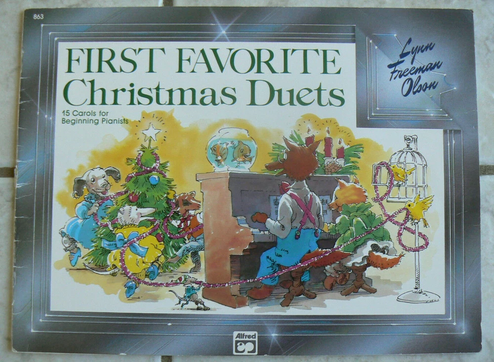 This listing is for a 1987 piano book titled First Favorite CHRISTMAS DUETS 15 Carols for Beginning Pianists Arranged by Lynn Freeman Olson " Find a partner and play the Christmas music that everyone loves. These fun and simple Christmas duets are enjoyable for both players since the melody moves from one part to another. " This 31-page softcover book is in very good condition with all pages crisp and sturdily bound; four of the pages have some notations on them. Please see the picture of the table of contents for the songs included here. You won't be disappointed! ~~~~~~~~~~~~ I'm listing MANY more books and other items. I'm happy to combine shipping. ~~~~~~~~~~~~~~~~~~~~~~~~~~~~ I normally mail ON the day I receive payment if it's received before 3 p.m. central time, and the next day if it's later than 3. Please take a look at my other listings; I'm listing many school books (and other items) and am happy to combine shipping! Items from smoke-free, pet-free home. Thanks so much for your time! Before leaving your feedback, if for any reason you feel I did not deserve or earn 5 stars in each category, please let me have the opportunity to make it right. I want every transaction to be 5-star worthy! Thanks so much! :)