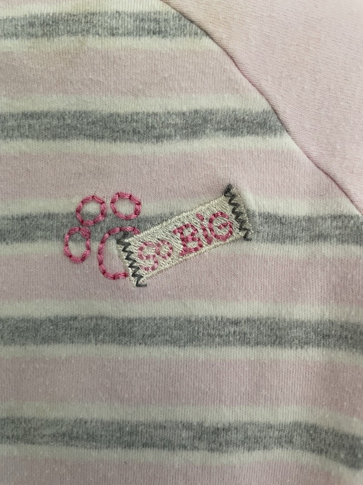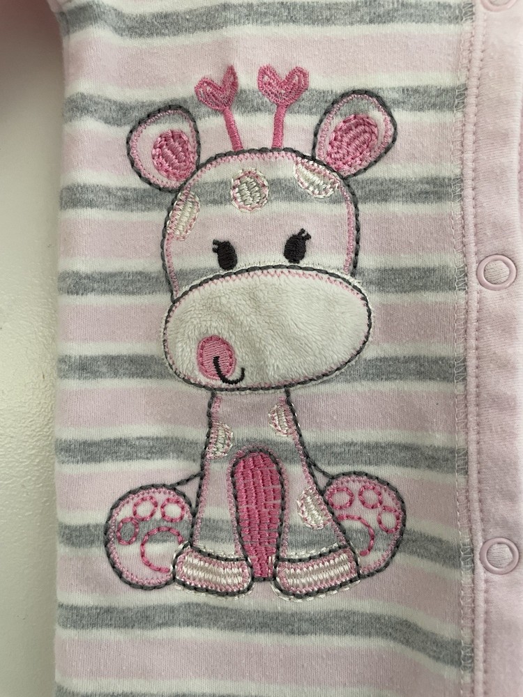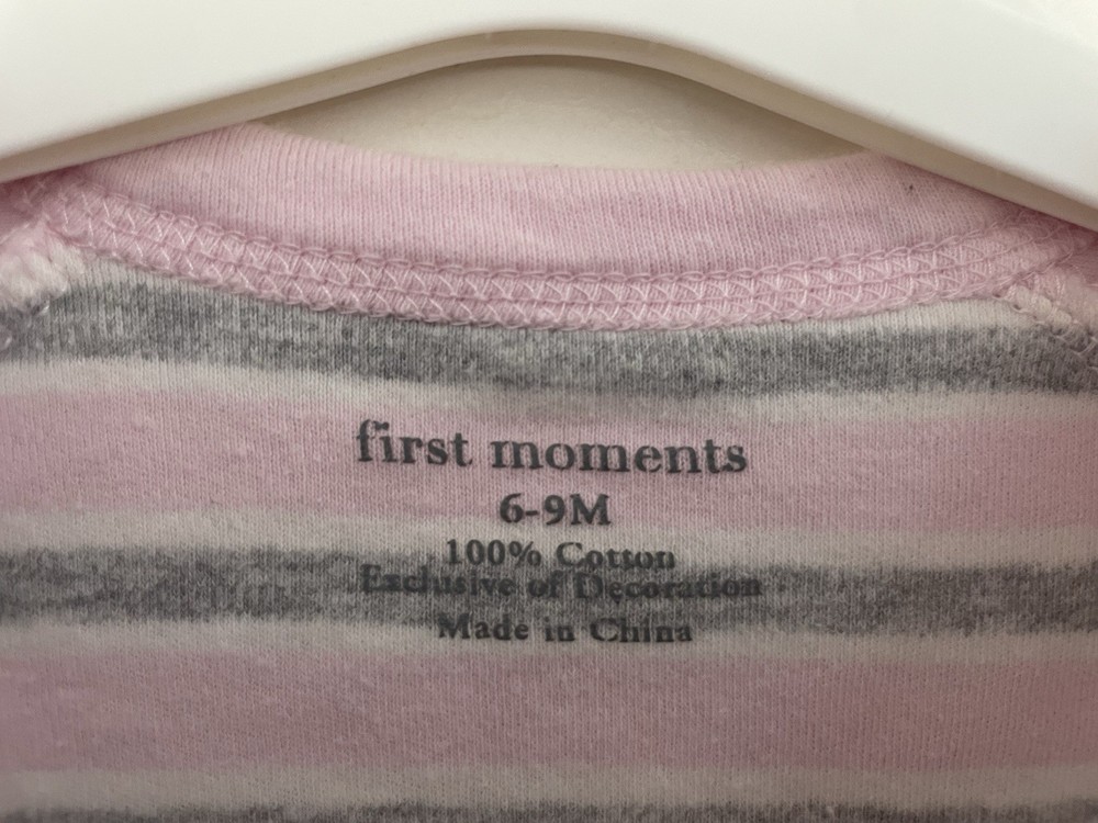 Material: 100% Cotton Country of Origin: China Closure: Snap Type: One-Piece Color: Pink Department: Girls Style: 1-Piece Theme: Animals, Giraffe Season: Fall, Spring, Winter Brand: First moments Size: 6-9 Months Pattern: Striped Sleeve Length: Long Sleeve Features: Comfort, Easy Care, Lightweight, Stretch Number of Pieces: 1 Piece Garment Care: Machine Washable Occasion: Casual Accents: Embroidered
