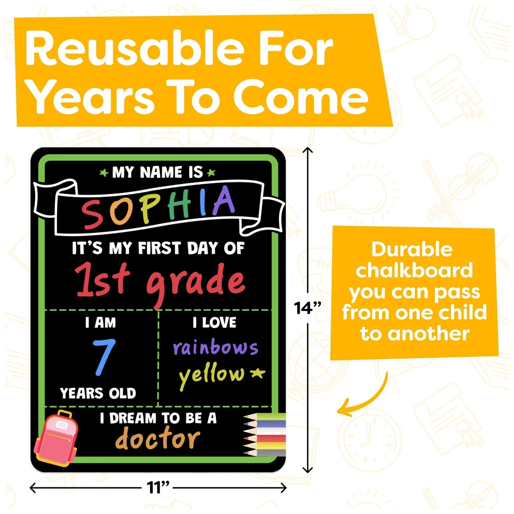 Double-sided first day of school board chalkboard sign sized 14”x11” with rounded corners. Great size for first day and last day of school sign photo ops with kids for memories that last a lifetime. Watch them grow and track changes in their likes and aspirations from kindergarten all the way to senior year. Make it a yearly tradition and never miss a milestone in your child’s life. Fun, eye-catching designs make photos stand out. Give them to loved ones as first day of school gifts and watch them share “My First Day of School” photos and get compliments from friends and family. Capture Lasting Memories: Our First Day Of School Sign, a large double-sided 14”x11” chalkboard with rounded edges. Capture milestones and document your child’s growth. Commemorate your child’s first day of kindergarten, preschool, 1st grade or any grade with a photo prop ideal for photo sessions. 6 Liquid Chalk Markers Included! Easily erasable with damp cloth, non-toxic chalkboard markers. Everything included to make it easy for parents, teachers and guardians who want to personalize a first day keepsake memento. Sturdy & reusable 2mm-thick boards. Fun first and last day of school board for your back to school supplies & needs. Your child can easily customize it with their personality & preferences. A durable activity that can last for multiple years, so you can create your own family traditions. Double-Sided back-to-back printing, our first day of school board offers convenient storage, saving space and reducing clutter in your home. Add a festive touch to your back-to-school decorations with our sign. Give as a gift & get compliments from friends & family as they share “My First Day of School” photos. Celebrate a return to school or the start of school by creating a memorable yearly tradition & never miss a milestone in your child's educational journey. Order now!