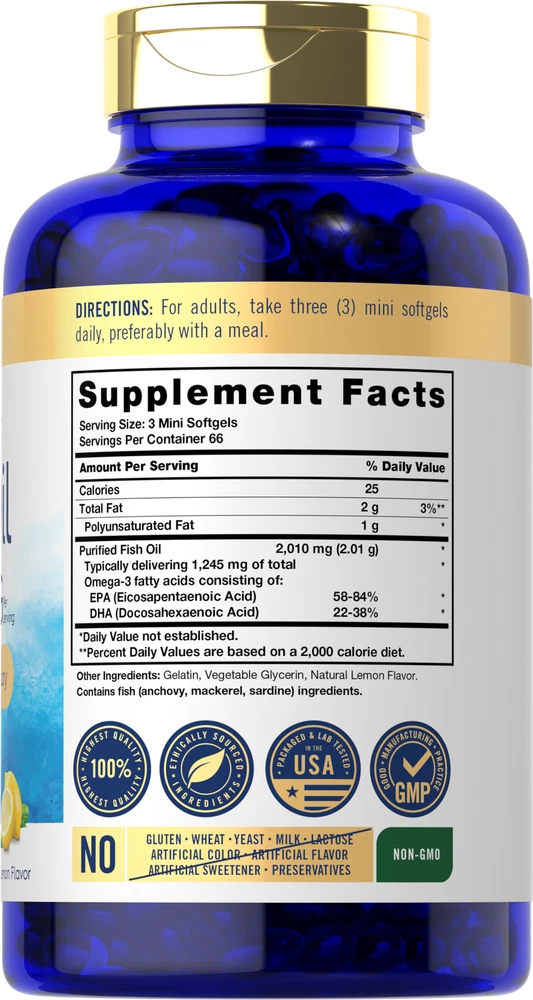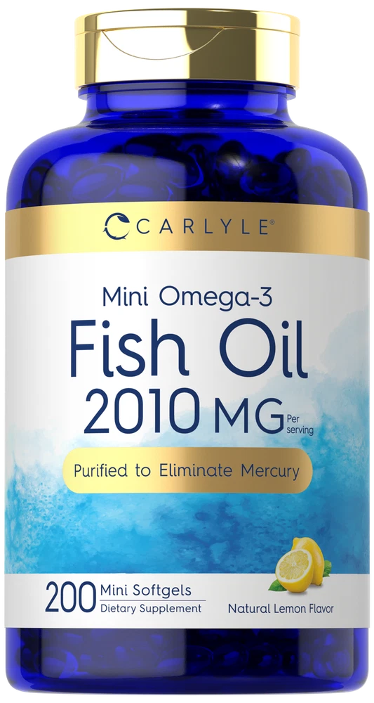Supplementing with Fish Oil: Research shows that a diet containing an abundance of fatty fish can have many nutritional benefits. This is because oil from fish contains Omega-3 essential fatty acids EPA and DHA. Fish oil product forms such as capsules, liquid, and tablets are recommended for those looking to supplement a strong diet. Carlyle Mini Omega-3 Fish Oil: Get the benefits of Omega-3 fish oil, now in small & easy-to-swallow softgels, with Carlyle Mini Omega-3 Fish Oil. These perfect half sized minis provide 2010 mg of Fish Oil per serving, and are a premium source of naturally occurring DHA & EPA which are great for men or women. Our fish oil is purified to eliminate mercury to ensure pristine purity and quality, with natural lemon flavor for you to enjoy! Rooted in Wellness: Our expertise in sourcing the purest ingredients combined with advanced technologies makes us proud to deliver premium, honest supplements at the best value. Carlyle Mini Omega-3 Fish Oil is a testament to our commitment to excellence, made with powerful ingredients rooted in wellness. Thanks for choosing us in your pursuit of living healthy. WARNING: If you are pregnant, nursing, taking any medications, including blood thinners, planning any medical or surgical procedure or have any medical condition, consult your doctor before use. If any adverse reactions occur, immediately stop using this product and consult your doctor. If seal under cap is damaged or missing, do not use. Keep out of reach of children. Store in a cool, dry place.