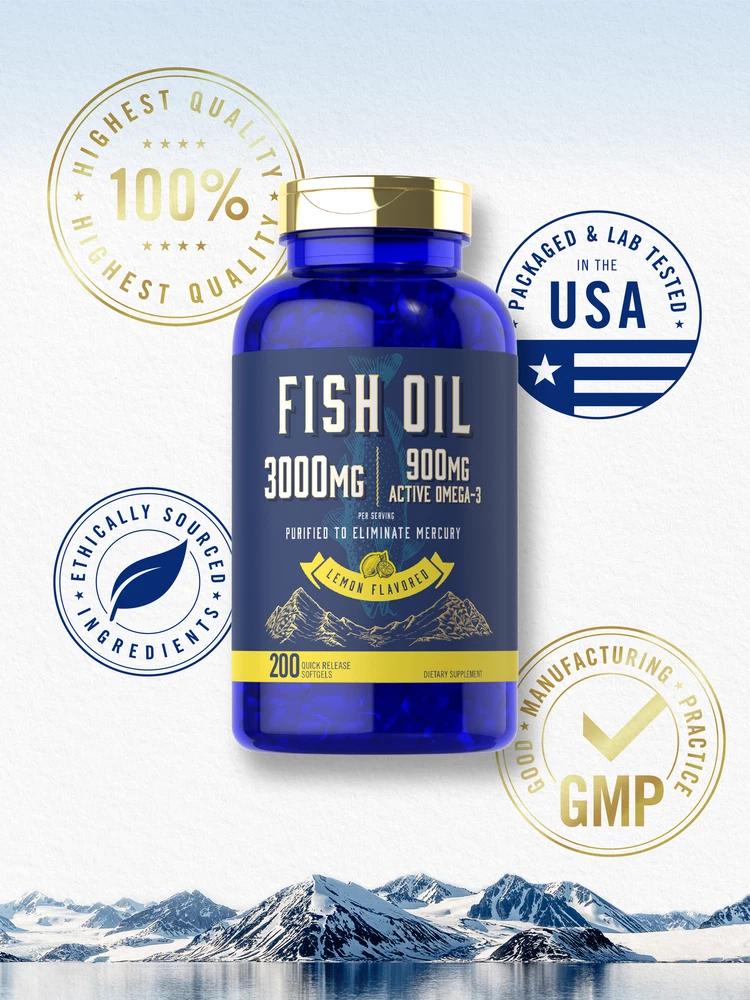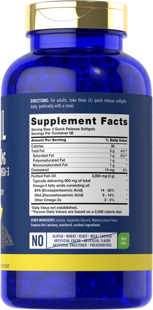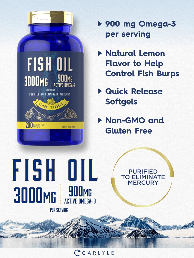 Supplementing with Fish Oil: Research shows that a diet containing an abundance of fatty fish can have many nutritional benefits. This is because oil from fish contains beneficial, naturally occuring Omega-3 essential fatty acids EPA and DHA. Fish oil now comes in forms such as capsules, liquid drops, gummies and tablets, and is recommended for men and women looking to supplement a strong diet. Carlyle Omega-3 Fish Oil: Get all the best nutritional benefits of Fish Oil now in easy-to-swallow softgels! Our high potency formula provides 3,000 of Fish Oil per serving and is a premium source of naturally occurring DHA & EPA. Our fish oil is purified, eliminating mercury to ensure pristine purity and high quality, with natural lemon flavor for you to enjoy! Rooted in Wellness: Our expertise in sourcing the purest ingredients combined with advanced technologies makes us proud to deliver premium, honest supplements at the best value. Our bottle of Omega-3 Fish Oil is a small testament to our commitment to excellence, made with powerful ingredients rooted in wellness. Thanks for choosing us in your pursuit of living healthy. WARNING: If you are pregnant, nursing, taking any medications, including blood thinners, planning any medical or surgical procedure or have any medical condition, consult your doctor before use. If any adverse reactions occur, immediately stop using this product and consult your doctor. If seal under cap is damaged or missing, do not use. Keep out of reach of children. Store in a cool, dry place.