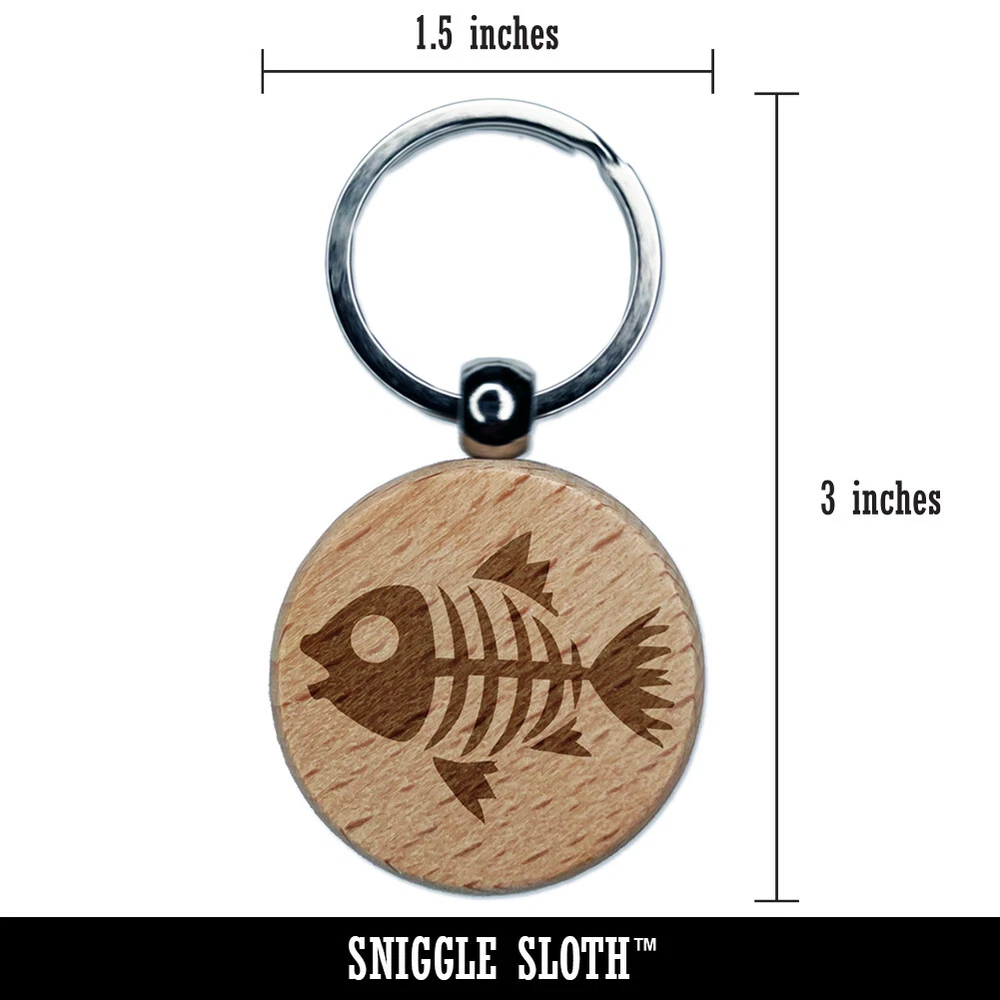 Fish Skeleton Bones Engraved Wood Round Keychain Tag Charm