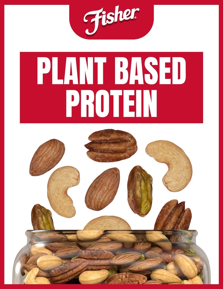 Convenient Snacking ─ Contains 1, 24-ounce reusable canister of Fisher Oven Roasted Never Fried Deluxe Mixed Nuts, an ideal snack to keep on hand for busy days on-the-go, at work, at home, or in between meals Savory & Guilt-Free ─Why is oven dry roasted better? Unlike some other nuts, Oven Roasted Never Fried is not fried in oil. Roasted and sprinkled with sea salt, they deliver a clean, fresh taste. With no artificial ingredients or GMOs, they are guilt free Simple Ingredients ─ Deluxe Mixed Nuts is crafted with only two ingredients: nuts and sea salt. Each serving contains 5g of plant-based protein (6% DV) and is a good source of 7 vitamins and minerals, offering a wholesome choice to satisfy your cravings Pantry Essential ─ Whether you just want a quick treat or are hosting a party or get-together, Oven Roasted Never Fried is a pantry essential. You and your family can enjoy the salty and crunchy goodness while also maintaining a vegan or gluten free diet About Fisher – For 100 years, we have been bringing customers freshness and quality they can trust. We oversee the entire product journey, from orchard to kitchen. Fisher is your home for a complete assortment of snack nuts, trail mixes, and baking nuts Elevate your snacking experience with the Fisher Snack Oven Roasted Never Fried Deluxe Mixed Nuts. Each jar contains 24 ounces of savory goodness, featuring a delicious mix of premium nuts. This wholesome snack is perfect for the busy days when you're on-the-go, at work, at home, or in need of a satisfying bite in between meals. With Oven Roasted Never Fried, you're indulging in a guilt-free delight, as they are Non-GMO Project verified and do not contain any added oil, artificial ingredients or preservatives. Our commitment to simplicity shines through in the ingredients we use. With Fisher Snack nuts, you get only the best, just the goodness of nuts and a touch of sea salt. This straightforward approach makes these Oven Roasted Never Fried nuts a wholesome choice to satisfy your cravings, whether you're seeking a quick treat or a delightful addition to your next party or get-together. Experience Fisher's other quality selections such as snack nuts, nut mixes, trail mixes and salad toppings. Fisher Snack nuts are more than just a snack; they're a pantry essential. Bursting with nourishing goodness, delightful flavors, and that distinctive crunch you desire, they cater to your taste buds and your well-being. For a century, Fisher Nuts has upheld a commitment to quality, ensuring that the journey of their products, from their farms to your kitchen, results in the perfect snacking experience. Make Fisher Snack nuts your go-to choice and upgrade quality today!