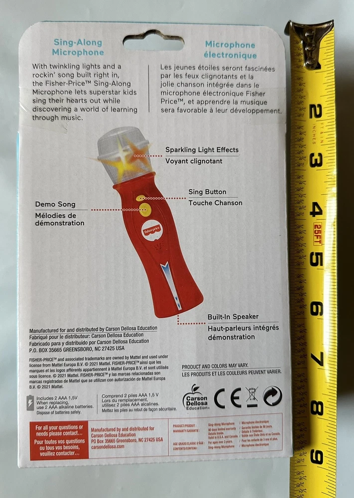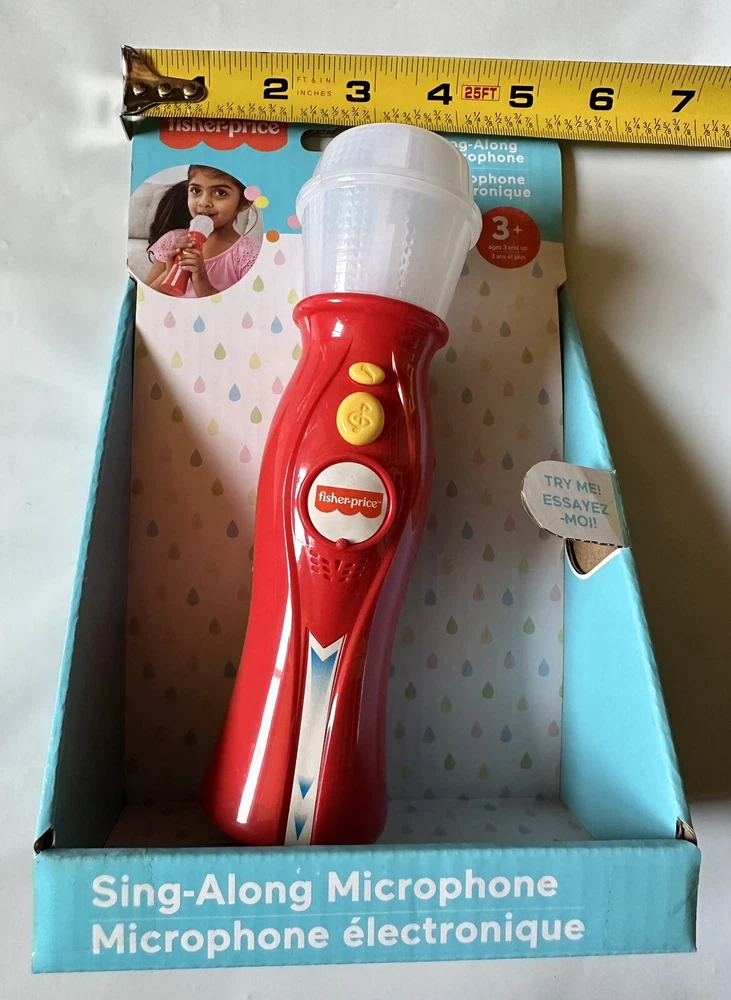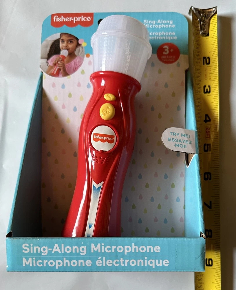 This sing-along microphone is sure to dazzle with sparkling lights and melodies. It features a built-in speaker and microphone. Brand Name: Fisher Price Features: • Uses 2 AAA batteries (included) • For ages 3 and up • Great for gifting Special Features: Sparkling lights, Melodies and light effects, Built-in speaker and microphone, Try-me function Specifications: Product Type: Musical Toys Assembly Details: Fully Assembled Includes: 2 x "AAA" size batteries Ages: 3+ Overall Width: 6.75 inch Overall Depth: 2.25 inch Overall Height: 7.875 inch * Handling: Will usually ships within 24 hours. * Pictures are of the actual item you will be receiving.* ****If you have any questions, or concerns, please ask. *** If there is any problem, PLEASE contact BEFORE leaving any Neutral / Negative Feedback. So that we have the opportunity to fix the problem. ***