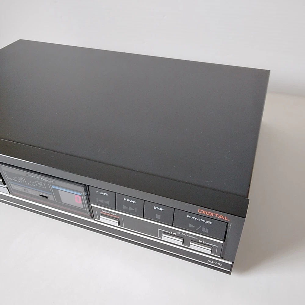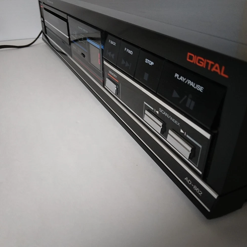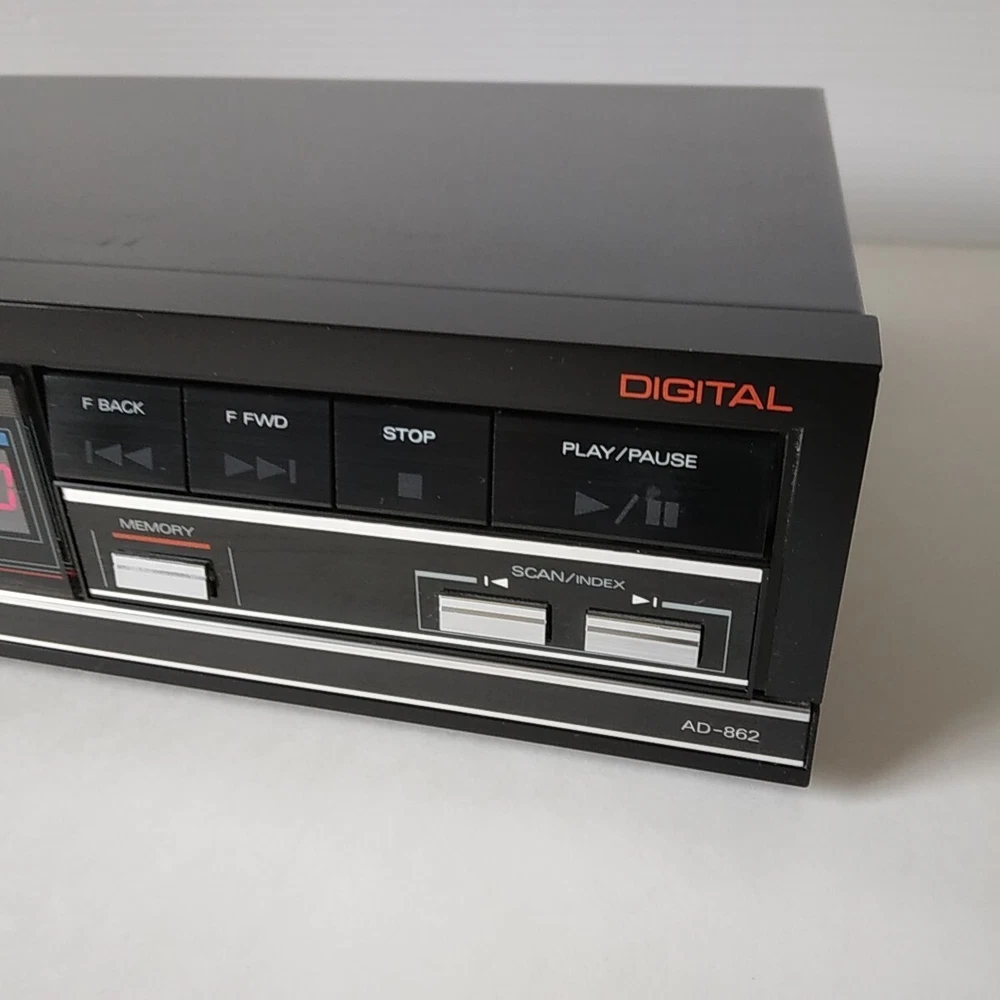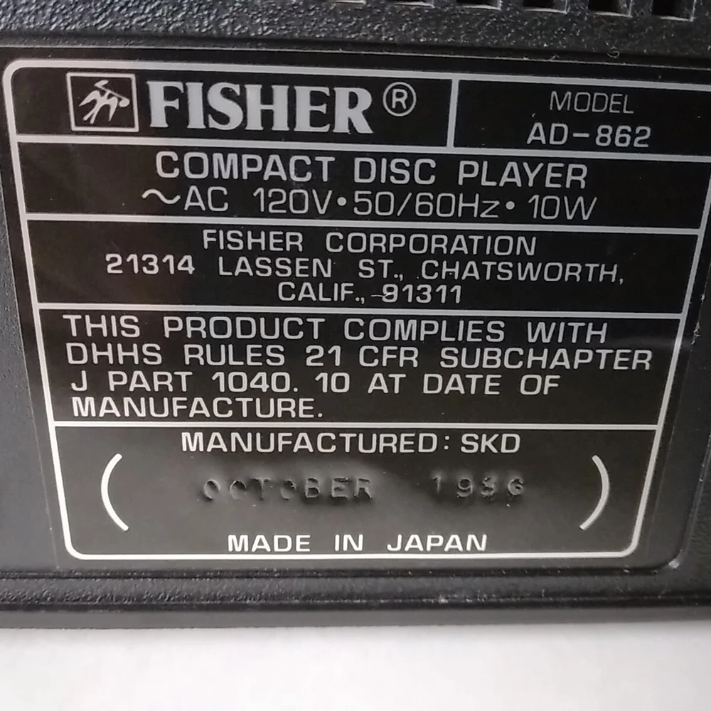Fisher Studio Standard Model: AD-862. Made in Japan 1986. This shelf CD player has been tested (with speakers) on all functions and works well. 3rd photo shows testing with a small active speaker. Pictures 4 to 9 show a CD playing in the unit. This CD player is in very good cosmetic condition all around with minimal scratches. See pictures for a detailed look. Item will ship well protected. Thanks for the interest in this unit.
