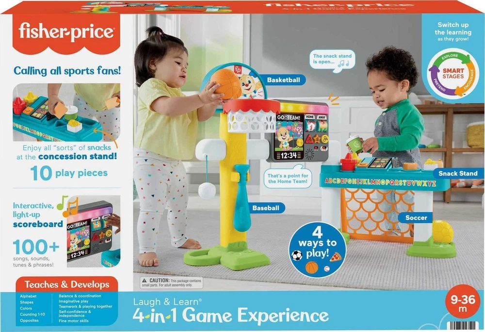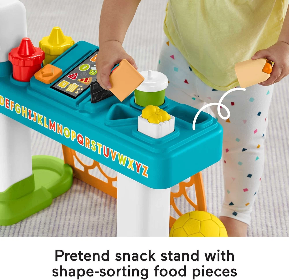 Fisher-Price Toddler Learning Toy Laugh & Learn 4-in-1 Game Experience Sports Activity Center with Smart Stages for Infants Ages 9+ Months 4 ways to play! Basketball, soccer, and baseball sports toys plus pretend concession stand and light-up interactive scoreboard 3 Smart Stages learning levels teach the alphabet, counting 1-10, colors, shapes, and teamwork Comes with 10 removable play pieces, including 2 balls, baseball bat, 4 shape-sorting food pieces, 2 condiment pieces, and a pretend credit card Press the buttons or spin the rollers on the scoreboard to activate 100+ songs, sounds and phrases Educational toy for baby and toddler sports fans ages 9 months to 3 years old
