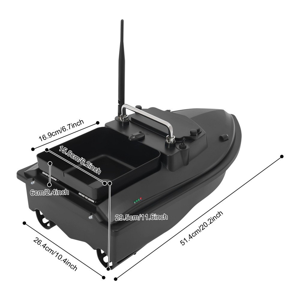 welcome to harebellaf Description To bring more convenience and fun to fishing enthusiasts, we recommend you this fishing bait boat. This is the product that will satisfy your fishing needs on the water. You can use our product to bring hooks and lures wherever you need them for precise casting and efficient fishing. Key Features Build to Last: The product is made of ABS and stainless steel with a process of water transfer, featuring sturdy , high abrasion resistance, anti-corrosion, and anti-rust. Dual Motor: Equipped with dual-motor configuration, it allows the dual-motor function to effectively make corrections in the event of yawing during the vessel's exercise. Low Battery Alarm: When the ship's battery is in a low power state, the remote control will emit a warning sound to prevent the ship from being lost. Long Transmission Distance : The boat's antenna is able to receive signals stably, regardless of weather and environmental interference, and can achieve remote control distances of up to 1640.4 feet, greatly expanding its range of applications. Easy to Operate : It is more convenient to operate with the remote control. All you need to do is switch on the cruise button to keep the boat moving in a straight line at a constant speed. You can also adjust the forward direction of the boat with the joystick. One Drop : This fishing bait boat is a tipping bucket type single bin, it can be directly flipped when you reach your destination and drop the bait at once, which is easy and convenient to use. Low Resistance : The product belongs to a streamlined shape, which can reduce the resistance of the bait boat, make the boat run more smoothly and quickly in a force of 3-4 wind , and then improve your fishing efficiency. Easy to Carry and Store: The product is lightweight( 12.76lbs ) and small in size( 20.2*10.4*11.6in ), making it easy for you to carry it on the go. It won't take up too much space when you store it. Ideal Gift: The boat symbolizes smooth sailing, peace, and good luck. With its exquisite appearance, this black-coloured bait boat is one of the best gifts for fishing enthusiasts. You can give it as a gift to your family, friends, and coworkers on Thanksgiving, Christmas, and other holidays. Customer Service: We aim to provide quality products and services. If you have any problems, please feel free to contact us. We will reply and solve the problem for you as soon as possible. Details Indicator Light: The power indicator light is convenient for you to observe whether the bait boat is powered or not, and the night fishing indicator lights allow you to see the position of the bait boat even after it is launched at night. Propeller: The upgraded high-efficiency three-blade propeller provides strong power and faster speed. Handle: The stainless steel handle is strong and durable, which can effectively resist corrosion, and it can also be folded, providing great convenience for you to carry and use the bait boat. Anti-Tangle Baffle : The propeller of the boat is surrounded by baffle plates, which can effectively reduce the phenomenon of entanglement of water plants. Dual Battery Power: The extra-large battery compartment that holds two batteries features dual power cables that support connecting two batteries at the same time, thus doubling the time of use. Application This product is generally suitable for use within large areas of water, such as large reservoirs, lakes, and seas. It is also suitable for fishing enthusiasts or those who want to fish from a distance. Specifications Material: ABS, Stainless Steel Color: Black Surface Treatment: Water Transfer Bin Capacity: 1.5kg/ 3.31lbs Battery Type: 2* 5200 mAh Lithium Battery(Included) Endurance: About 2-3h Speed: 1m/3.28 ft/s Remote Control Distance: About 500m/1640.4 ft Wind and Wave Resistance Level: 3-4 Charger Model: CT-84100 Input: AC100-240V, 50/60Hz Output: 7.4V, 1A Plug Type: US Standard Assembly Required: Yes Length of Antenna: 13.5cm/ 5.31inch Bait Storehouse Size: 15.8*16.9*6cm/ 6.22 * 6.65 * 2.36 inch Battery Compartment Size: 12.1*6.1*8cm/4.8*2.4*3.1inch Gross Weight: 6.10kg/ 13.45lbs Net Weight: 5.79kg/12.76lbs Product Size: 51.4*26.4*29.5cm /20.2*10.4*11.6in Package Size: 53*31.5*26cm/ 20.87*12.4*10.24inch Package Included 1* Fishing Bait Boat 1* Remote Control 1* Antenna 1* Charger 1*English Manual 1* Portable Bag All Accessories for Assembly Notes Please check the boat to see if everything is ready to get it run before putting it on the pool/lake/river. This is a sophisticated hobby product and not a toy. It must be operated with caution. Please allow the slight color difference caused by the shooting light and 1-3cm error due to manual measurement, and make sure you do not mind before you order. Payment Delivery details Terms of sales About us Contact us Payment We accept ebay payment 。 Fees such as import duties, taxes are not included in the item price or shipping costs. These charges are the buyer's responsibility. Delivery details Shipping: 2-9 working days to: USA Terms of sales We maintain high standards of excellence and strive for hundred percent customer satisfaction. Feedback is very important to us. We hope that you contact us immediately before you give neutral or negative feedback, so that we can address your concerns. It is impossible to address issues if we do not know about them! About us Your satis faction is our ultimate goal. We work hard to earn your trust and future business. Our certified technicians have tested each item before shipping. The unit comes with 1 year limited warranty on all manufacturing defects. a) If you receive a defective item, you may return it or ask for a discount. Please contact us within 14 days after you receive the package. b) What you returned must be intact and in its original packaging as re? u. Customer is responsible for shipping costs of the returned item. c) We will cover the cost of shipping back t with the shipping rate indicated in the registration p