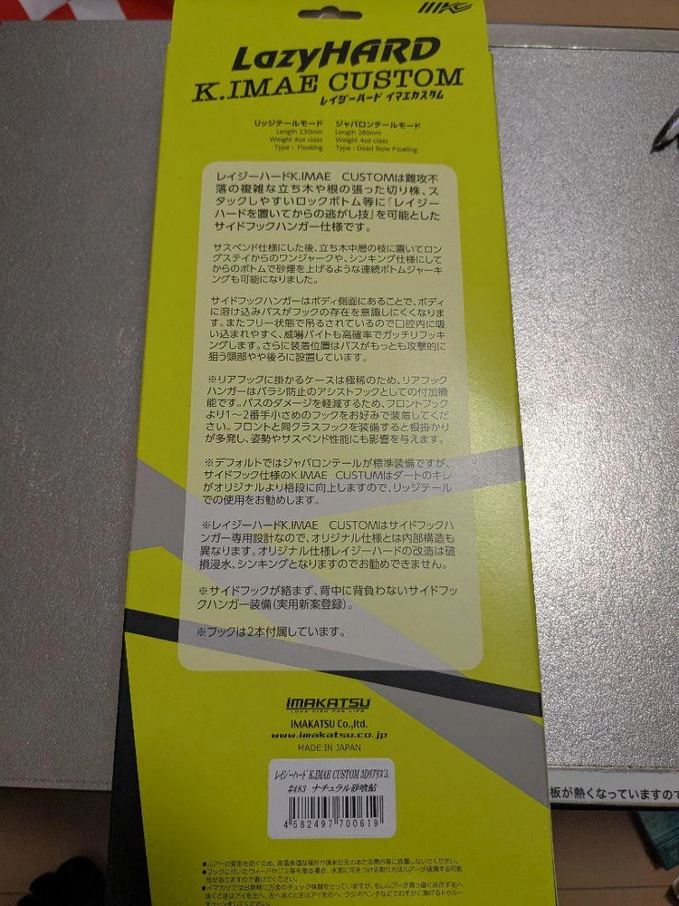 Item Title Fishing Lure Imakatsu Lazyhard K. Imae Custom Payment Supports managed payments Please pay within 5 days after auction is finished. About Us We are located in Japan. It's our pleasure to make you happy by proposing our recommend item. If you have any questions or request about items, please feel free to ask us. International Buyers - Please Note: -Import duties, taxes, and charges are not included in the item price or shipping charges. These charges are the buyer's responsibility. -Please check with your country's customs office to determine what these additional costs will be prior to bidding/buying. -These charges are normally collected by the delivering freight (shipping) company or when you pick the item up - do not confuse them for additional shipping charges. -We do not mark merchandise values below value or mark items as - gifts - The US and International government regulations prohibit such behavior. Thank you for your understanding.
