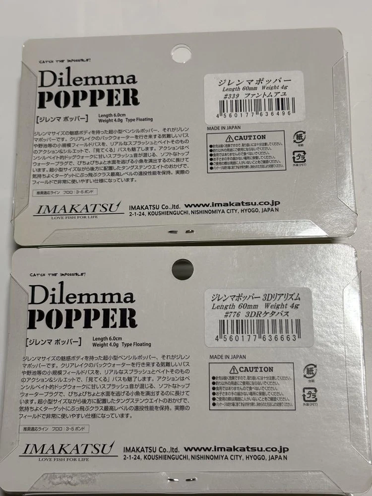 Item Title Fishing Lure Imakatsu Lure Set Giremma Popper 60 Phantomuayu 3Dr Ketabas Payment Supports managed payments Please pay within 5 days after auction is finished. About Us We are located in Japan. It's our pleasure to make you happy by proposing our recommend item. If you have any questions or request about items, please feel free to ask us. International Buyers - Please Note: -Import duties, taxes, and charges are not included in the item price or shipping charges. These charges are the buyer's responsibility. -Please check with your country's customs office to determine what these additional costs will be prior to bidding/buying. -These charges are normally collected by the delivering freight (shipping) company or when you pick the item up - do not confuse them for additional shipping charges. -We do not mark merchandise values below value or mark items as - gifts - The US and International government regulations prohibit such behavior. Thank you for your understanding.