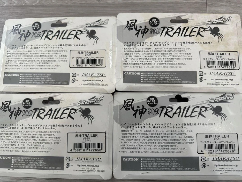 Item Title Fishing Lure Imakatsu Old Fujin Spider Trailer Set Payment Supports managed payments Please pay within 5 days after auction is finished. About Us We are located in Japan. It's our pleasure to make you happy by proposing our recommend item. If you have any questions or request about items, please feel free to ask us. International Buyers - Please Note: -Import duties, taxes, and charges are not included in the item price or shipping charges. These charges are the buyer's responsibility. -Please check with your country's customs office to determine what these additional costs will be prior to bidding/buying. -These charges are normally collected by the delivering freight (shipping) company or when you pick the item up - do not confuse them for additional shipping charges. -We do not mark merchandise values below value or mark items as - gifts - The US and International government regulations prohibit such behavior. Thank you for your understanding.