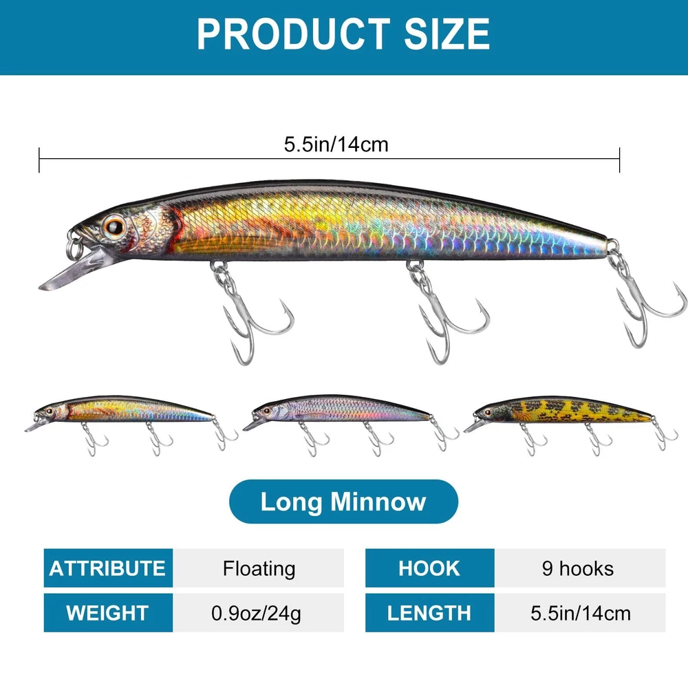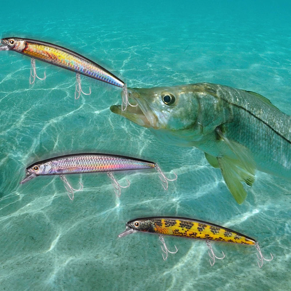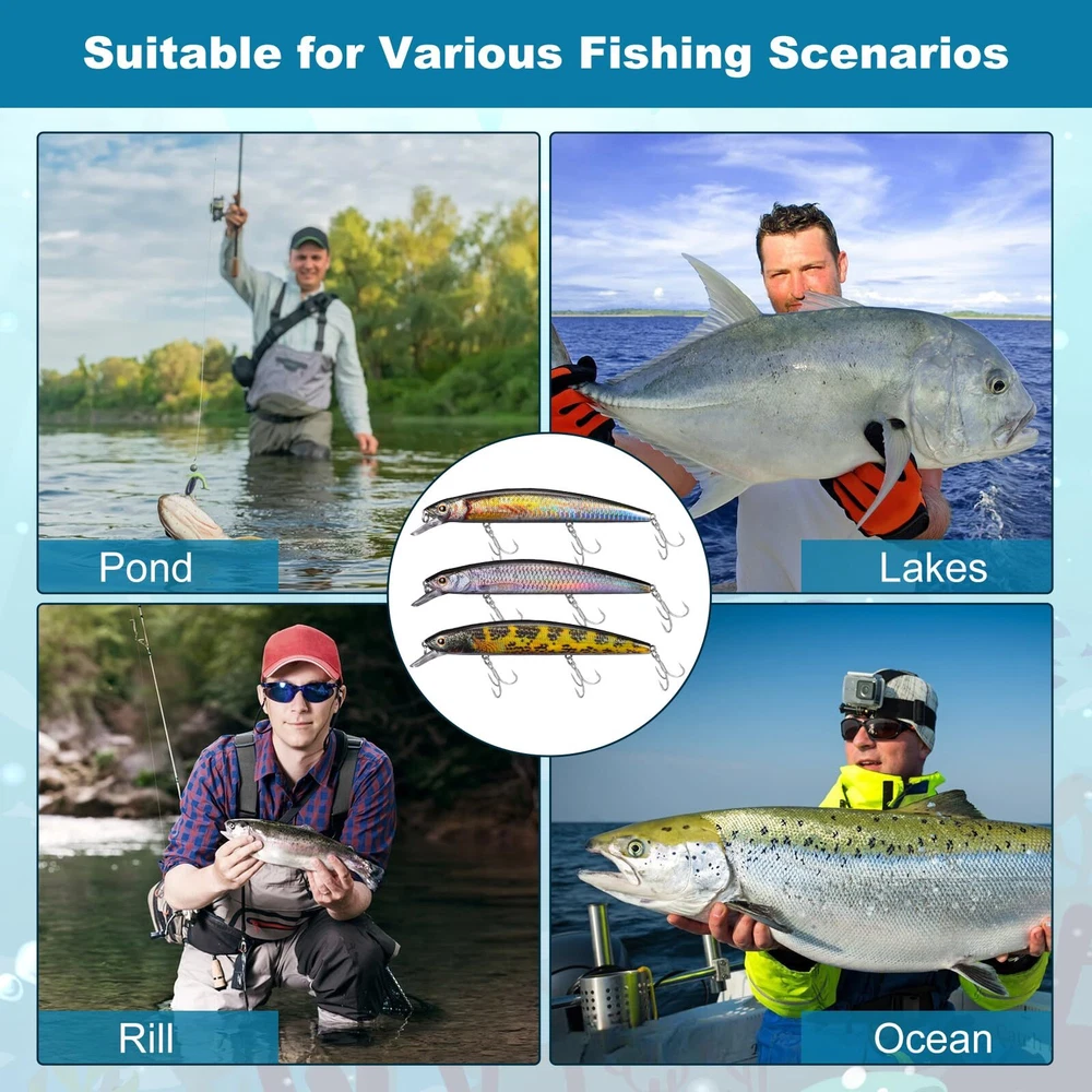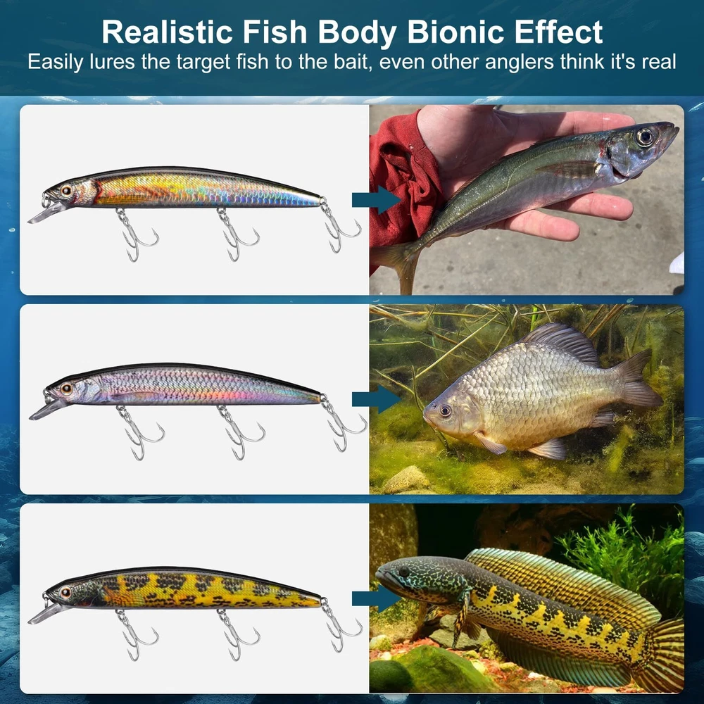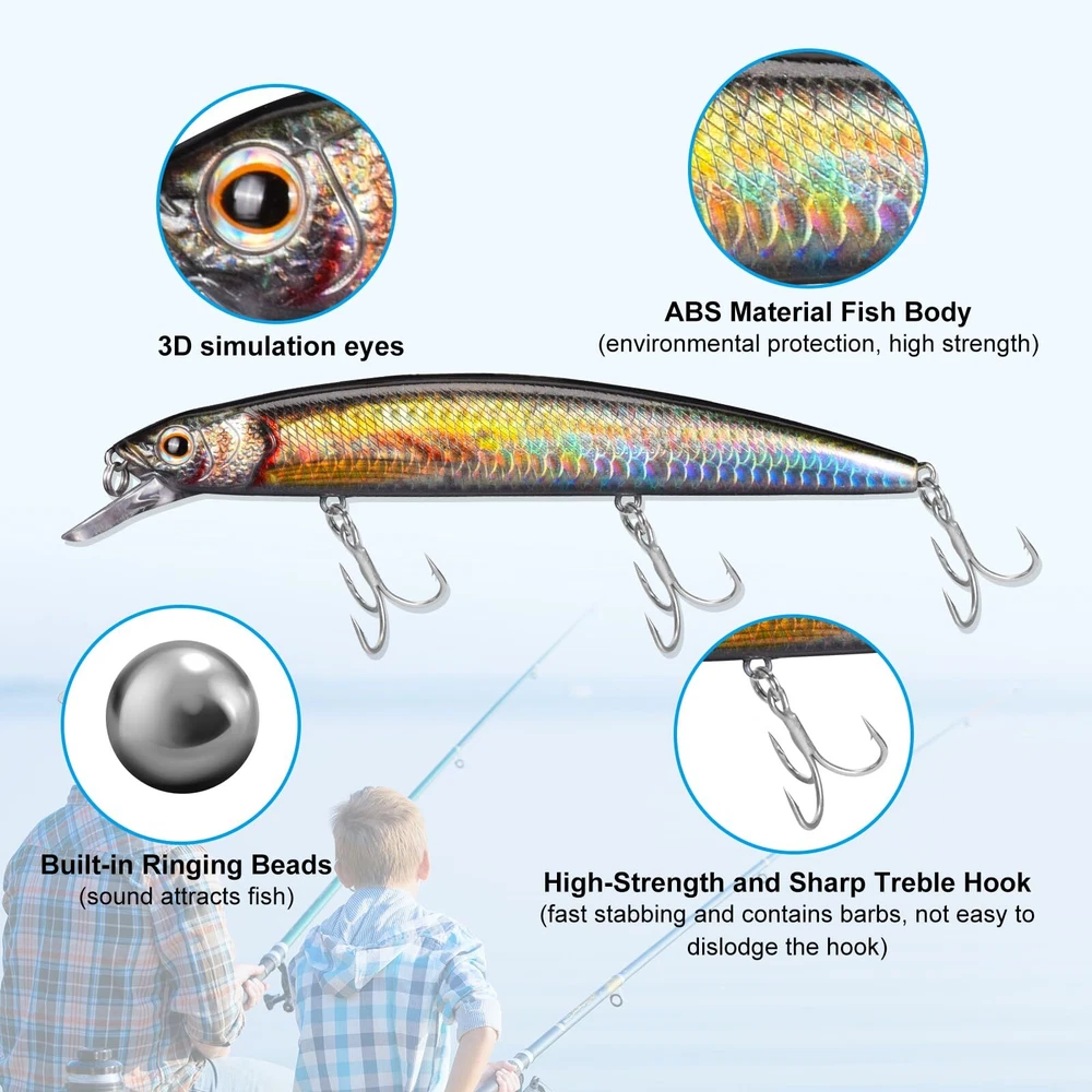 Fishing Lures for Freshwater Saltwater, Slow Sinking Minnow Bass Lures, Shining and Lifelike Fishing Baits to Improve Fishing Efficiency, Fishing Gear for Father and Suitable Gifts for Men Made of High-Quality ABS Material: the surface of the jerkbait is highly wear-resistant, Equipped with 3D realistic eyes and the fishing lures has a built-in rattle. The fishing baits will make noise underwater to attract fish to bite the hook. Lifelike Swimming Posture: Each saltwater fishing lures has been tested hundreds of times. The swimming posture of the bass lures is lifelike and makes the fish relax their vigilance, It is difficult to distinguish whether it is lures or real fish. Strong and Sharp Hooks: Crankbait are equipped with sharp and rust-proof treble hooks, which can easily hit fish, and the barbed design makes it difficult for fish to escape, improving your fishing efficiency. 1:1 Bionic Design: The fishing lures are designed 1:1 against real fish. The colors on the surface of the fishing baits are very similar to real fish. This bionic design makes the lures look like a real fish when swimming and attracting fish to bite. Variety of Target Fish and Waters: Suitable for catfish, perch, bass, redfish, trout, bream, muskie, walleye etc. Depending on your operation, lures can search in different water layers, It is suitable for freshwater and saltwater.