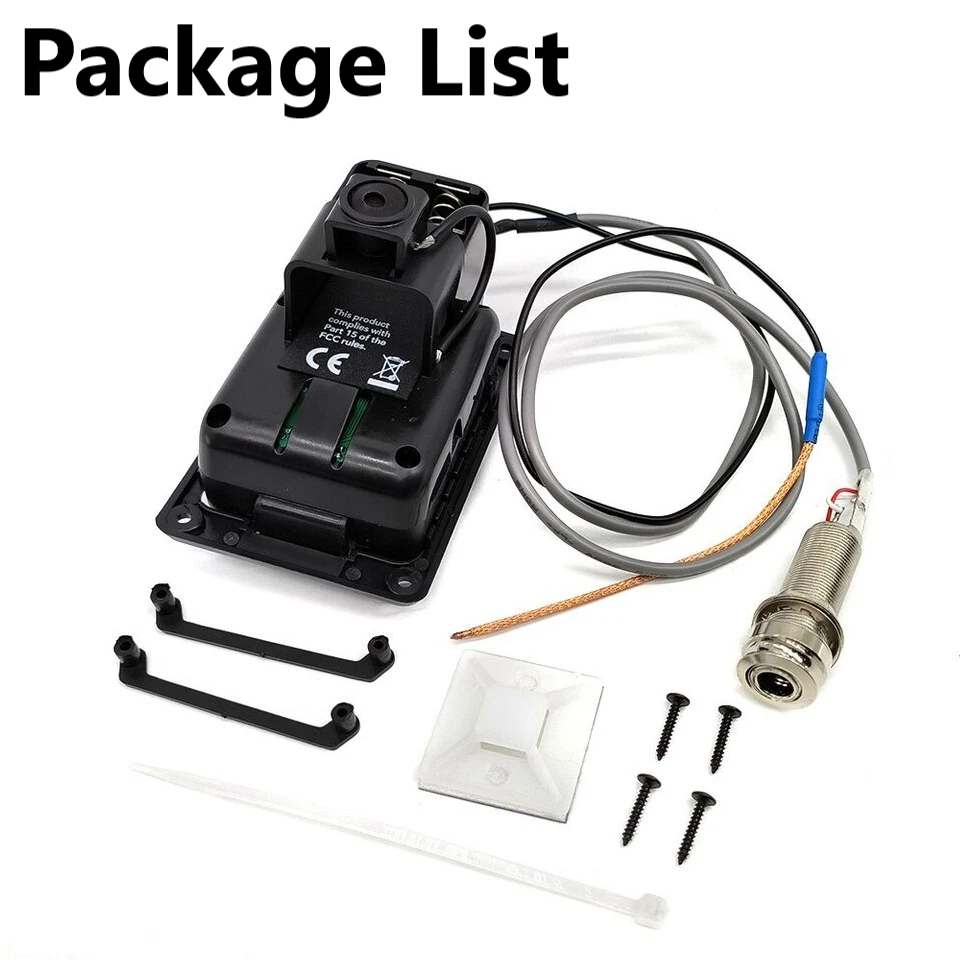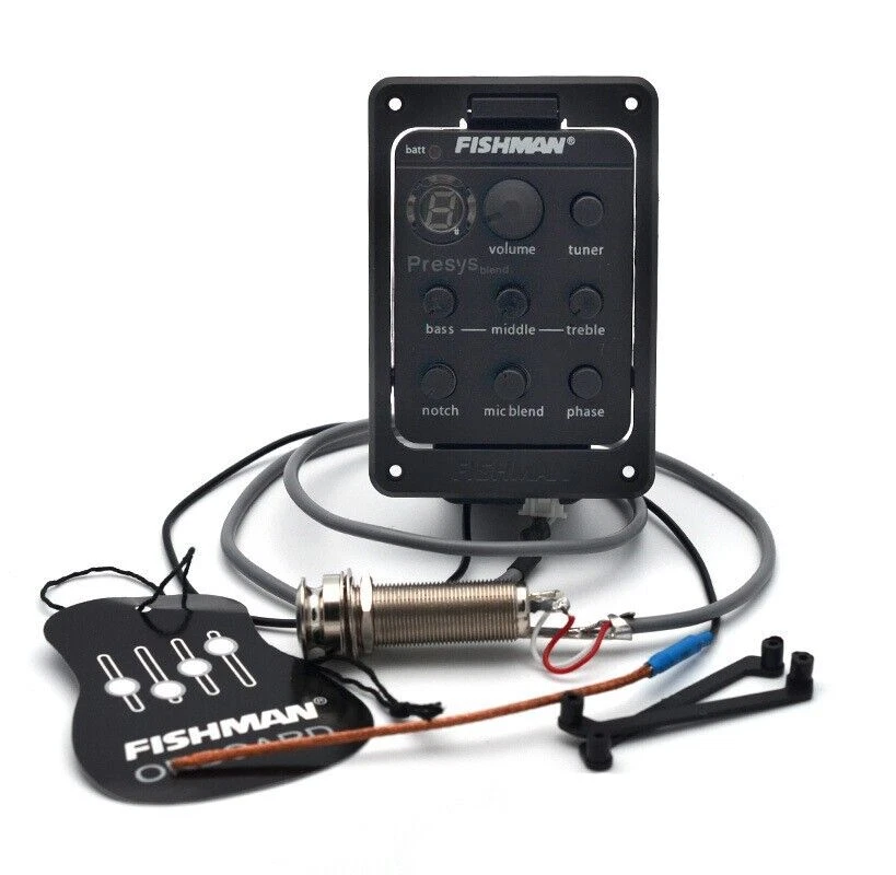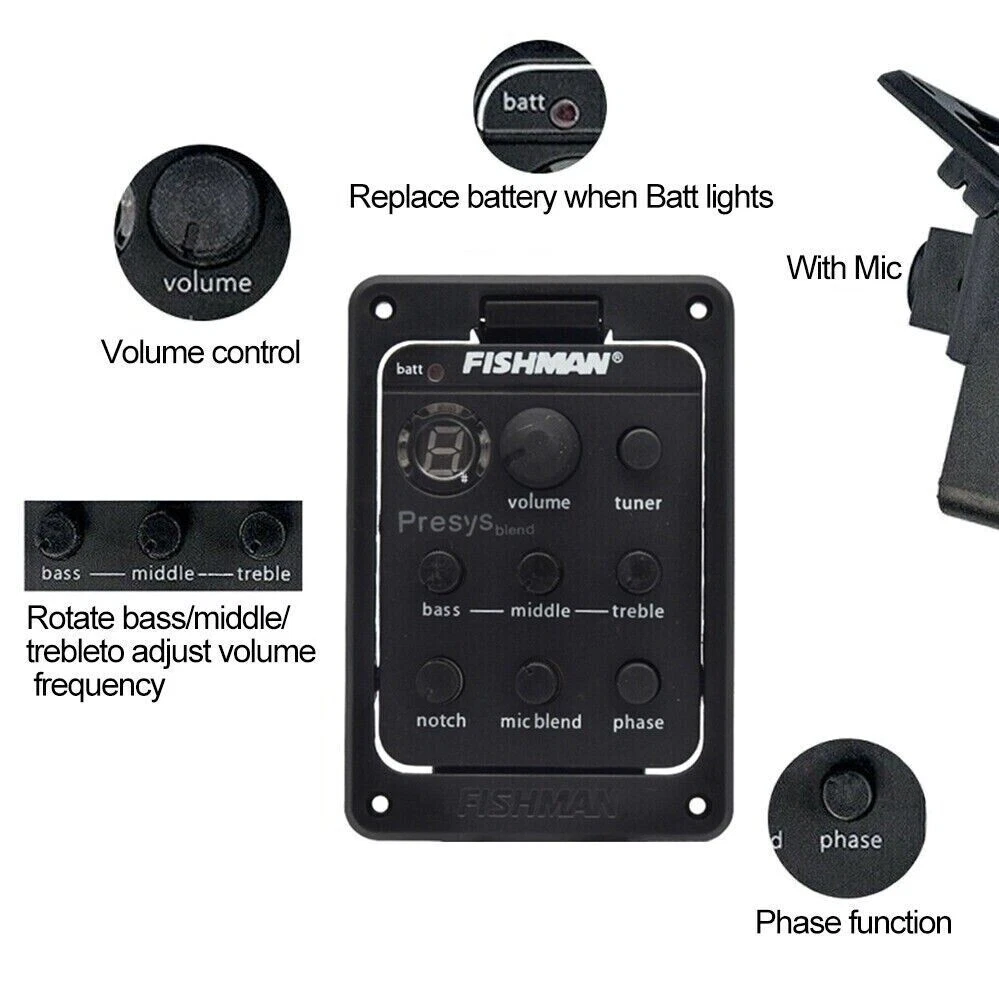 FISHMAN Presys 301 Guitar Pickups Mic Blend Dual Model Preamp Tuner Piezo Pickup 2.20" W x 3.3" L x 1.625" D (55.8mm x 84.2mm x 41.3mm) Hole size: 2.0" W x 2.662" L (50.8mm x 67.62mm) Screw spacing: 1.785" W x 2.795" L (45.34mm x 71mm) Package size: 24 x 16 x 5.2cm / 9.4 x 6.3 x 2inch Package weight: 117g / 4.1oz Part. No.: PSY-301 Features: 4-band equalizer, rotate bass/middle/treble to adjust volume frequency. With phase and tuner function. Tone and volume control. LED for battery check, replace battery when Batt lights. Built-in microphone with mic blend level control. Unique pivot design for instant 9-Volt battery access. Powered by a 9V battery (not included). Package List: 1set * 301 guitar pickups