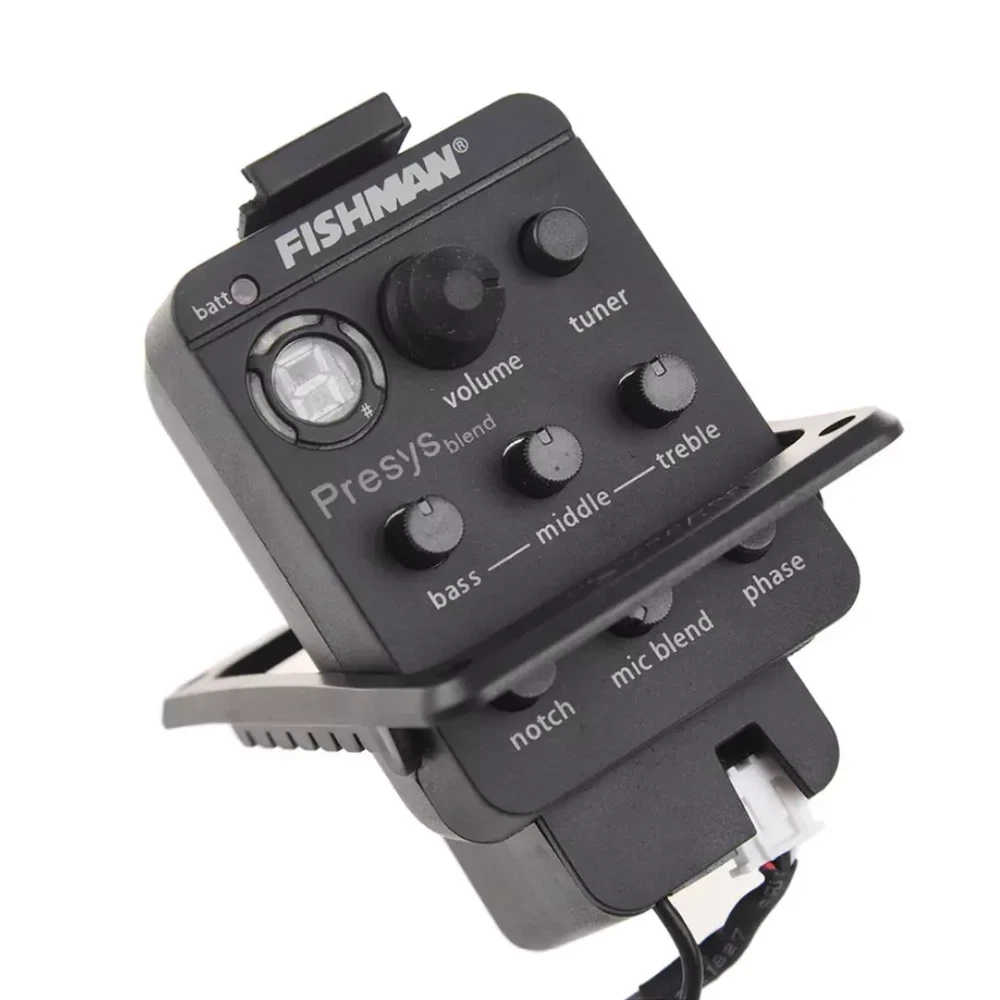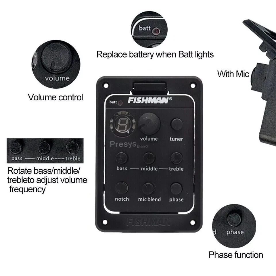 Fishman 301 Presys Piezo Pickup Mic Blend Dual Model Preamp Tuner For Guitar This Fishman 301 Presys Piezo Pickup Mic Blend Dual Model Preamp Tuner is a top-of-the-line unit for guitar enthusiasts. It features a high-quality piezo pickup system that ensures superior sound quality. The active/passive unit is designed to provide the user with a wide range of sounds, making it ideal for any musical genre. The unit is available in black color and comes with a bridge position. It is a unit type that is perfect for those looking for a versatile and reliable piezo pickup system. With its dual model preamp tuner, this Fishman 301 Presys Piezo Pickup Mic Blend Dual Model Preamp Tuner is a must-have for any guitar player who wants to take their music to the next level. 2.20" W x 3.3" L x 1.625" D (55.8mm x 84.2mm x 41.3mm) Hole size: 2.0" W x 2.662" L (50.8mm x 67.62mm) Screw spacing: 1.785" W x 2.795" L (45.34mm x 71mm) Package size: 24 x 16 x 5.2cm / 9.4 x 6.3 x 2inch Package weight: 117g / 4.1oz Features: 4-band equalizer, rotate bass/middle/treble to adjust volume frequency. With phase and tuner function. Tone and volume control. LED for battery check, replace battery when Batt lights. Built-in microphone with mic blend level control. Unique pivot design for instant 9-Volt battery access. Powered by a 9V battery (not included). Package List: 1set * 301 guitar pickups