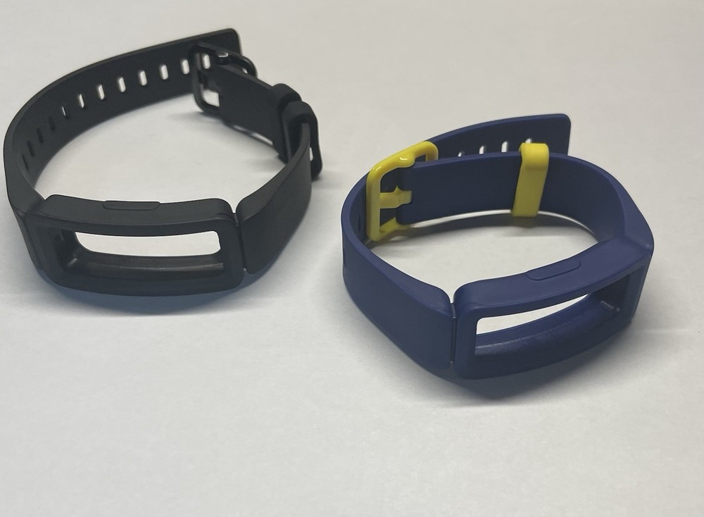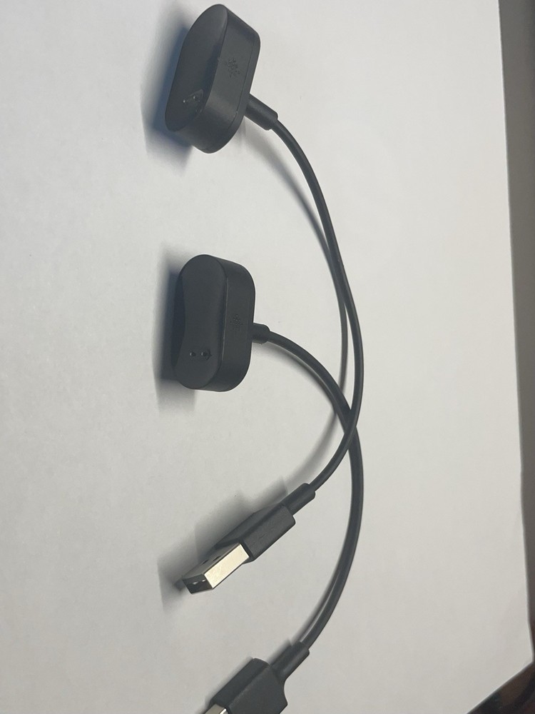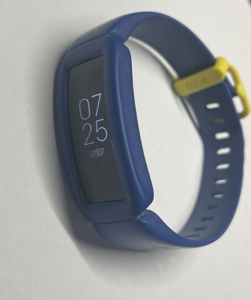 The product is a used Fitbit Ace 2 fitness tracker designed for kids, featuring 3 different bands in blue silicone material and two chargers. The case of the device is black silicone, with a 20mm case size. Compatible with both iOS and Android operating systems, this Fitbit Ace 2 provides fitness tracking features for children to monitor their daily activities and stay active. It does have a couple of scratches on the screen, but it holds a multiple day charge. The set up instructions are not included.