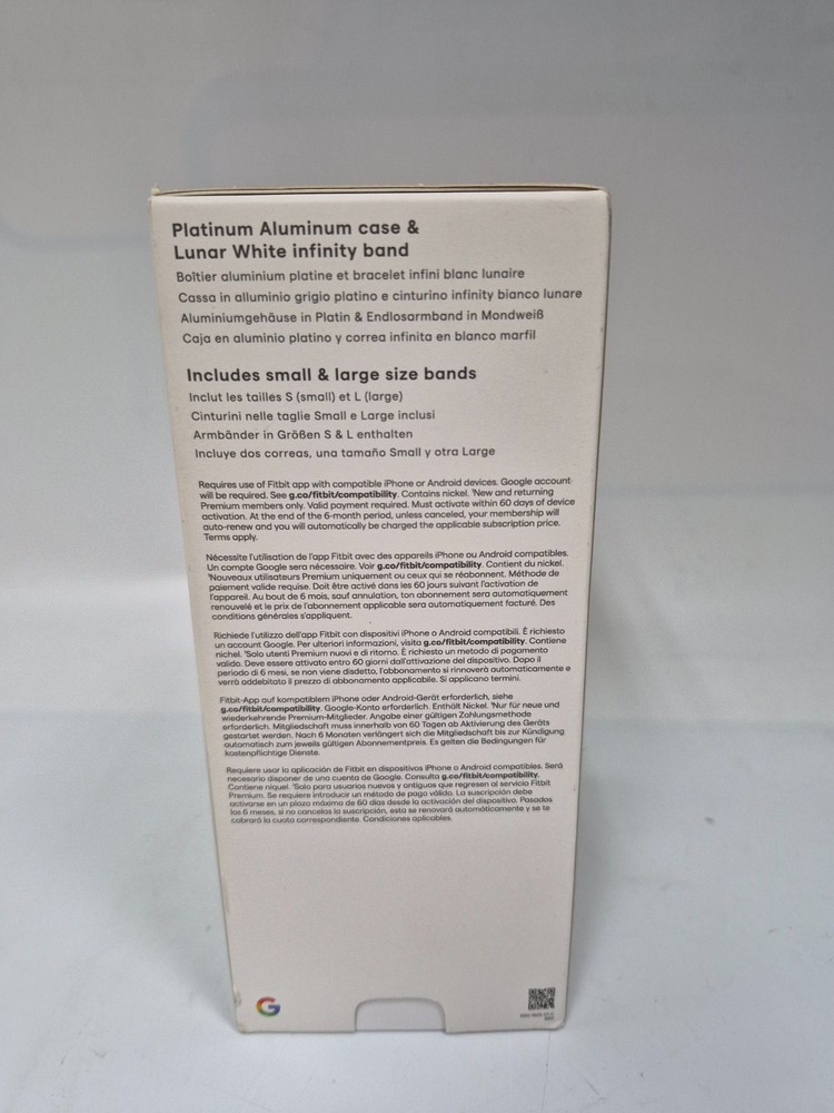 Brand: Fitbit (by Google) Model: Sense 2 Health + Fitness Smartwatch Condition: New, in original open box (As shown in unboxing picture). Color/Finish: Platinum Aluminum Case with a Lunar White Infinity Band. Included Bands: Comes with both Small (S) and Large (L) infinity bands. Key Features: ●Advanced Health Tracking: Includes an ECG app for heart rhythm assessment and a cEDA sensor for all-day stress tracking. ●Built-in GPS: Track your pace and distance during outdoor runs or rides without your phone. ●6+ Day Battery Life: Spend more time moving and less time charging. ●Essential Apps: Works with Google Maps, Google Wallet, and receives all smartphone notifications. Compatibility: Requires the Fitbit app and is compatible with iPhone and Android devices. Band Size: Uses a standard 24mm attachment size. What's Included in the Box: 1)Fitbit Sense 2 Smartwatch (Platinum Aluminum Case / Lunar White Band, protected by gray covering) 2)Small (S) and Large (L) Infinity Bands (Lunar White) 3)Charging Cable. Compatibility Note Requires use of Fitbit app with compatible iPhone or Android devices. Google account required. "The item is new/open-box, but please note the outer packaging has significant cosmetic wear. This includes a notable dent on the bottom right corner, edge scuffs, and sticker residue/torn paper on the front and top from inventory labels (see photos). The internal contents are unaffected and remain in pristine, original condition."