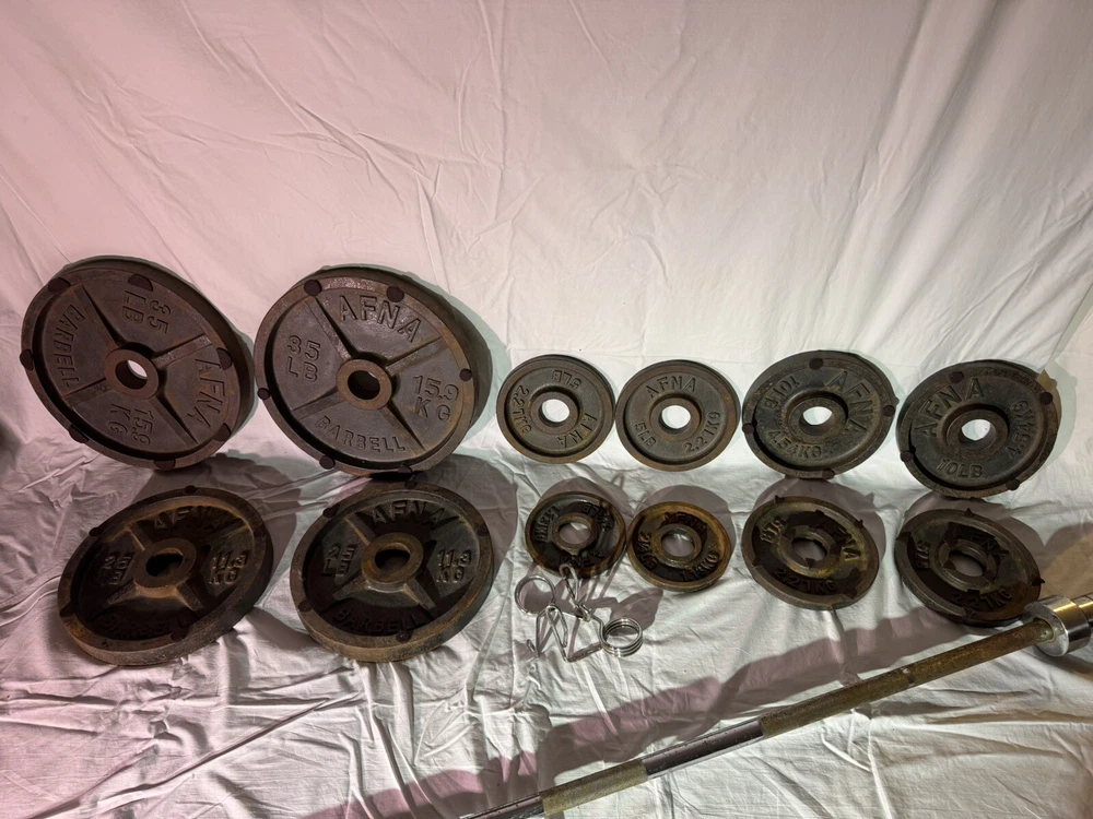 Has some rust comes with 2 clamps and weights as shown Elevate your weight lifting game with this Fitness Gear 200lbs Olympic Weight Set. Crafted from high-quality cast iron material, this weight set is designed to last for years to come. The set includes weight plates that are perfect for both beginners and experienced lifters. The Fitness Gear OS3002 model is an ideal addition to your home gym equipment. With a weight of 200lbs, this weight set is perfect for strength training and weight lifting. The set comes in a sleek design and is perfect for those who are looking to take their fitness routine to the next level.