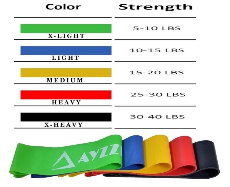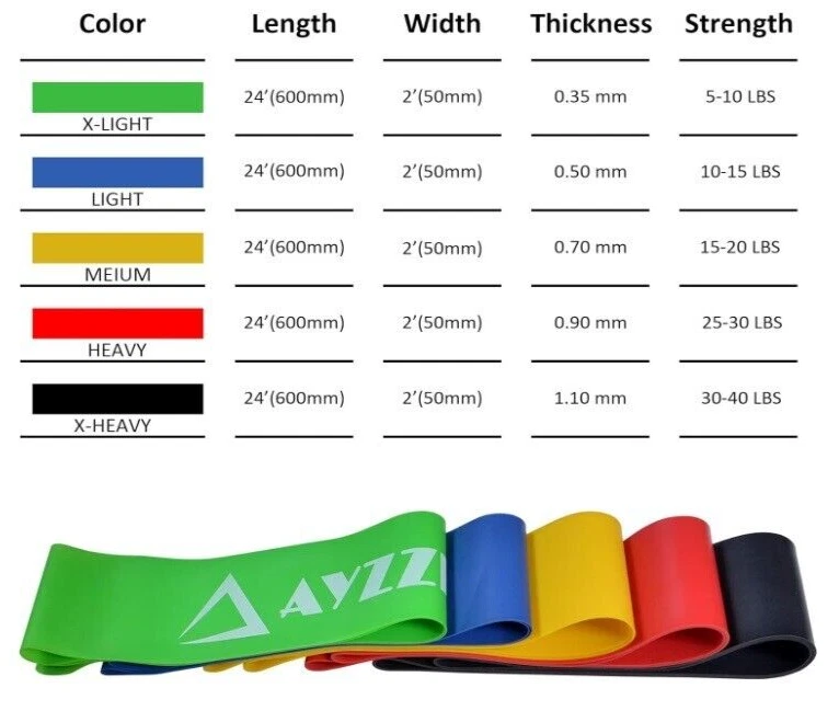 Item Dimensions L x W x H: 24 x 2 x 0.08 inches Material: Elastic, Natural Rubber Color: Assorted Item Height: 1.81 Suggested Users: Unisex Type: Resistance Band Sport/Activity: Gym & Training Item Length: 7.87 Recommended Uses For Product: Physical Fitness, Workout Included Components: 5 Bands, Exercise Guide Book, 1 carry bag gtin13: 741813727905 Number of Items: 5 Package Weight: 0.12 Kilograms Style: Exercise Band Muscle Group: Arms, Full Body, Legs Item Package Dimension L x W x H: 7.87 x 4.33 x 1.81 inches Number of Resistance Levels: 5 Sport: Exercise and Fitness UPC: 741813727905 Features: Non-Slip Usage: Home Use Tension Level: 05-40 Pounds Brand: AYZZEL