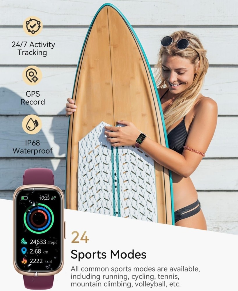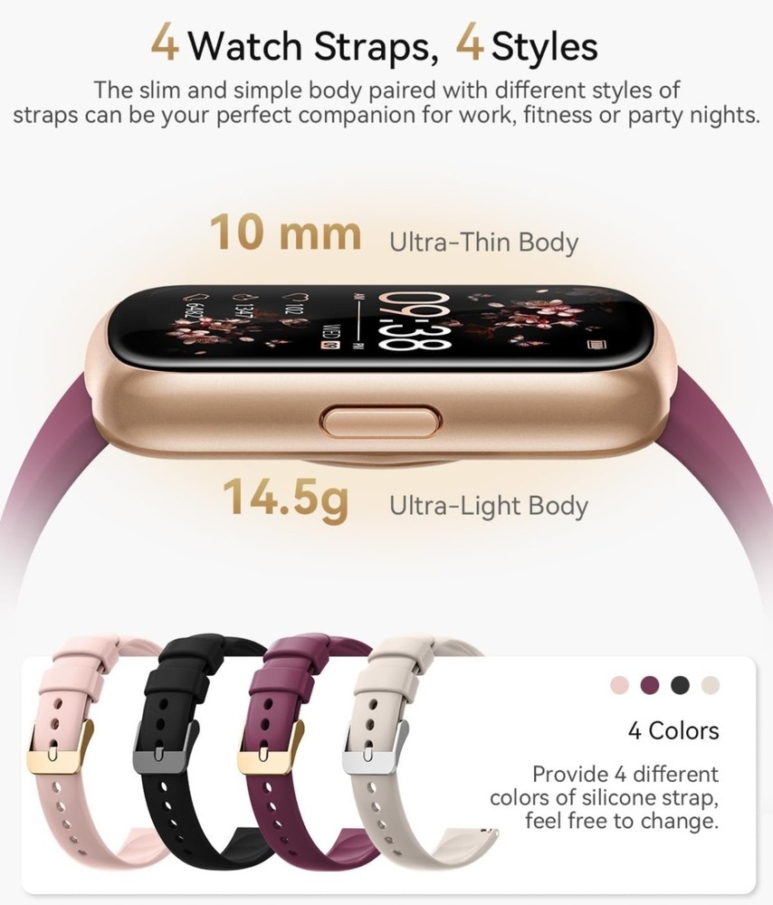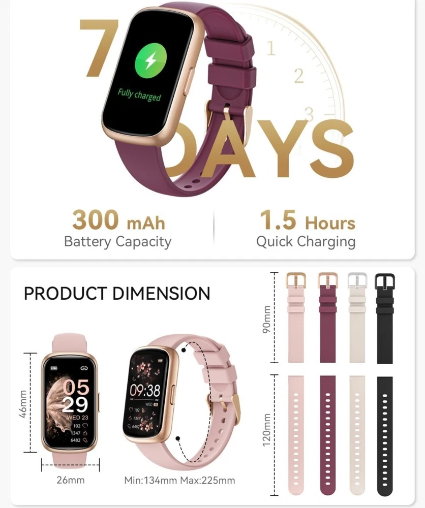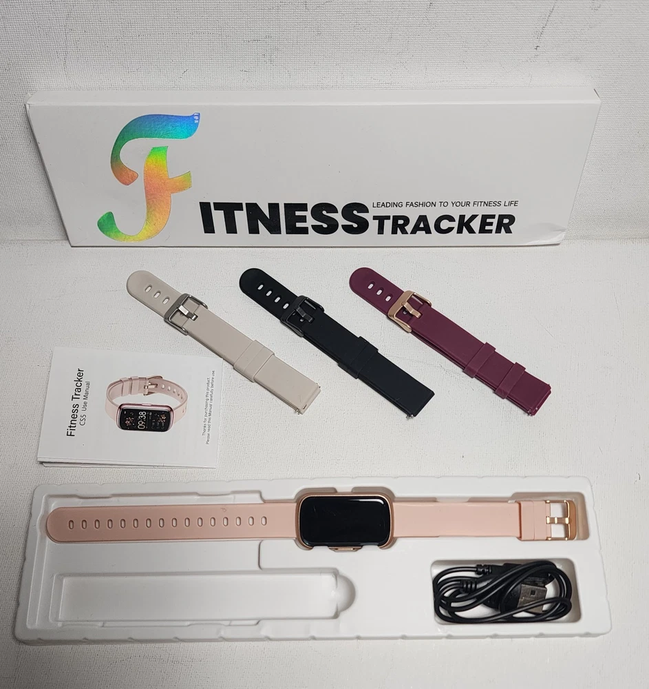 Condition: Open box. Very small scratch i tried to get a good picture of it. Last picture, upper left corner, hardly noticeable Fitness Tracker, Fitness Tracker Watches for Women with Heart Rate/Blood Oxygen/Sleep Monitor, 20+ Sports Modes Smart Watches for Women/Men, Activity & Step Tracker Smart Watch for Android/iOS Phones 【4 Colors, 4 Watch Bands】RUXINGX fitness tracker for women comes with 4 bands - A burgundy silicone strap, A black silicone strap, A starlight silicone strap and A pink silicone strap. Wear different colors of the strap to switch between different styles. Lightweight and skin-friendly strap is more suitable for daily and sports wear. 【24/7 Health Fitness Tracker】The fitness watch can measure your heart rate, blood oxygen in real time for 24 hours (Can't Measure Blood Pressure). Accurately track sleep status including: deep sleep/light sleep/awake and generate targeted reports for your review. The smart watch adds a function for women to record their menstrual cycle to help them pay more attention to their health. In addition, the breathing training, drinking reminder, sedentary reminder functions will help you develop good living habits. 【Activity Tracker with Multiple Sports Modes】The fitness tracker watch has 24 sports modes such as walking, running, basketball, football etc., covering almost all daily sports types. The sports watch is able to record the whole process with real-time updates of steps, heart rate, calories burned, and distance. You can choose your favorite exercise mode and set custom exercise goals. When pedometer is connected to your phone, you are able to clearly view your exercise tracks and maps. 【Smart watch for iPhones/Android Phones】The smart watch for women/men are widely adapted with iphones and android phones. Smartwatch is able to receive text messages, notifications, and call reminders without delay, it ensures that you don't miss any important messages and reminders. Note: The watch supports viewing the full content of messages, but does not support replying to messages and making calls. 【1.47" UHD Screen and 200+ Watch Dial】The heart rate monitor watch uses an HD screen with increased screen resolution and screen-to-body ratio. Clear data presentation and light body weight provide you with a comfortable wearing feeling. And with more than 200 dial designs built-in APP and constantly updated, you can choose your favorite dial at will. In addition, the watch supports custom dials. You can upload your favorite photo. 【Fitness Watch with 300mAh Battery】Fitness tracker has a built-in high-capacity battery that extends standby time and usage time. Please don't worry about the rapid depletion of watch power when you are outdoor sports or party. Meanwhile, it only takes 2-3 hours for the watch to be fully charged.
