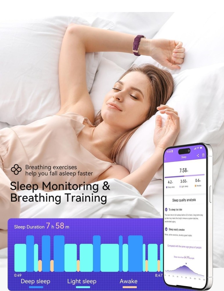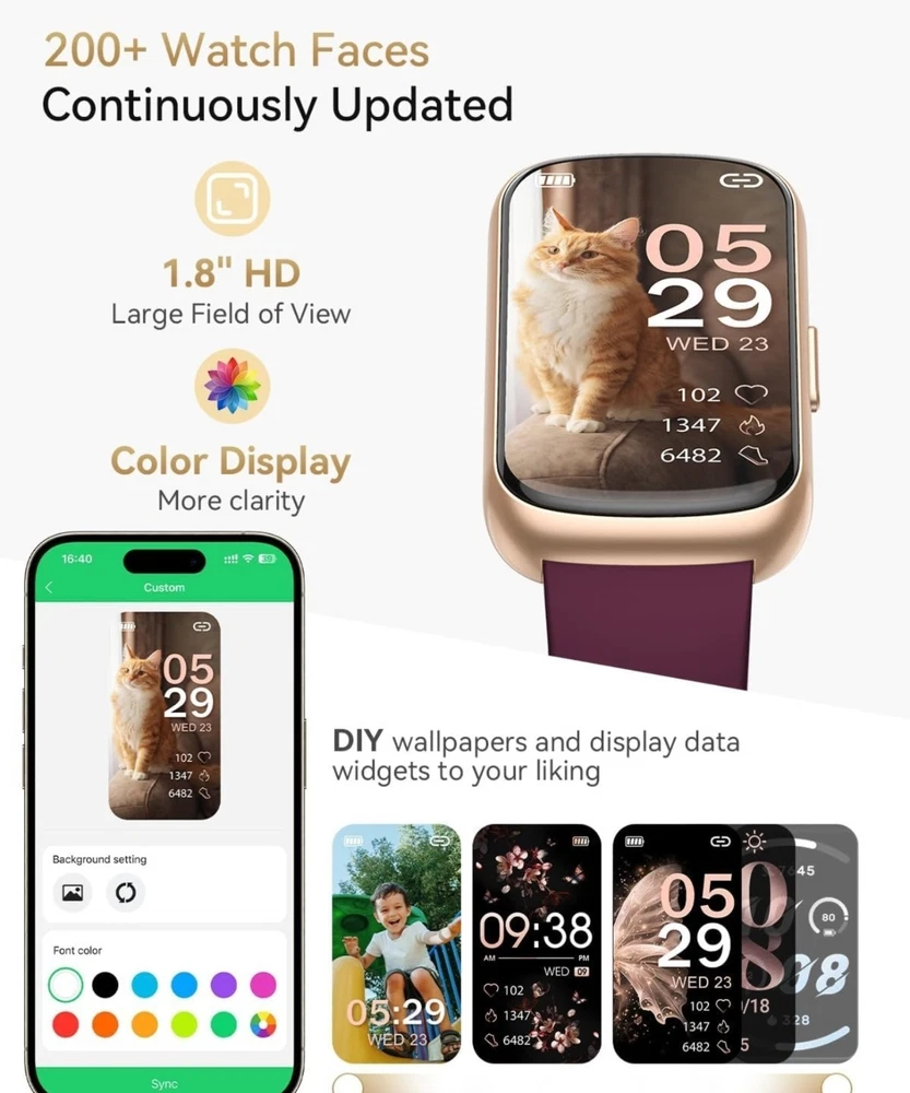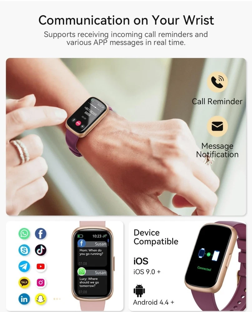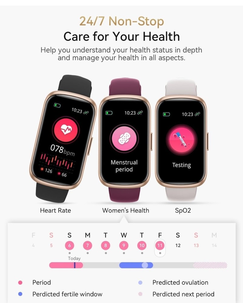Condition: Open box. Very small scratch i tried to get a good picture of it. Last picture, upper left corner, hardly noticeable Fitness Tracker, Fitness Tracker Watches for Women with Heart Rate/Blood Oxygen/Sleep Monitor, 20+ Sports Modes Smart Watches for Women/Men, Activity & Step Tracker Smart Watch for Android/iOS Phones 【4 Colors, 4 Watch Bands】RUXINGX fitness tracker for women comes with 4 bands - A burgundy silicone strap, A black silicone strap, A starlight silicone strap and A pink silicone strap. Wear different colors of the strap to switch between different styles. Lightweight and skin-friendly strap is more suitable for daily and sports wear. 【24/7 Health Fitness Tracker】The fitness watch can measure your heart rate, blood oxygen in real time for 24 hours (Can't Measure Blood Pressure). Accurately track sleep status including: deep sleep/light sleep/awake and generate targeted reports for your review. The smart watch adds a function for women to record their menstrual cycle to help them pay more attention to their health. In addition, the breathing training, drinking reminder, sedentary reminder functions will help you develop good living habits. 【Activity Tracker with Multiple Sports Modes】The fitness tracker watch has 24 sports modes such as walking, running, basketball, football etc., covering almost all daily sports types. The sports watch is able to record the whole process with real-time updates of steps, heart rate, calories burned, and distance. You can choose your favorite exercise mode and set custom exercise goals. When pedometer is connected to your phone, you are able to clearly view your exercise tracks and maps. 【Smart watch for iPhones/Android Phones】The smart watch for women/men are widely adapted with iphones and android phones. Smartwatch is able to receive text messages, notifications, and call reminders without delay, it ensures that you don't miss any important messages and reminders. Note: The watch supports viewing the full content of messages, but does not support replying to messages and making calls. 【1.47" UHD Screen and 200+ Watch Dial】The heart rate monitor watch uses an HD screen with increased screen resolution and screen-to-body ratio. Clear data presentation and light body weight provide you with a comfortable wearing feeling. And with more than 200 dial designs built-in APP and constantly updated, you can choose your favorite dial at will. In addition, the watch supports custom dials. You can upload your favorite photo. 【Fitness Watch with 300mAh Battery】Fitness tracker has a built-in high-capacity battery that extends standby time and usage time. Please don't worry about the rapid depletion of watch power when you are outdoor sports or party. Meanwhile, it only takes 2-3 hours for the watch to be fully charged.