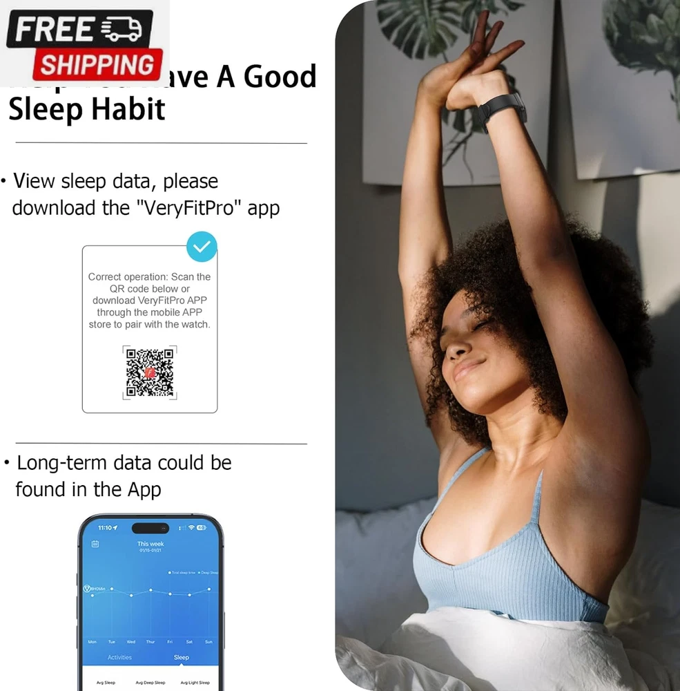 Fitness Tracker, Smart Watch for Men Women, Activity Fitness Watch with Heart Rate Monitor, Pedometer, Sleep Monitor, 50 Meters Waterproof Step Tracker Compatible with Ios & Android Phones 【Your Excellent Daily Assistant】 With its 1.3-inch TFT-LCD full-touch screen. It offering crucial features like sleep monitoring, sports recording, menstrual health tracking, relaxation guidance, alarms, timers, and more, it's your health aide. 【24/7 Heart Rate Monitoring & Sleep Tracking】 Keep track of your real-time heart rate throughout the day and effortlessly monitor your sleep patterns (Deep sleep, Light sleep, and Awake time). This feature offers valuable insights into the duration and quality of your sleep, assisting you in making lifestyle adjustments for an improved state of well-being. 【Long-lasting Battery Life & 50 Meters Waterproof】Smart Watches feature a 50 Meters waterproof rating, meet your daily needs and swimming needs. The smart integration of a large-capacity battery and low power consumption ensures extended endurance. Offering up to 7 days of regular use and an impressive standby time of 35 days, this smartwatch provides both reliability and convenience. 【Multiple movement modes】 This fitness tracker boasts Multiple sports modes. It accurately tracks and records your entire day's activities, keeping tabs on steps taken, calories burned, distance covered, active minutes, and more, meet your daily needs 【Compatible with Android & iOS】This smartwatch is compatible with iOS 8.0+ and Android 4.4+ (Designed for use with smartphones only; not intended for PC, iPad, or Tablet use). Easily link up by downloading "VeryFitPro" app, pairing it with your cellphone, and receive timely alerts for calendar events, SMS, calls, and SNS notifications (Facebook, Twitter, Whatsapp, Skype, Snapchat, etc.). Product Description 8 Sports Modes with GPS Enabled Turn on the GPS through the APP to meet your need to record the movement route Your Intelligent Assistant Heart Rate Monitor: 24h continuous heart rate monitoring Blood Oxygen Monitor: Know your exercise intensity Women's Health Tracking: track menstrual time and menstrual reminder Breath Training: Improve lung function, prevent respiratory diseases Music Control: Easily enjoy music switching during exercise Alarm Clock: Remind you of your important agenda Blood pressure: Monitor your blood pressure (not for medical data) Shipping Fast shipping is very important for us. Our standard US shipping service is FREE. Your order will be shipped within 2-3 business days upon full payment received. Your order will be delivered within 2-3 business days after the handling time. We only ship to the confirmed PayPal address. We reserve the right to cancel any order for any reason at any time. We are not responsible for undeliverable addresses. Returns and payment We offer a 30 days return policy from checkout winning date. We allow only PayPal as payment method FeedBack Your feedback very important to us, after you get your package and you are satisfied with our service please leave us positive feedback If you have any problem with your order / any questions please before leave any type of feedback For any questions, using eBay contact system Please visit our eBay store to check out other items for sale! Thank you for shopping at our store.