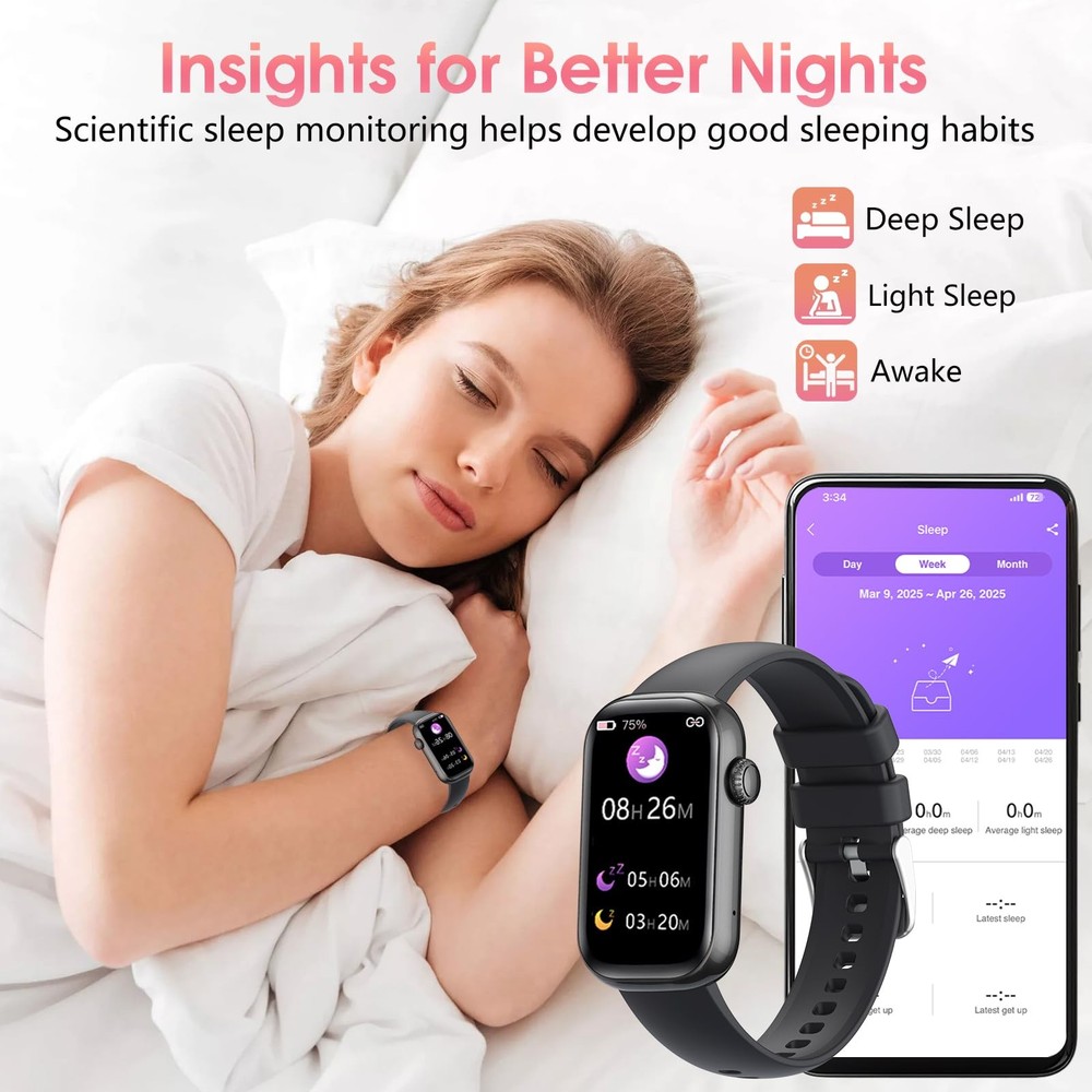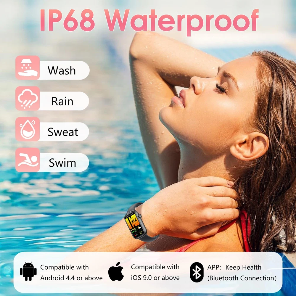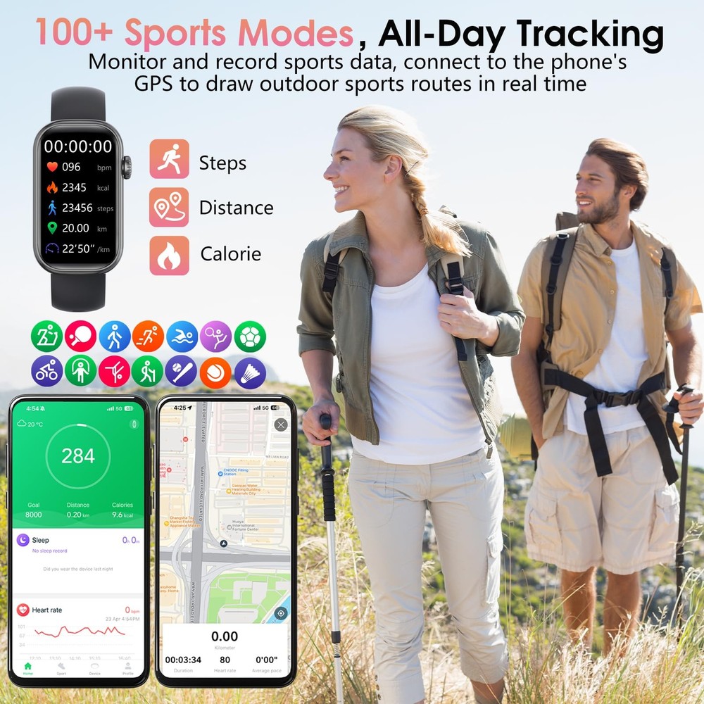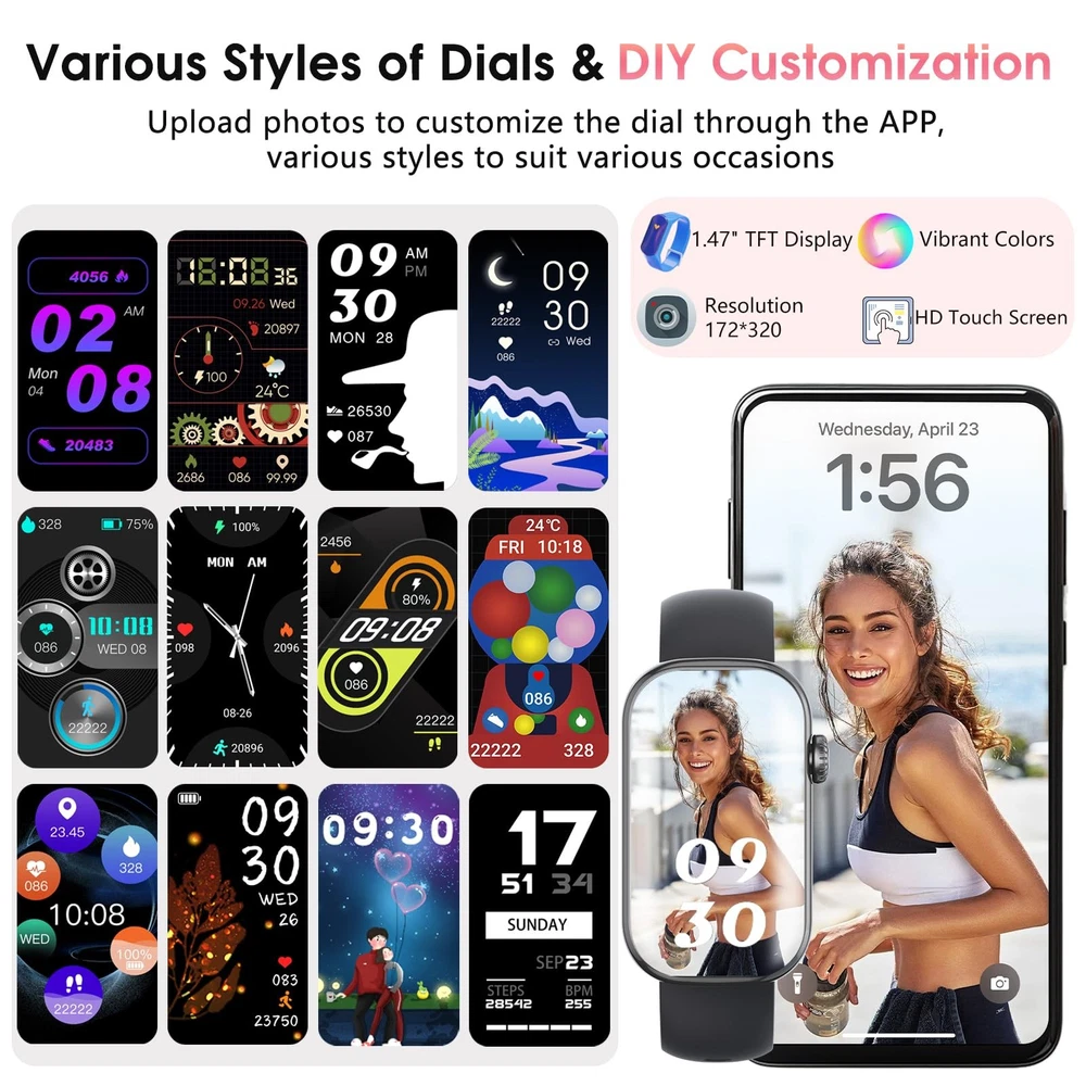 Product Specifications: Product Name: Fitness Tracker Smart Watch Screen Size: 1.47'' Waterproof Level: IP68 Case Material: ABS + PC (oil injection) Strap Material: Silicone Buckle Material: 304 Stainless Steel Watch Size (L x W x H): 45.6 * 26.4 * 10.8mm Strap Size (Long): 16 * 125 mm Strap Size (Short): 16 * 76mm Touch Screen Mode: Full Screen Touch APP: Glory Fit Compatible: Android 4.4 and above, iOS 9.0 and above 24/7 Health Indicator Monitoring: Fitness tracker uses high-precision sensors to monitor dynamic heart rate, blood oxygen saturation and sleep stages (deep sleep, light sleep, awake) in real time around the clock; records long-term data through the Glory Fit App to help control health conditions; unique female health design to record women's physiological cycles (menstrual period, ovulation period, safe period); suitable for fitness enthusiasts or people concerned about chronic health problems 100+ Sports Modes & GPS Connectivity: Step counter watch supports more than 100 different sports modes, such as running, cycling, yoga, basketball, swimming, etc.; connect to the mobile phone GPS to map the outdoor running, cycling or hiking routes in real time; accurately record calories, steps and distance, fully adapt to various sports needs; breathing training helps to relax the body and mind after exercise; sports enthusiasts can adjust training strategies to quickly achieve fitness goals 1.47" HD Touch Screen & Custom Dial: Smart watch uses a 1.47" HD full touch screen with high color saturation and a curved frame, simple and stylish; the dial function interface design is clear and concise; supports uploading photos to customize the dial on the APP, easily switches between business, sports or leisure styles, adapting to multiple scenes such as office, leisure, fitness, outdoor sports, etc., to create a personalized device Smart Notifications & Voice Assistant: Health tracker watch for women and men has built-in AAC audio technology, can make or receive calls on wrist after connecting to Bluetooth; receive messages, emails, and notifications from social media apps such as WhatsApp, Instagram, and Facebook to avoid missing important messages during meetings, sports, or commuting; equipped with a smart voice assistant, can be controlled by voice commands, is convenient to use Multi-function & IP68 Waterproof: Activity tracker provides a variety of practical functions, such as music control, sedentary reminder, brightness adjustment, weather, alarm clock, wrist flip screen, back hand screen off, do not disturb mode, remote photo taking, mobile phone search, countdown, stopwatch, to help efficient life; IP68 waterproof design can safely wash the strap, fearless swimming, rain and sweat, rainy running, pool training or outdoor hiking can be worn with confidence Ultra-Long Battery Life & Compatibility: Fitness tracker watch uses magnetic fast charging, after charging for 2 hours, can support 5-7 days of normal use or about 20 days of standby, no frequent charging is required, suitable for travel, camping or busy schedules; compatible with Android 4.4 or higher and iOS 9.0 or higher; ABS + PC material watch frame with skin-friendly silicone strap, lightweight design, comfortable to wear