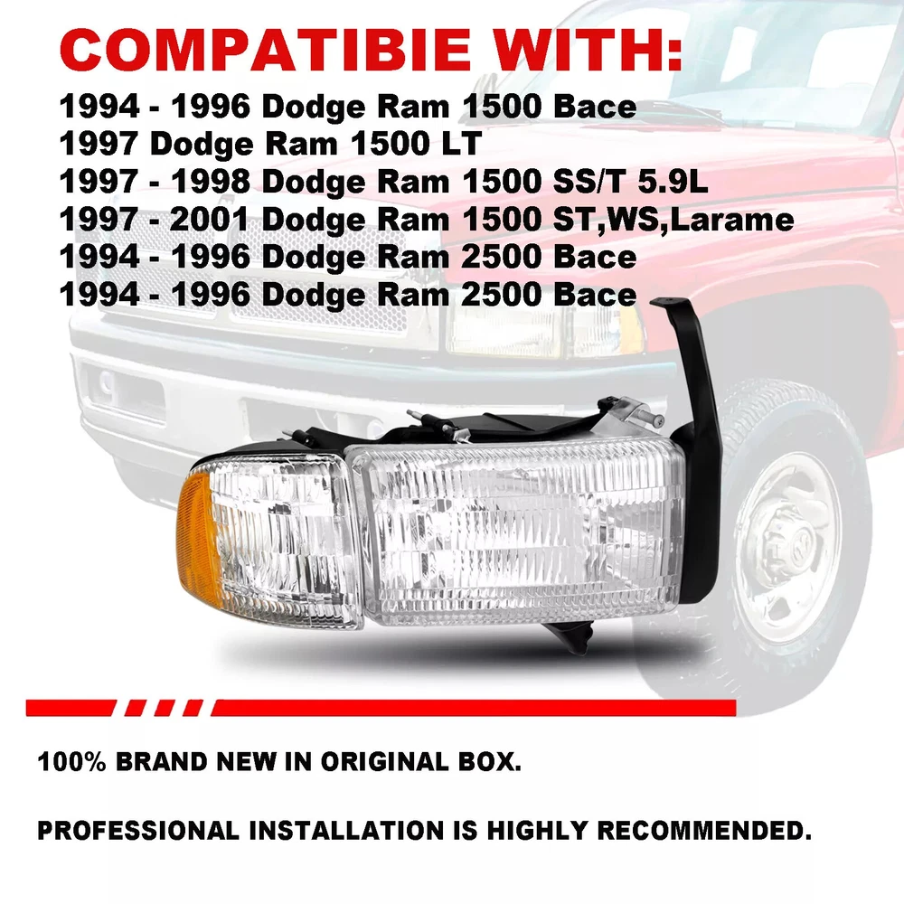 Fitment: 1994-1996 Dodge Ram 1500Base 1997 Dodge 1500LT 1997-1998 Dodge Ram 1500 SS/T 5.9L 1997-2001 Dodge 1500 ST/WS/Laramie 1994-2001 Dodge Ram 2500 Base 1994-2001 Dodge Ram 3500 Base Not Fit Sport Models & Ram Van Models Package Include: A Pair of Headlights Assembly(Bulbs are Included)