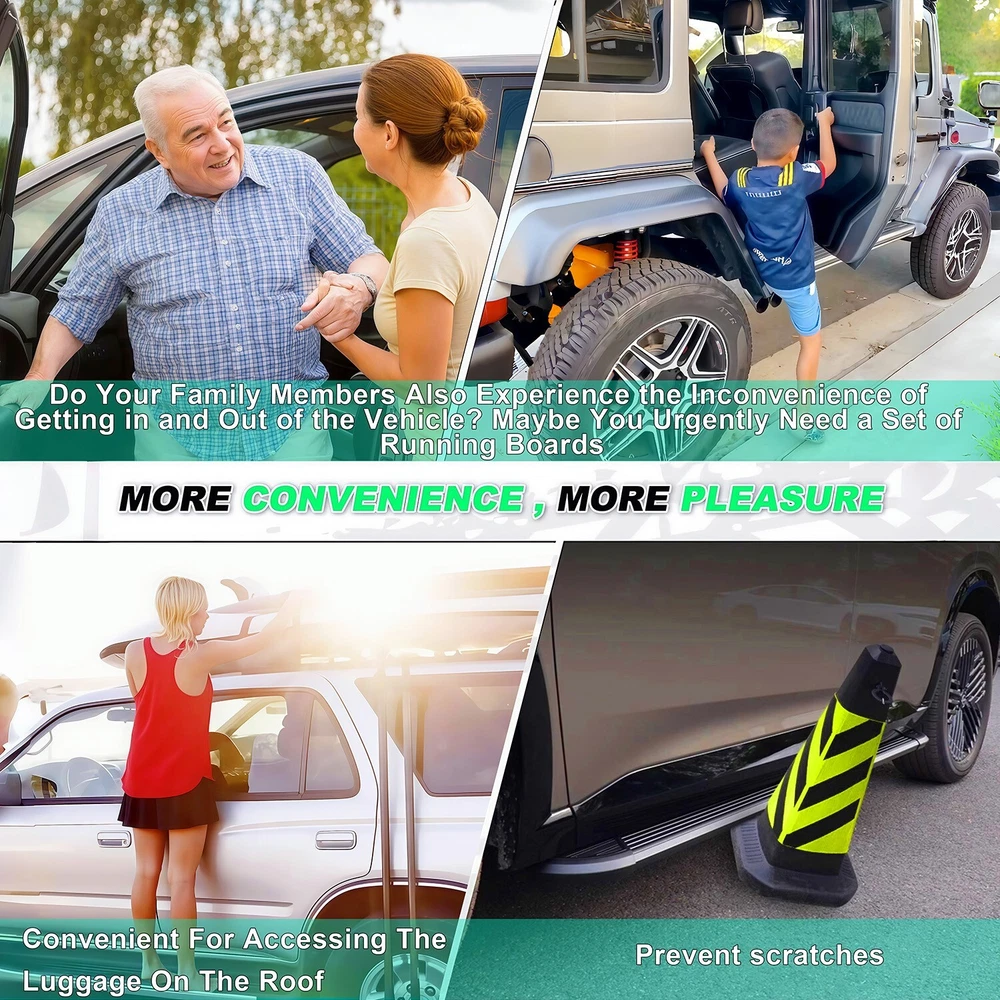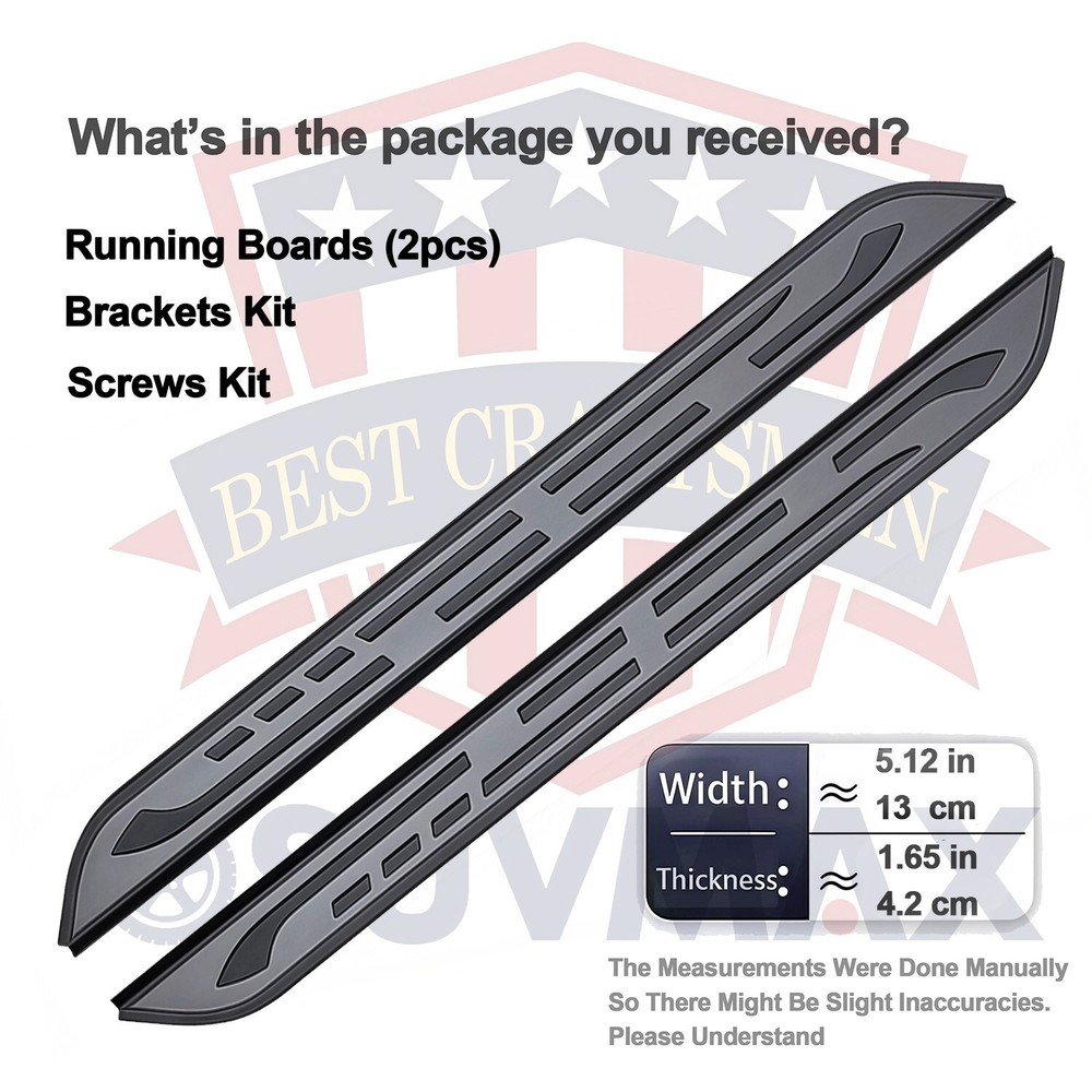 Running Boards Fits For Infiniti QX60 2022 2023 2024 2025 Side Step Nerf Bar Footboard Aluminum+ABS plastics ( 2pcs ) ★★★★★ EASY TO INSTAll: installation is a breeze with this direct bolt-on design, eliminating the need for driling. Each bar is capable of supporting up to 450lbs~500lbs MATERIAL AND COLOR: These Running Boards, Top-Quality Aluminum Alloy + ABS Plastic. Approximately 4.8 Inches (12cm) Wide And Approximately 1.4 Inches (3.5cm) Thick,The side steps Are Equipped With Black Granular Decorations, Which Also Serve As Anti-slip Devices , Offering A Stylish Design That Enhances Vehicle Aesthetics While Providing Safe And Easy Access. WHAT YOU WILL RECEIVE: 1.Running Boards(2PCS) 2.Bracket Kit 3.Screw Kit 4.A Detailed Installation Manual IT’S THE PERFECT FUNCTIONAL UPGRADE ACCESSORIES: The Side Steps Offer A Safe And Comfortable Stepping Surface For The Whole Family To Get In And Out Of The Vehicle. They Also Make It Easier To Load Luggage Onto The Roof Rack And Keep The Roof Clean