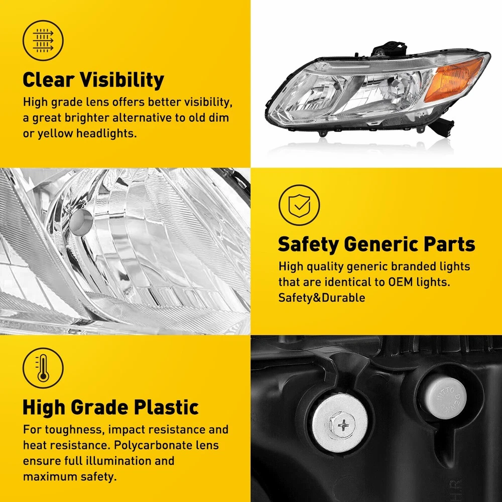 Fit for: 2012-2015 Honda Civic 4Dr Sedan 2012-2013 Honda Civic 2Dr Coupe Specifications: OE number: 33150TR0A01,33400TR0A01,33150TR2A01,331400TR2A01 HO2502144, HO2503144, HO2502150, HO2503150 Material: ABS+PC (ABS Plastic Housing/Polycarbonate lens) Appearance color: 1.Housing Color:Chrome 2.Lens Color:Clear 3.Reflector Color:Amber Note: Projector ×(Not Include) DRL × (Not include) Bulb × (Not include) Features: *Easy to install: Direct replacement, drilling and cutting are not required. Fits Honda Civic 2012-2015 Replacement Headlights Assembly Pair Set Amber Lens Fit for: 2012-2015 Honda Civic 4Dr Sedan 2012-2013 Honda Civic 2Dr Coupe Specifications: OE number: 33150TR0A01,33400TR0A01,33150TR2A01,331400TR2A01 HO2502144, HO2503144, HO2502150, HO2503150 Material: ABS+PC (ABS Plastic Housing/Polycarbonate lens) Appearance color: 1.Housing Color:Chrome 2.Lens Color:Clear 3.Reflector Color:Amber Note: Projector ×(Not Include) DRL × (Not include) Bulb × (Not include) Features: *Easy to install: Direct replacement, drilling and cutting are not required. *Superior quality: Made of ABS and PC materials with toughness and heat resistance functions to ensure its long service life and durability. *Angle adjustment: Equipped with a headlamp Angle adjustment knob, you can adjust the best Angle of view through the knob. *Suggestion: 1.Please confirm the OE number before purchasing!!! 2.Professional installation is required!!! Packaging include: Headlights*2(Left+Right) Item Specifics Brand AUXITO Lighting Technology Halogen Type Headlight Assembly Features Reflector Housing, SAE-Certified, Sealed Assembly Housing Color Chrome Placement on Vehicle Front Left,Right Light Color No Bulb Lens Color Clear Reflector Color Amber Manufacturer Part Number HDCV12.00 Color Temperature \ Voltage 12 V Mounting Style Screws Vintage Part Yes Performance Part Yes Manufacturer Warranty 5 Years Universal Fitment No Number of Bulbs 0 Finish Smooth Model For 2012-2015 Honda Civic 4Dr Sedan,2012-2013 2Dr Coupe OE/OEM Part Number 33150TR0A01,33400TR0A01,33150TR2A01,331400TR2A01 Quantity 2 Headlight assembly Packaging include Left & Right Side Headlights Assembly Bulbs Included Not Included Bulb Shape Code Please Use Stock Bulbs Include Projector Not Included Include DRL Not Included Fitment Type Direct Replacement Assembly Type Composite Mounting Hardware Included No Certifications DOT, SAE Dust and Moisture Protection Yes Waterproof Yes Ballast Included No Applicable Regions US Items Included Headlight Assembly Wattage \ Interchange Part Number HO2502144, HO2503144, HO2502150, HO2503150 FAQ ♥ If you have a decoding problem or any other problems, please contact us first, we will help you with it. We will reply you within 24 hours in working days. I'm a new seller, thanks a lot for your trust and convince! I will serve you with all my heart. ♥ Q1: Will this bulb fit my vehicle? A: We can match almost any vehicle to one of our bulb sizes. eBay only lets us include some vehicle fitments per listing, but if your vehicle does not show up on the compatibility table at the top of our listings, welcome you to contact us for free consulation before purchasing a product. Q2: My item has not arrived, what's taking so long? A: Sometimes items take longer than expected, especially if it’s going far or to rural area. Check with your post office to see if your item has been held up. Sometimes Royal Mail will not update a tracking number until it has arrived at its destination. If your item still don't arrive after a few days, let us know so we can double check for you and help solve it asap. Q3: My bulbs won't fit, help! A: Special bulb holder may be required. See if you can take the holder from the stock bulb. If not, let us know. The bulb size may be wrong, double check the item you received with the item you ordered. Do you have an aftermarket lighting housing? These may not be perfectly fitted for aftermarket bulbs and will require some manual modifications. Q4: Neither side lighting up? Both sides flicker, hyper flash, or work inconsistantly. A:Check the light fuses, and then check the ballast plugs to insure correct installation. If this doesn't work, there may be a voltage problem with the vehicle. You probably just need a relay or capacitor. Even though some bulbs are builtin resistors, they may still need a decoder. Payment (1). We gladly accepts payment via PayPal, We will ship your item(s) within 24 hours. (2). Before payment, please keep the consistency of Paypal address and ebay address. (3). Quantity orders are welcome! Returns (1). We offer 60 days free return policy. Please contact us within 60 days from the date you receive your order if you have any issues with the product or want return. Refund will be send after we got your resend package. (2). All returned items should be in the original packaging , return tracking information should be provided . Contact us (1).Negative feedback will not help resolve any problems you have, please contact us via eBay messages before leaving negative feedback , our customer service will make best effort to help you with the issues. (2).We maintain high standards of excellenceand strive for 100% customer satisfaction! Feedback is very important to us. We request that you contact us immediately before you give us neutral or negative feedback, so that we can satisfactorily address your concerns. About us We're professional in car and motorcycle accessories, especially in LED bulbs. We have our own factory and R&D team. Our belief is to sell top quality items that fit your car and serve you with our heart. Anything please feel free to contact us! Our customer service is very responsibility. Come and follow us! DESCRIPTION PAYMENT SHIPPING RETURN POLICY CONTACT US Shop Category Store Home Other Hot Item AUXITO 9012 HIR2 LED Headlight Kit Bulb High/Low Beam White 80000LM Super Bright USD 44.99 2x H7 Super Bright LED Headlight Bulbs 60000LM Kit High Low Beam 6500K White USD 23.74