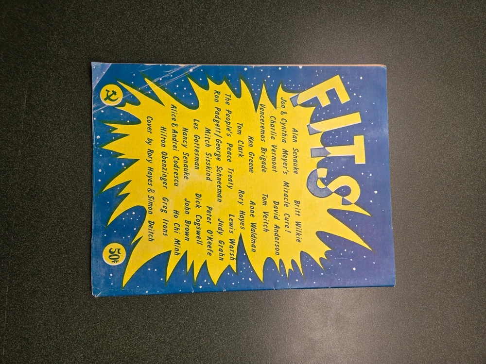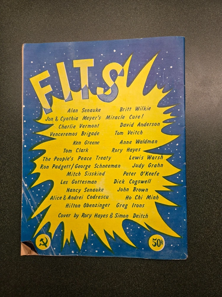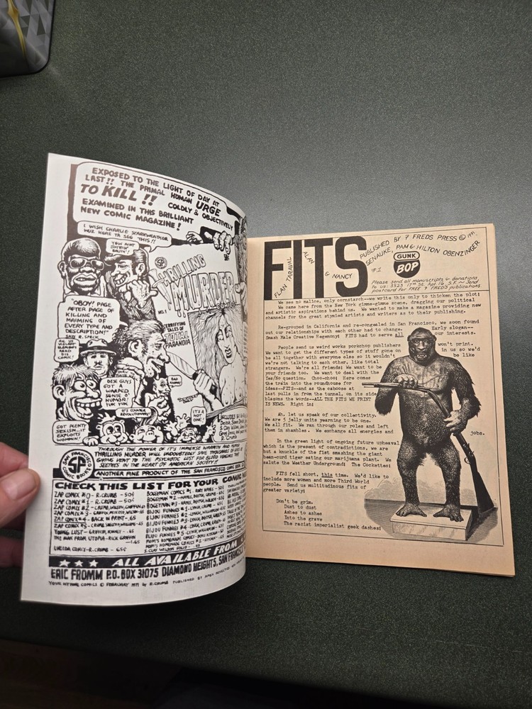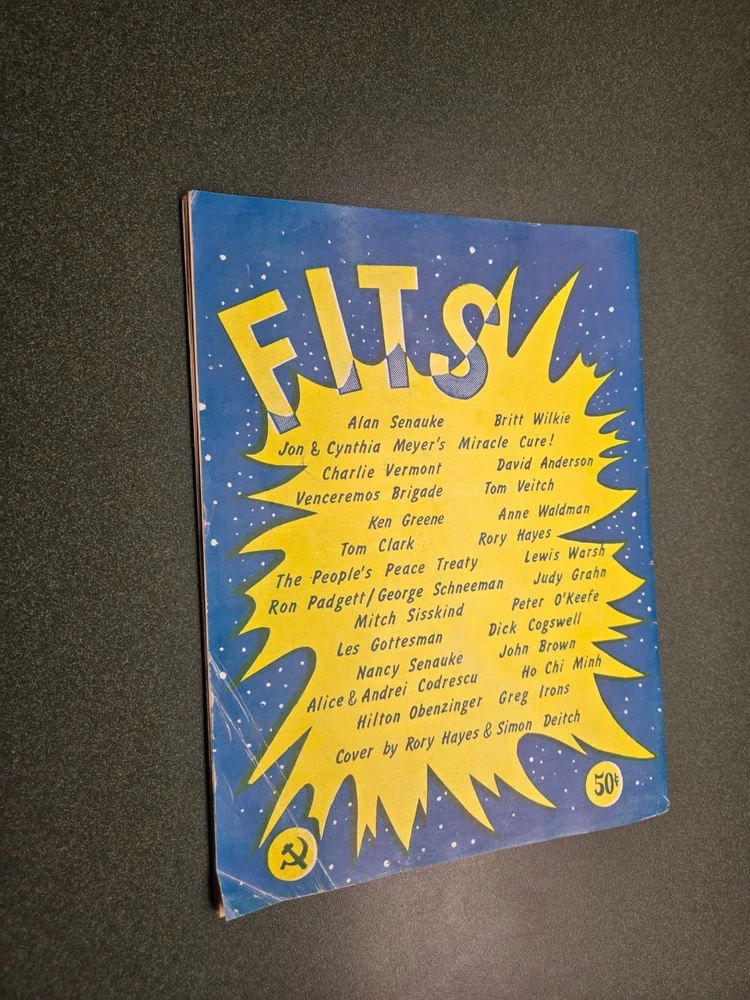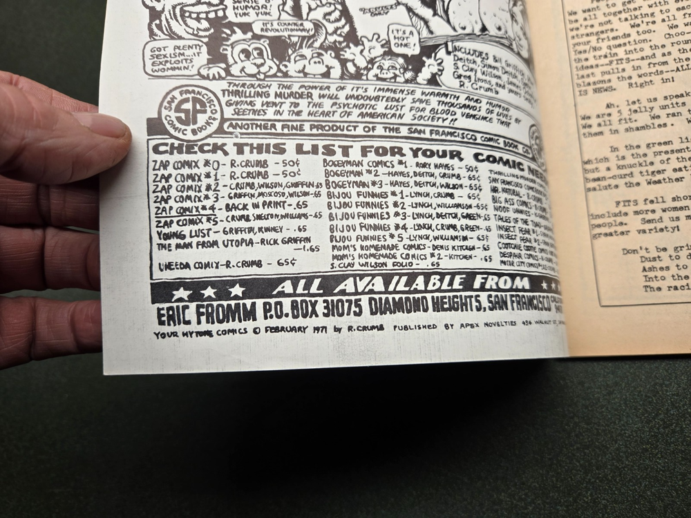 Fits #1 Underground comix Rare Underground comix to find in any condition! Only Printing / 1971 / 60 pages / 7 Freds Press Pages: 60 Publisher: 7 Freds Press Published: 1971 Size: 10 1/8" x 7 7/8" Cover Artist's: Rory Hayes & Simon Detich Cover: Matt color Guts: newsprint black and white This is a read copy but in very good condition for its age! Fits #1 features comic artwork from Greg Irons, Kenneth Green and, of course, Rory Hayes (who produced the cover). The magazine's title is hidden on the third page of the book, which makes it hard for some people to identify the publication by name. Fits was published by five men and women from Columbia University who had moved to San Francisco in 1970 to pursue complete freedom of expression. In its introduction, the publishers commented (with twisted syntax) on the submissions they received from contributors: "People send us weird works porkchop publishers won't print. We want to get the different types of stuff gone on in us so we'd be all together with everyone else so it wouldn't be like we're not talking to each other, like total strangers. We're all friends! We want to be your friends' too." Beyond the comics, highlights from this issue include a cruel yet touching poem about Marilyn Monroe from Judy Grahn; Jon and Cynthia Meyer writing about their marriage, Bell's Palsy and spinal taps; a nonsensical feminist rant by Nancy Senauke; and David Anderson's stream-of-consciousness article about the circus coming to town. Rare underground comix to find in any condition none up for sale and hard to find. Fits is the brainchild of a group of five men and women based in San Francisco; Flan Taraval, Alan and Nancy Senauke, and Pam and Hilton Obenzinger. In their introduction to the first issue: "We came here from the New York gimme-gimme scene, dragging our political and artistic aspirations behind us. We wanted to make a magazine providing new channels for the great stymied artists and writers...." They called themselves the Fits Collective, though 7 Freds Press is credited with publishing the first issue of Fits (the seven Freds, mostly celebrities, are named in issue #2). The two issues of Fits look very different from the outside but their content is quite similar: a broad range of short literary works, poetry, articles and comics. Notable contributors included Rory Hayes, Bill Griffith, Tom Veitch, Spain Rodriguez and Allen Ginsberg, though these contributions were only a few pages each. The objective of the publication was to give many creative people exposure, as evidenced by the list of contributors for each issue. Like Allen Ginsberg, all members of the Fits Collective attended Columbia University in the mid to late '60s and contributed to the school's literary journal, The Columbia Review. Along with Less Gottesman, they published a hardcover book of excerpts from The Columbia Review in 1970. Soon afterwards, the collective moved to San Francisco and began working on a literary magazine that would be unfettered by institutional constrictions (Columbia University once cancelled an entire issue of The Columbia Review because one poem contained the word "shit"). The two issues of Fits are certainly representative of the counterculture of its time, which included anti-war and civil rights protests, freedom of speech and personal expression, feminism and environmentalism. The inclusion of comics from underground comic artists was a natural extension of the belief system of the collective. Though they never published more than two comic magazines (and Fits barely qualifies as that, but because of its comic content it will always be included as an underground), members of the Fits Collective went on to achieve their mark in society. Hilton Obenzinger became an essayist and novelist and currently teaches writing at Stanford University, where he earned his PhD in Modern Thought and Literature in 1997. Alan Senauke became a Buddhist and joined the Berkeley Zen Center in the 1980s, where he is now Vice-Abbott and in line to become the Dharma of the Center. He provided an interesting interview about Buddhism to SweepingZen.com in 2010. Flamed-Out Funnies at Comixjoint.com