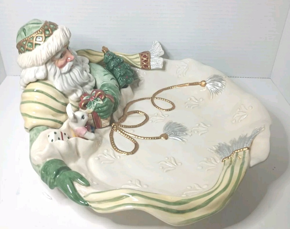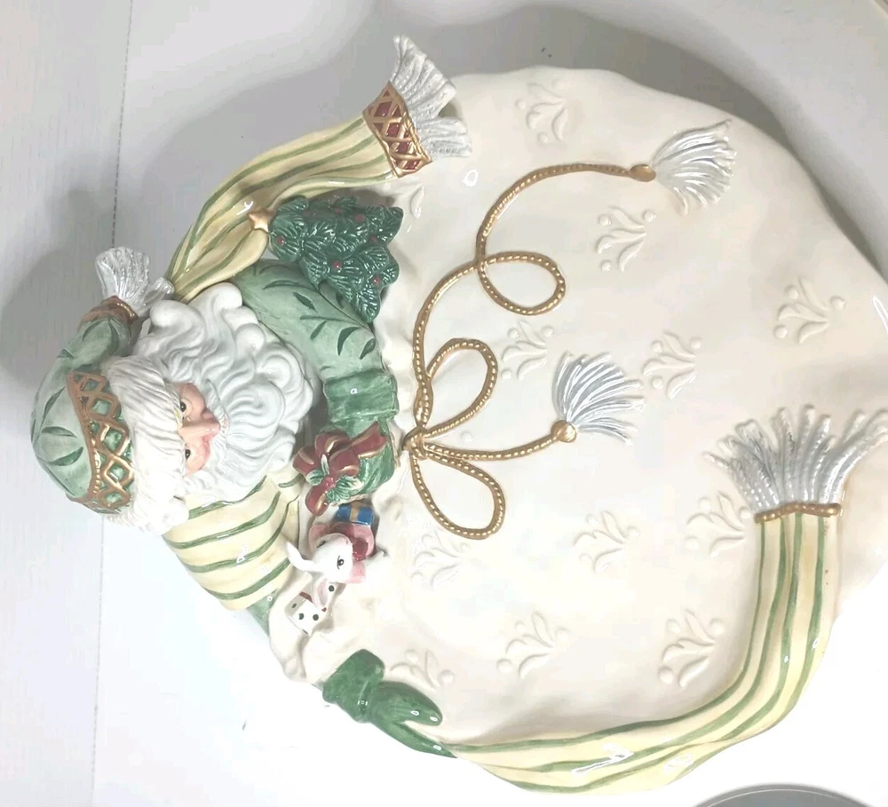 This Fitz and Floyd Gregorian Santa Christmas Classics Centerpiece Serving Platter is a must-have for any holiday collector. The beige color and intricate design make it a beautiful addition to any table setting. Made of ceramic and porcelain, this serving platter is durable and will last for years to come. With a brand name of Fitz & Floyd, you know that this serving platter is of high quality. It was manufactured in China in 1991 and is part of the holiday collectibles category. This item is perfect for those who enjoy collecting unique pieces during the holiday season. Add it to your collection today! In the original box.